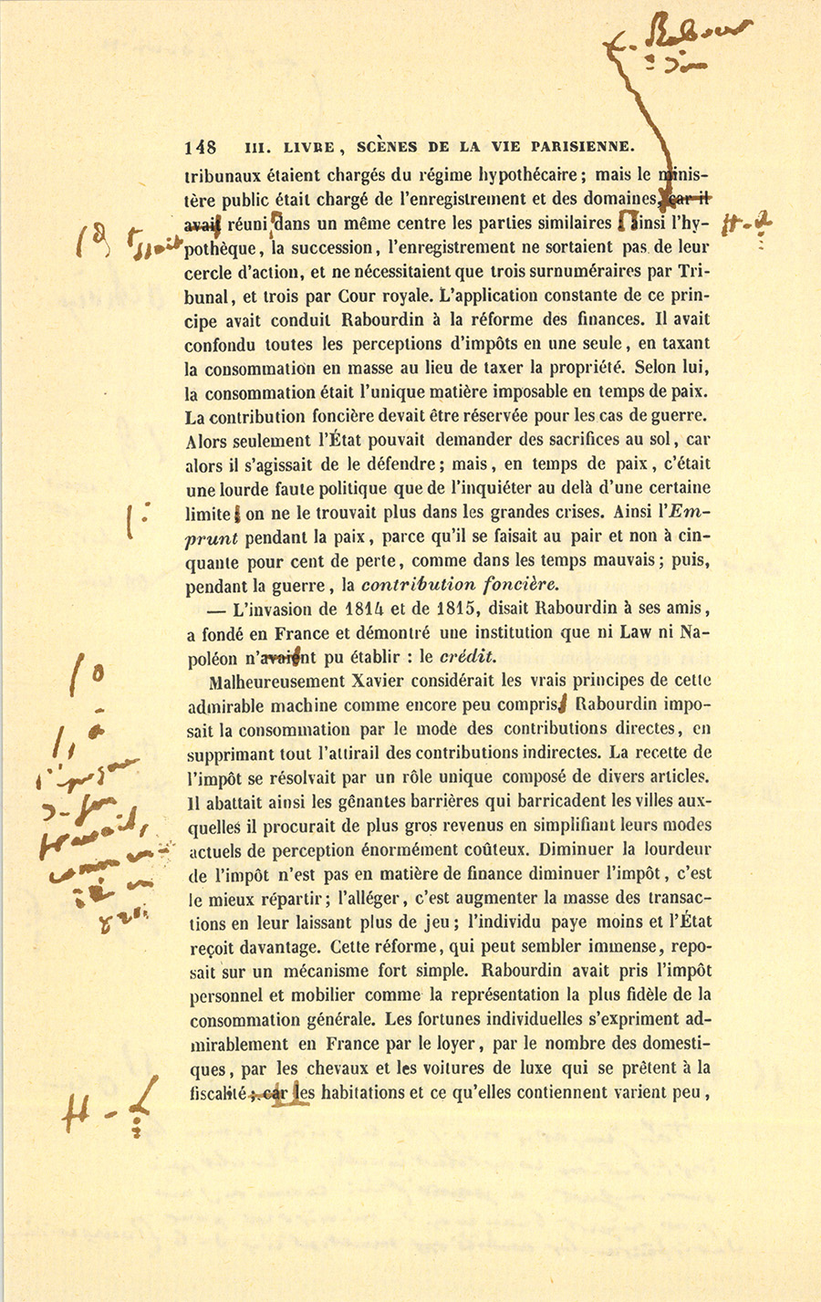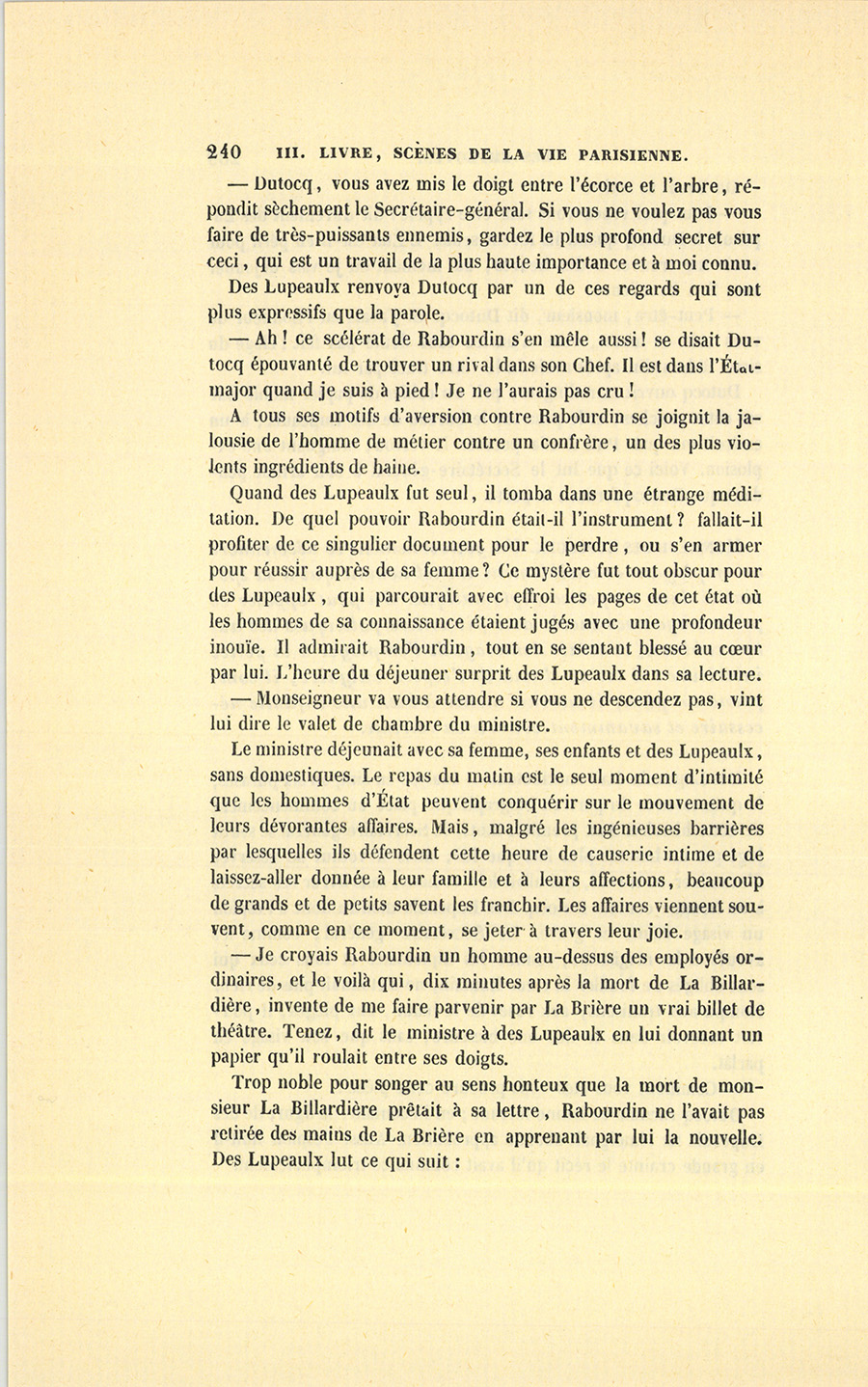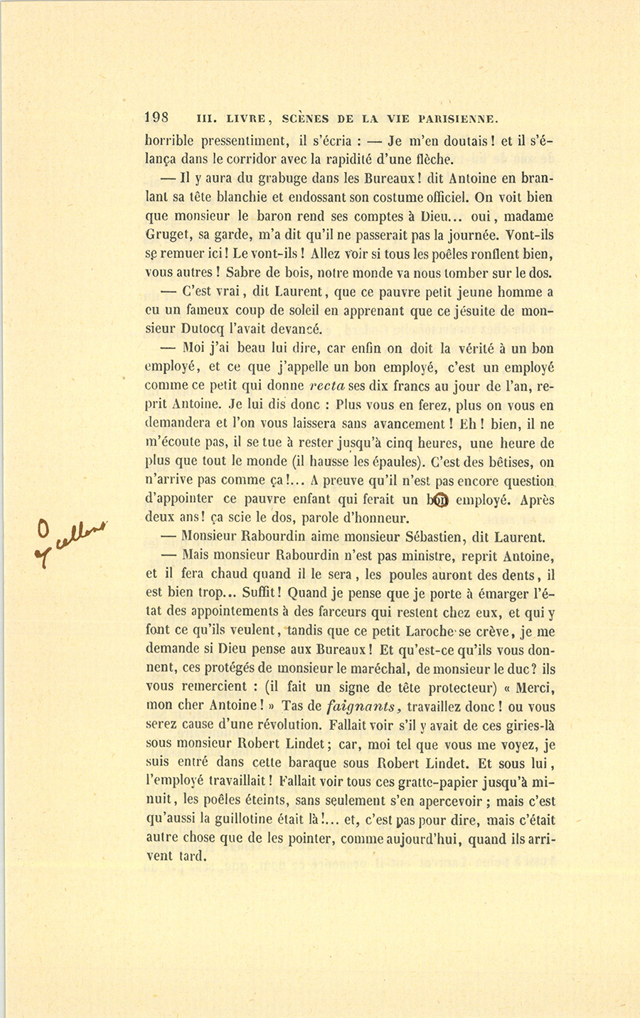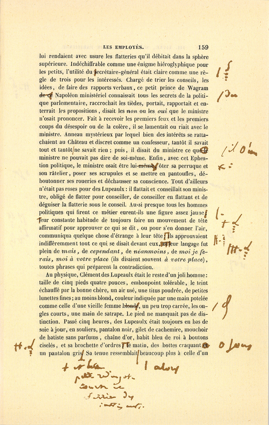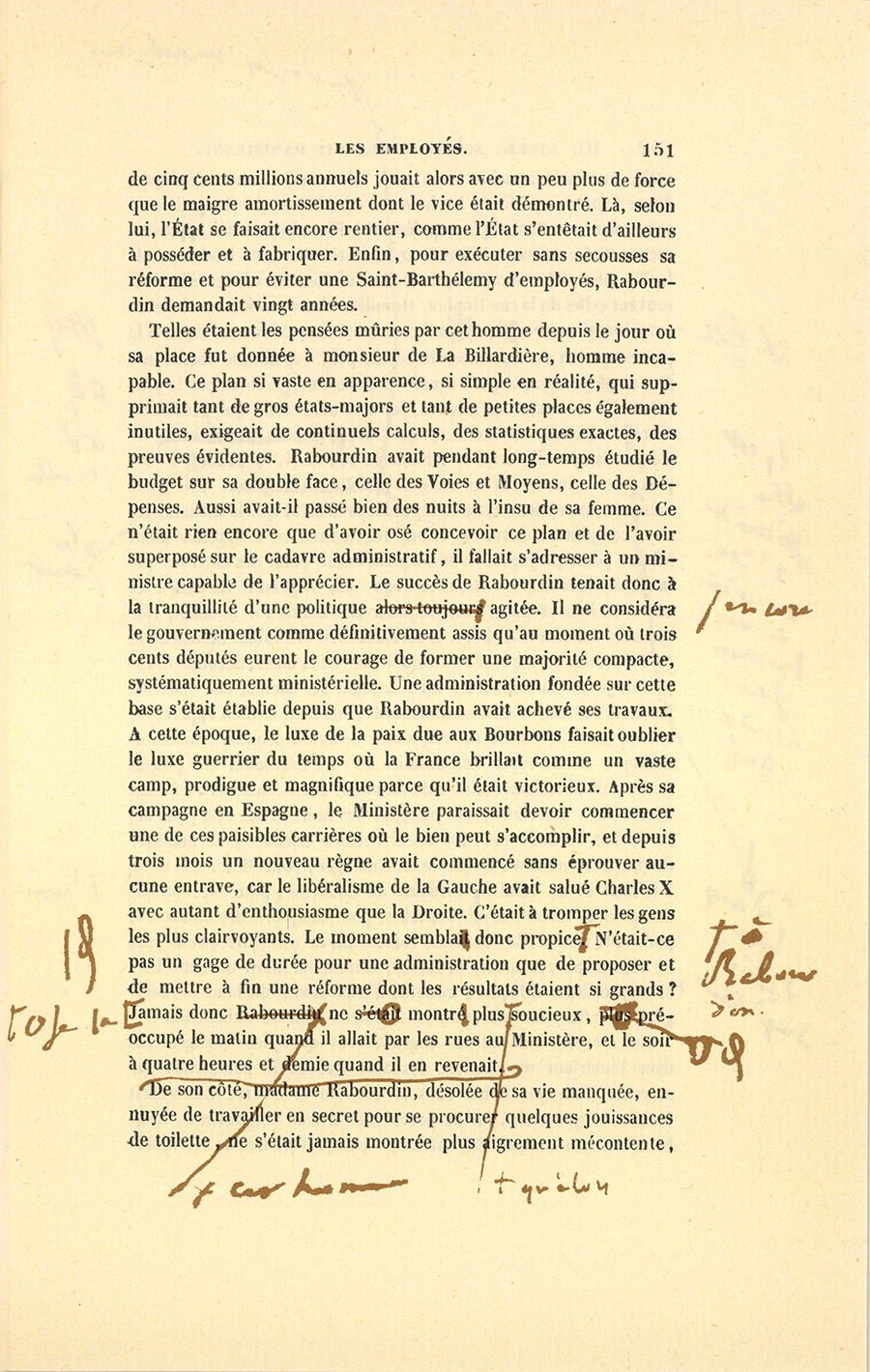 En ce moment Rabourdin grondait ce pauvre petit Sébastien, le seul qui fût dans la confidence entière de ses immenses travaux. Le surnuméraire copiait et recopiait le fameux mémoire {p. 183} composé de cent cinquante feuillets de grand papier Tellière, outre les tableaux à l’appui, les résumés qui tenaient sur une simple feuille, les calculs avec accolades, titres à l’anglaise et sous-titres en ronde. Animé par sa participation mécanique à cette grande idée, l’enfant de vingt ans refaisait un tableau pour un simple grattage, il mettait sa gloire à peindre les écritures, éléments d’une si noble entreprise. Sébastien avait commis l’imprudence d’emporter au bureau la minute du travail le plus dangereux, afin d’en achever la copie. C’était un État général des employés des administrations centrales de tous les ministères à Paris, avec des indications sur leur fortune présente et à venir, et sur leurs entreprises personnelles en dehors de leur emploi.