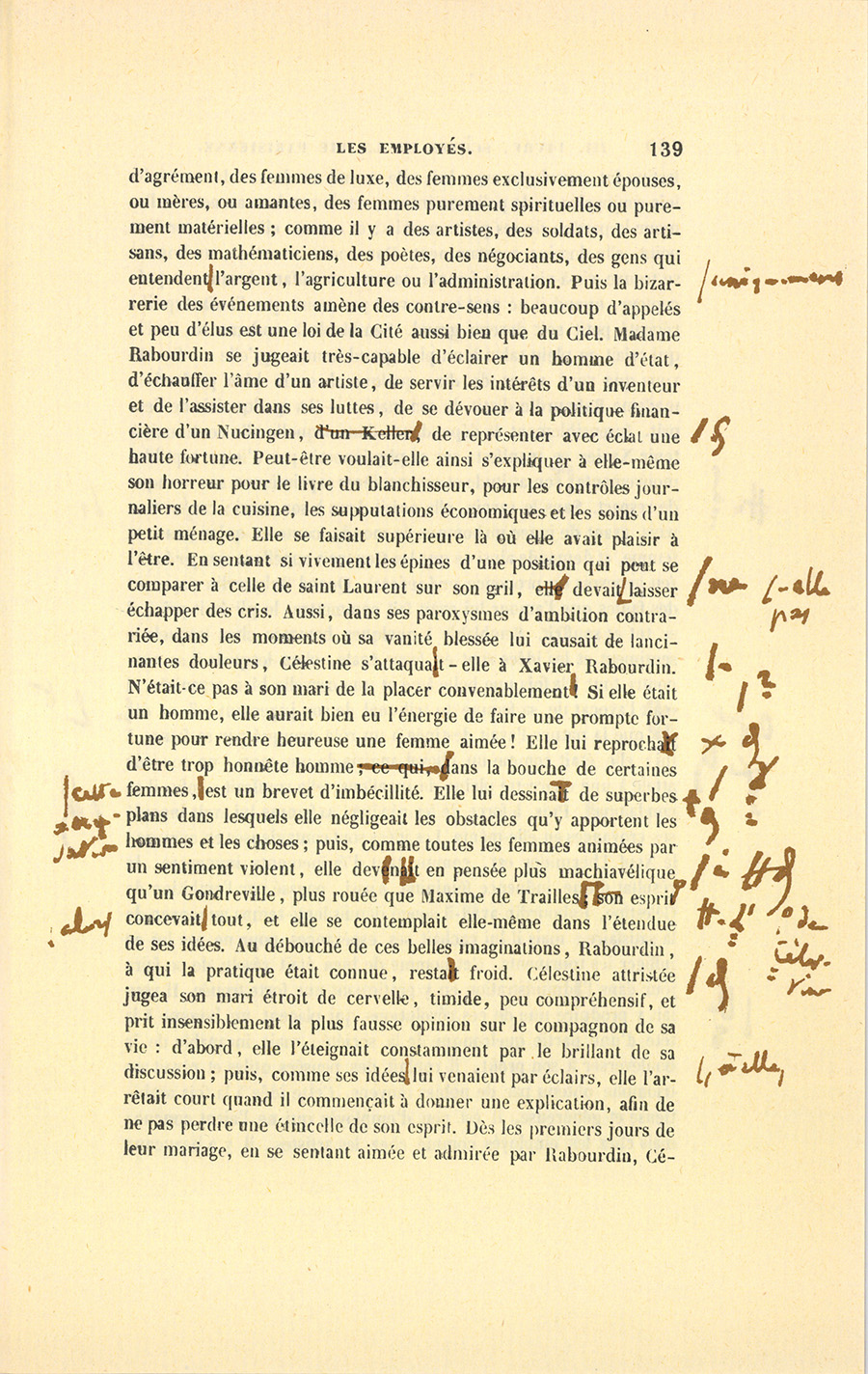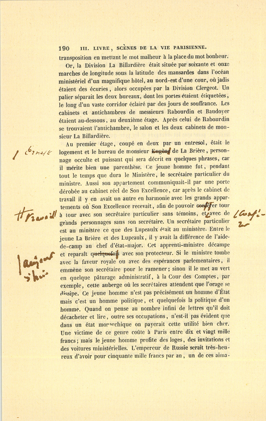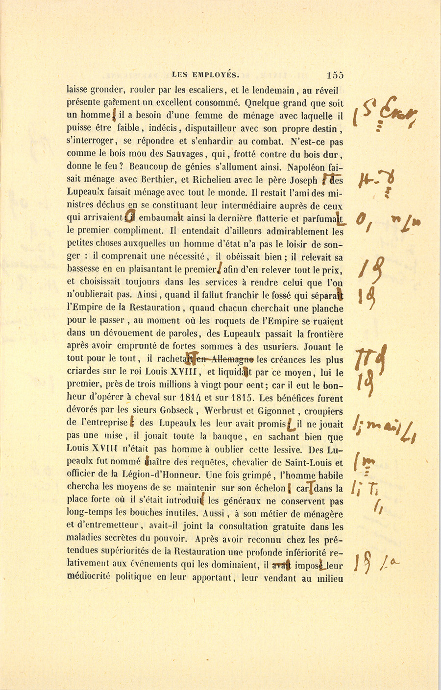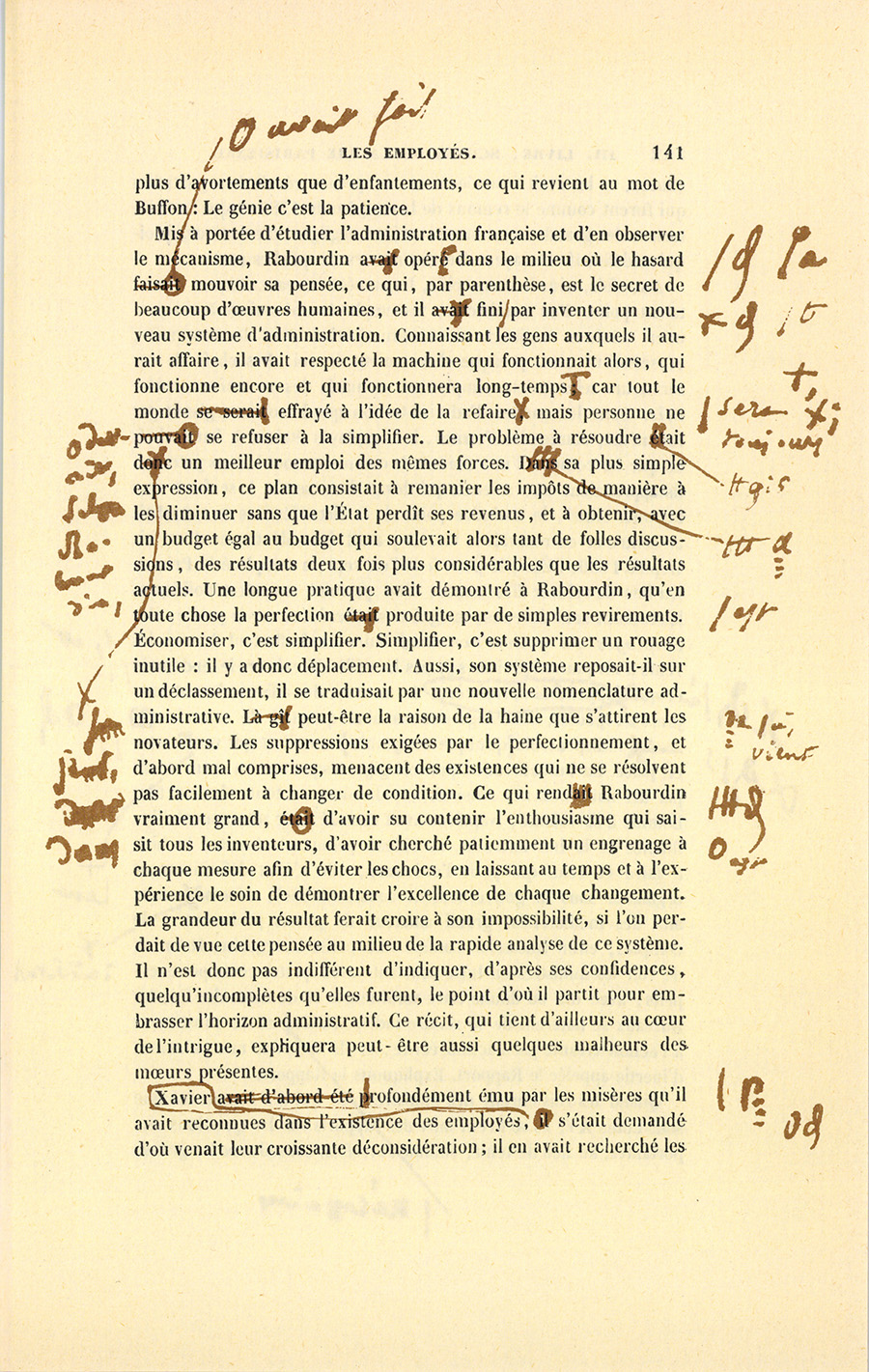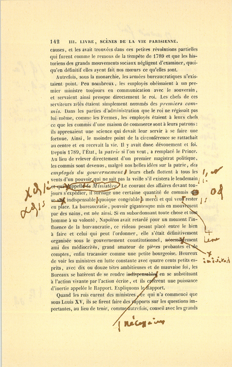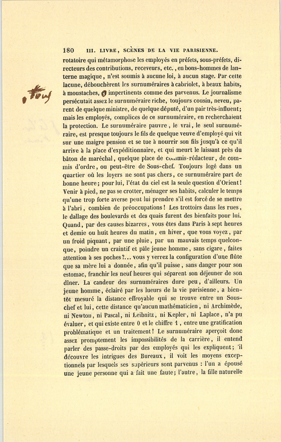 En ce moment Rabourdin grondait ce pauvre petit Sébastien, le seul qui fût dans la confidence entière de ses immenses travaux. Le surnuméraire copiait et recopiait le fameux mémoire {p. 183} composé de cent cinquante feuillets de grand papier Tellière, outre les tableaux à l’appui, les résumés qui tenaient sur une simple feuille, les calculs avec accolades, titres à l’anglaise et sous-titres en ronde. Animé par sa participation mécanique à cette grande idée, l’enfant de vingt ans refaisait un tableau pour un simple grattage, il mettait sa gloire à peindre les écritures, éléments d’une si noble entreprise. Sébastien avait commis l’imprudence d’emporter au bureau la minute du travail le plus dangereux, afin d’en achever la copie. C’était un État général des employés des administrations centrales de tous les ministères à Paris, avec des indications sur leur fortune présente et à venir, et sur leurs entreprises personnelles en dehors de leur emploi.