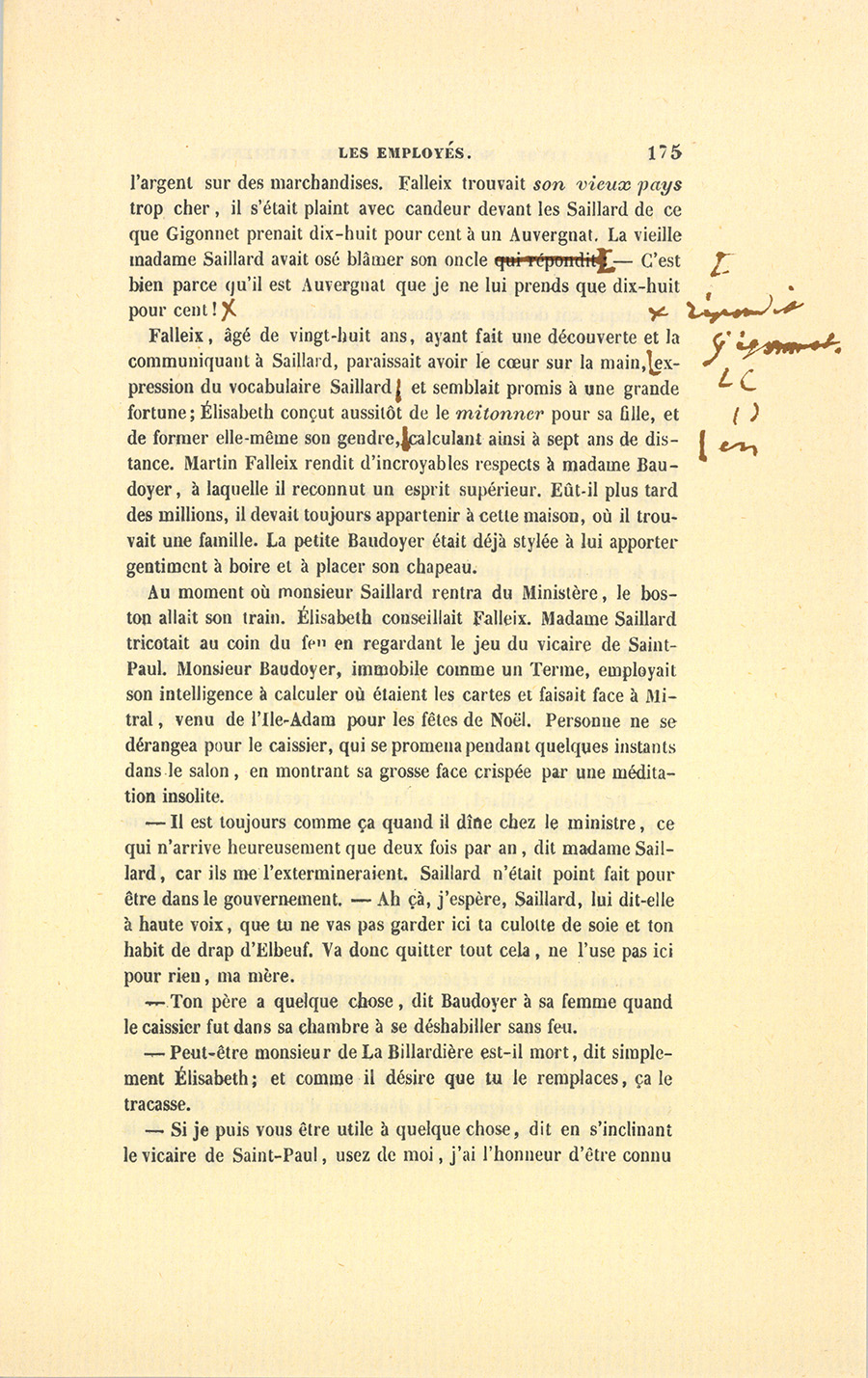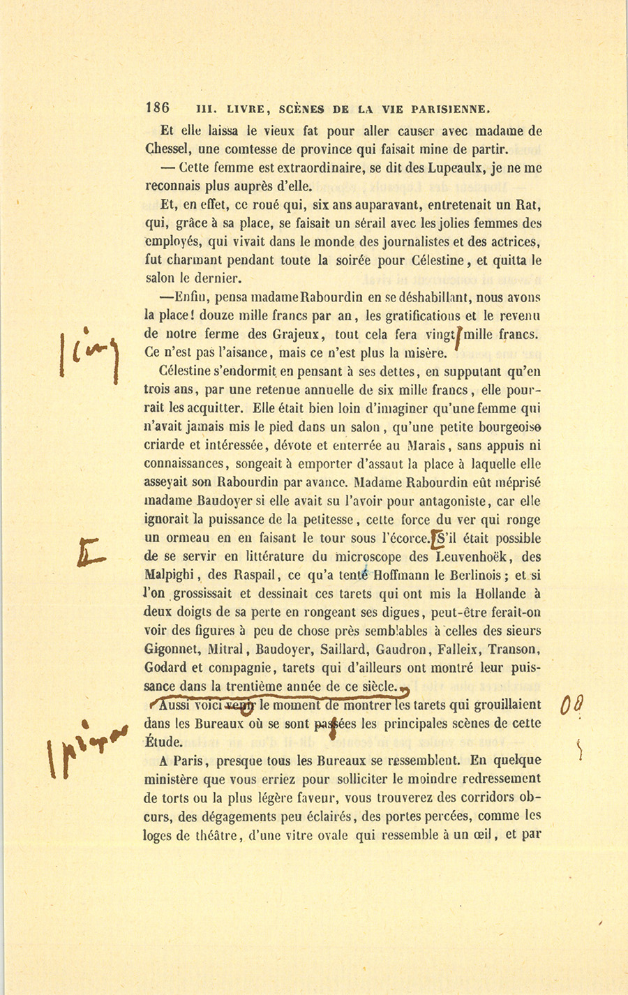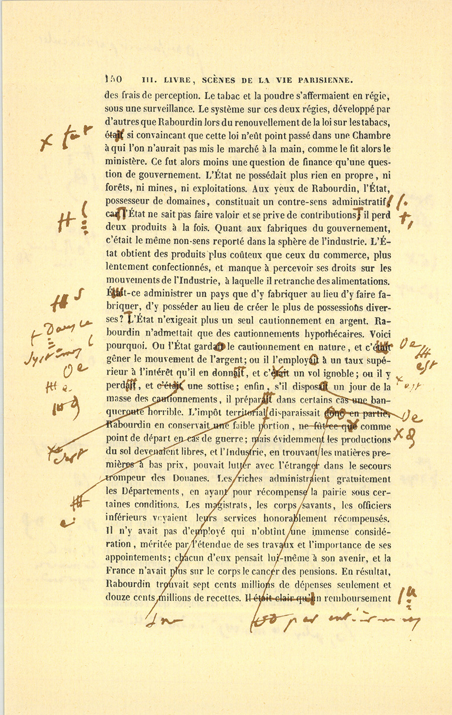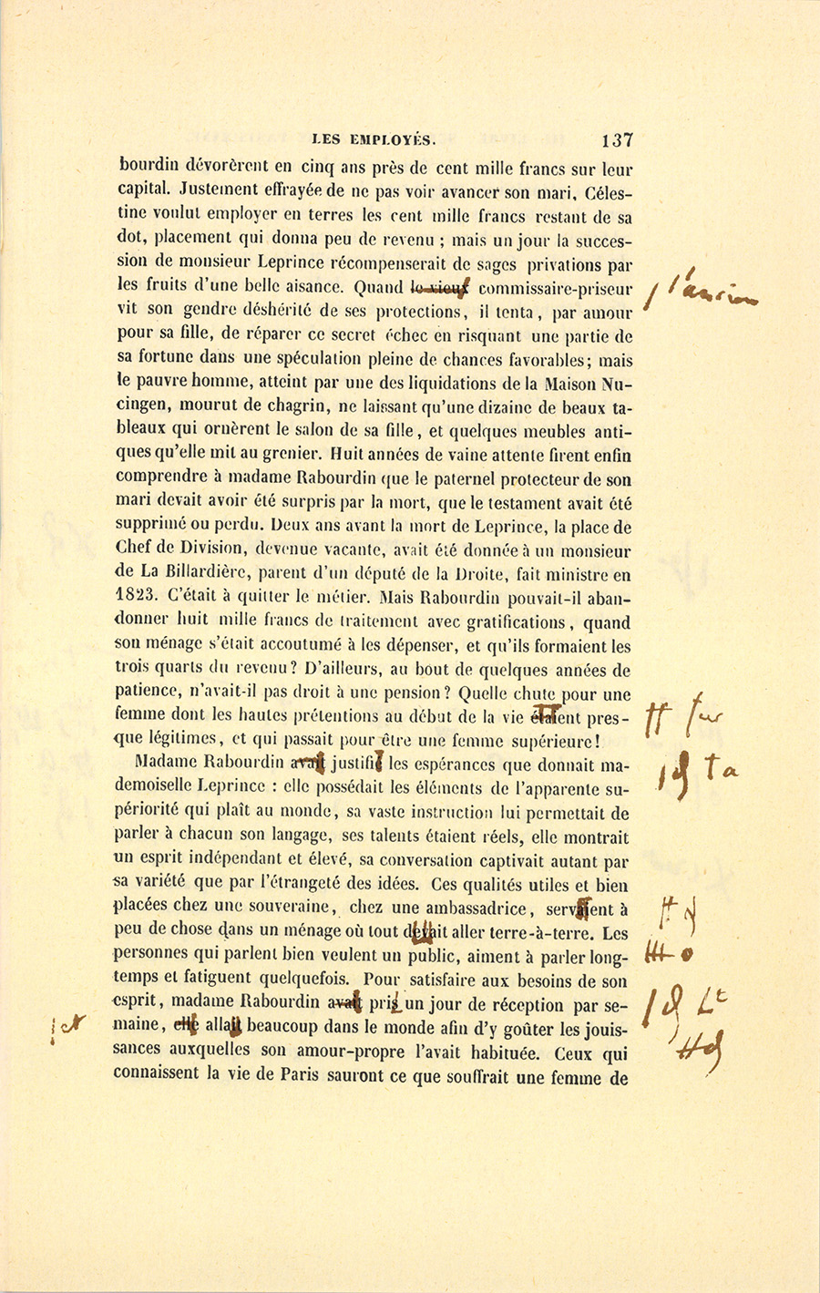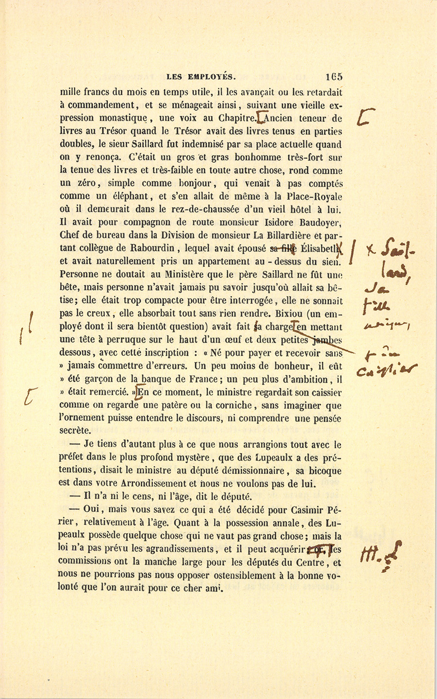 En ce moment Rabourdin grondait ce pauvre petit Sébastien, le seul qui fût dans la confidence entière de ses immenses travaux. Le surnuméraire copiait et recopiait le fameux mémoire {p. 183} composé de cent cinquante feuillets de grand papier Tellière, outre les tableaux à l’appui, les résumés qui tenaient sur une simple feuille, les calculs avec accolades, titres à l’anglaise et sous-titres en ronde. Animé par sa participation mécanique à cette grande idée, l’enfant de vingt ans refaisait un tableau pour un simple grattage, il mettait sa gloire à peindre les écritures, éléments d’une si noble entreprise. Sébastien avait commis l’imprudence d’emporter au bureau la minute du travail le plus dangereux, afin d’en achever la copie. C’était un État général des employés des administrations centrales de tous les ministères à Paris, avec des indications sur leur fortune présente et à venir, et sur leurs entreprises personnelles en dehors de leur emploi.