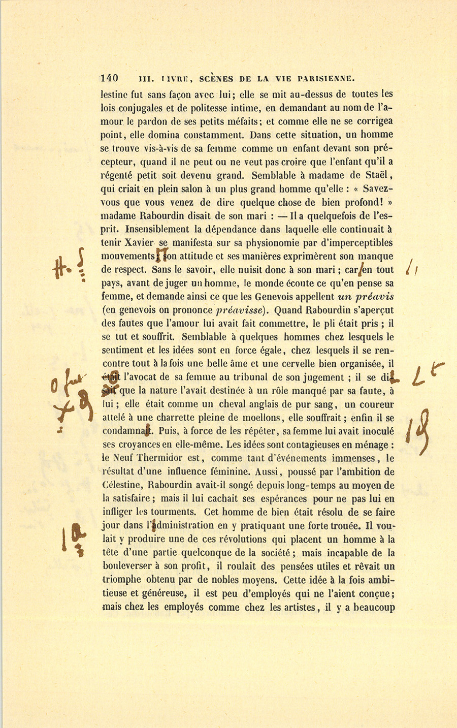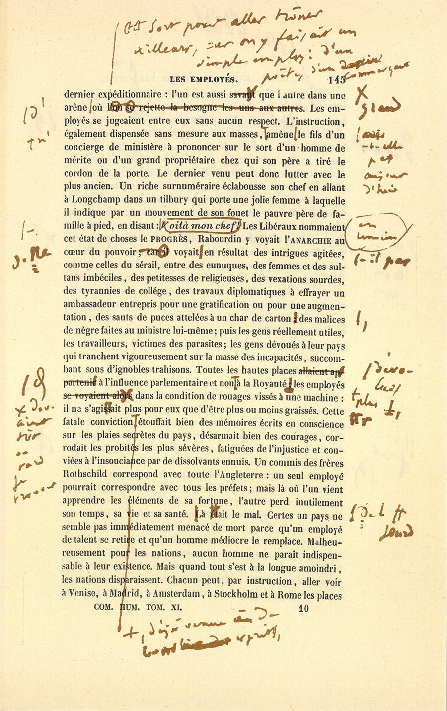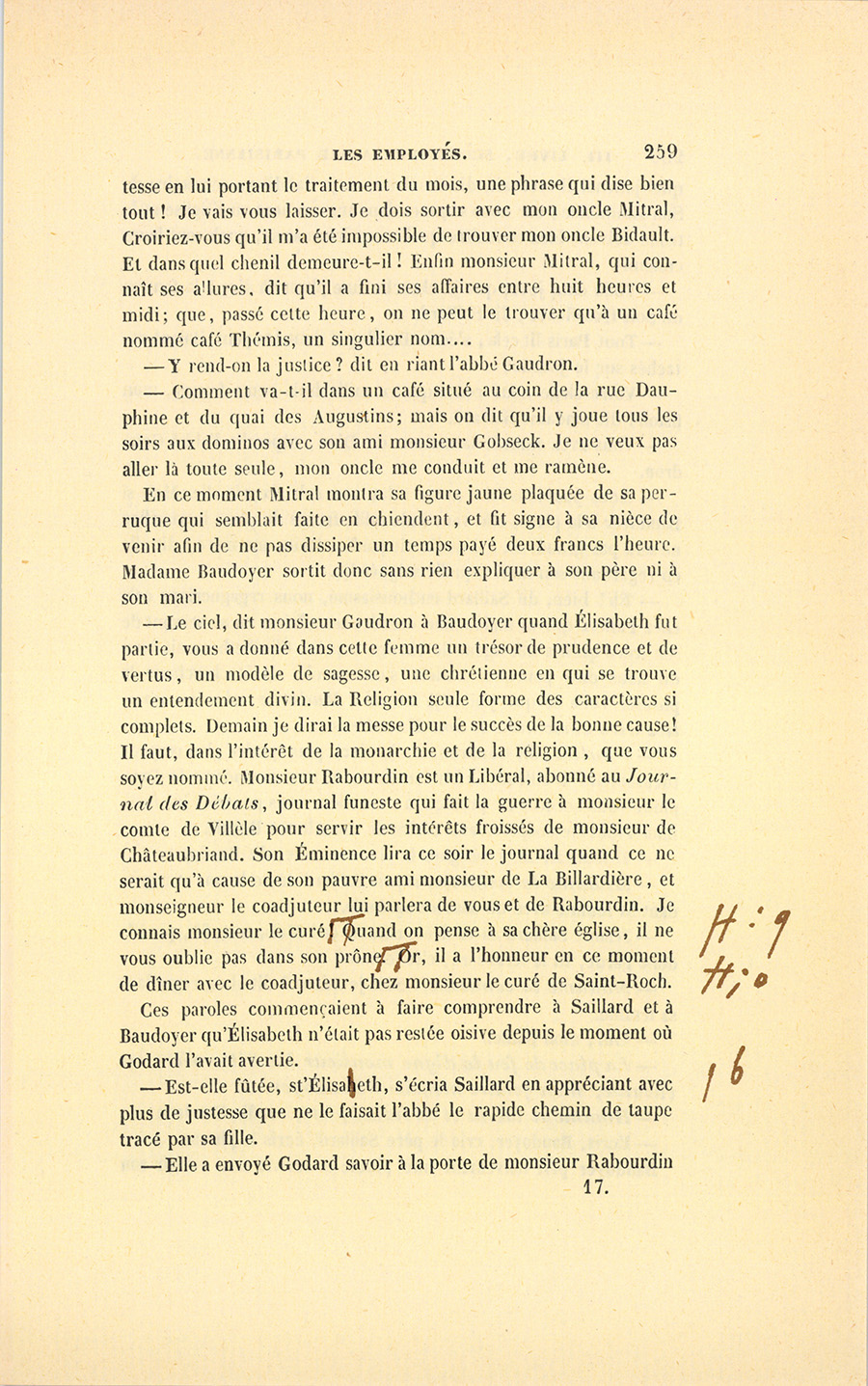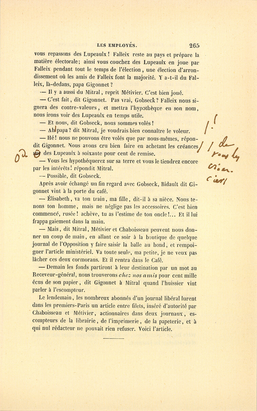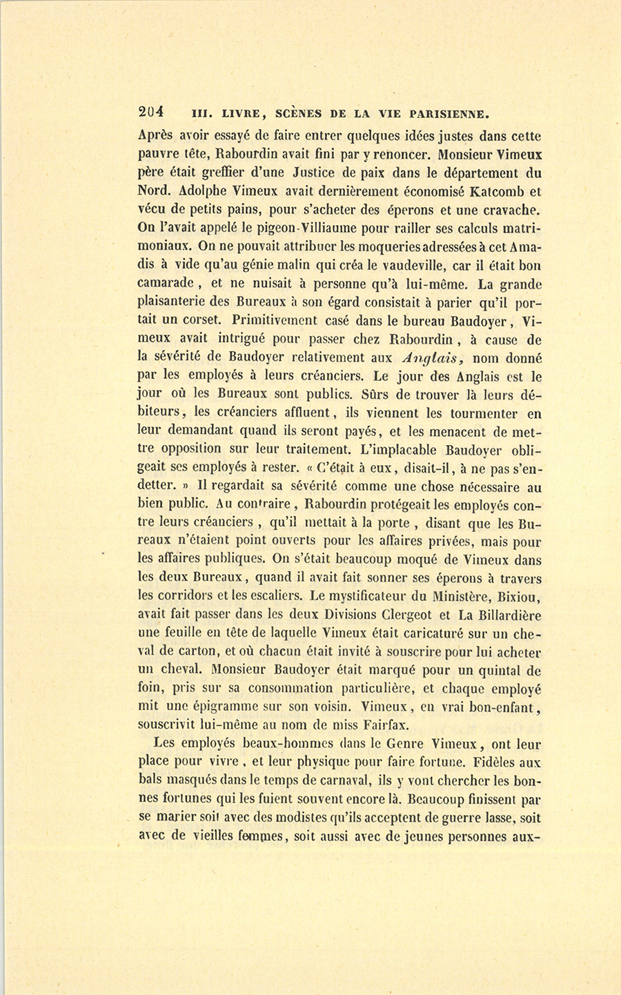 En ce moment Rabourdin grondait ce pauvre petit Sébastien, le seul qui fût dans la confidence entière de ses immenses travaux. Le surnuméraire copiait et recopiait le fameux mémoire {p. 183} composé de cent cinquante feuillets de grand papier Tellière, outre les tableaux à l’appui, les résumés qui tenaient sur une simple feuille, les calculs avec accolades, titres à l’anglaise et sous-titres en ronde. Animé par sa participation mécanique à cette grande idée, l’enfant de vingt ans refaisait un tableau pour un simple grattage, il mettait sa gloire à peindre les écritures, éléments d’une si noble entreprise. Sébastien avait commis l’imprudence d’emporter au bureau la minute du travail le plus dangereux, afin d’en achever la copie. C’était un État général des employés des administrations centrales de tous les ministères à Paris, avec des indications sur leur fortune présente et à venir, et sur leurs entreprises personnelles en dehors de leur emploi.