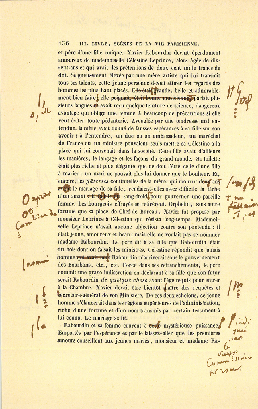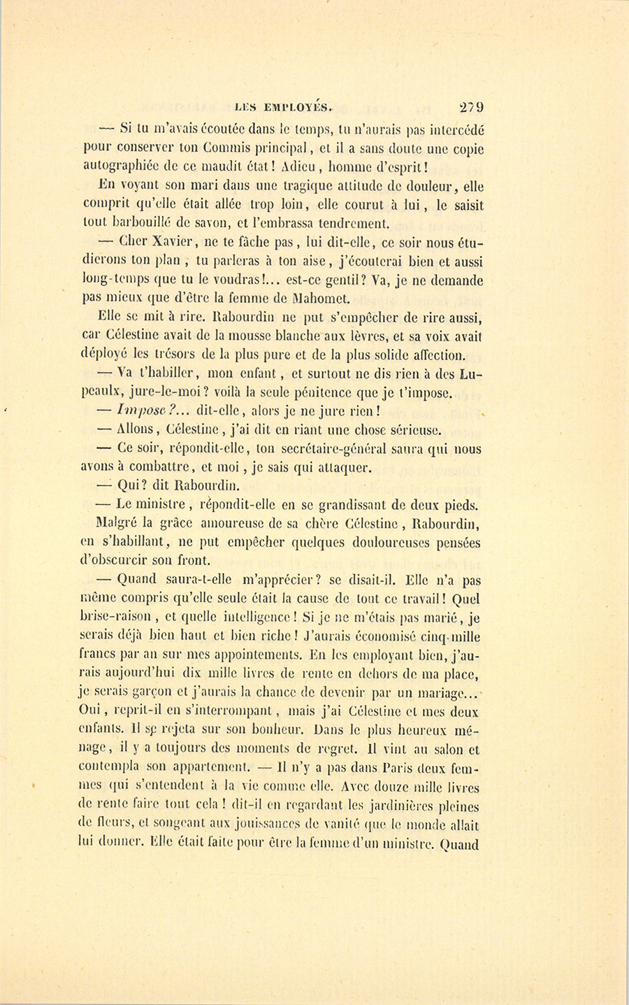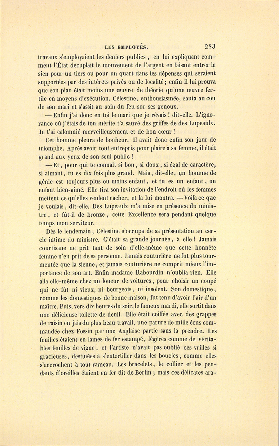 La vie de cet homme offrait des particularités mystérieuses : il n’avait jamais connu son père ; sa mère, femme chez qui le luxe éclatait, toujours parée, toujours en fête, ayant un riche équipage, dont la beauté lui parut merveilleuse par souvenir, et qu’il voyait rarement, lui laissa peu de chose ; mais elle lui avait donné l’éducation vulgaire et incomplète qui produit tant d’ambitions et si peu de capacités. À seize ans, quelques jours avant la mort de sa mère, il était sorti du lycée Napoléon pour entrer comme surnuméraire dans les bureaux où quelque protecteur inconnu l’avait promptement fait appointer. À vingt-deux ans, Rabourdin était Sous-Chef, et Chef à vingt-cinq. Depuis ce jour, la main qui soutenait ce garçon dans la vie n’avait plus fait sentir son pouvoir que dans une seule circonstance ; elle l’avait amené, lui pauvre, dans la maison de monsieur Leprince, ancien commissaire-priseur, homme veuf, passant pour très-riche {p. 136} et père d’une fille unique. Xavier Rabourdin devint éperdument amoureux de mademoiselle Célestine Leprince, alors âgée de dix-sept ans et qui avait les prétentions de deux cent mille francs de dot. Soigneusement élevée par une mère artiste qui lui transmit tous ses talents, cette jeune personne devait attirer les regards des hommes les plus haut placés. Grande, belle et admirablement bien faite, elle parlait plusieurs langues, elle avait reçu quelque teinture de science, dangereux avantage qui oblige une femme à beaucoup de précautions si elle veut éviter toute pédanterie. Aveuglée par une tendresse mal entendue, la mère avait donné de fausses espérances à sa fille sur son avenir : à l’entendre, un duc ou un ambassadeur, un maréchal de France ou un ministre pouvaient seuls mettre sa Célestine à la place qui lui convenait dans la société. Cette fille avait d’ailleurs les manières, le langage et les façons du grand monde. Sa toilette était plus riche et plus élégante que ne doit l’être celle d’une fille à marier : un mari ne pouvait plus lui donner que le bonheur. Et, encore, les gâteries continuelles de la mère, qui mourut un an après le mariage de sa fille, rendaient-elles assez difficile la tâche d’un amant. Combien de sang-froid ne fallait-il pas pour gouverner une pareille femme. Les bourgeois effrayés se retirèrent. Orphelin, sans autre fortune que sa place de Chef de Bureau, Xavier fut proposé par monsieur Leprince à Célestine qui résista long-temps. Mademoiselle Leprince n’avait aucune objection contre son prétendu : il était jeune, amoureux et beau ; mais elle ne voulait pas se nommer madame Rabourdin. Le père dit à sa fille que Rabourdin était du bois dont on faisait les ministres. Célestine répondit que jamais homme nommé Rabourdin n’arriverait sous le gouvernement des Bourbons, etc., etc. Forcé dans ses retranchements, le père commit une grave indiscrétion en déclarant à sa fille que son futur serait Rabourdin de quelque chose avant l’âge requis pour entrer à la Chambre. Xavier devait être bientôt Maître des requêtes et Secrétaire-général de son Ministère. De ces deux échelons, ce jeune homme s’élancerait dans les régions supérieures de l’administration, riche d’une fortune et d’un nom transmis par certain testament à lui connu. Le mariage se fit.