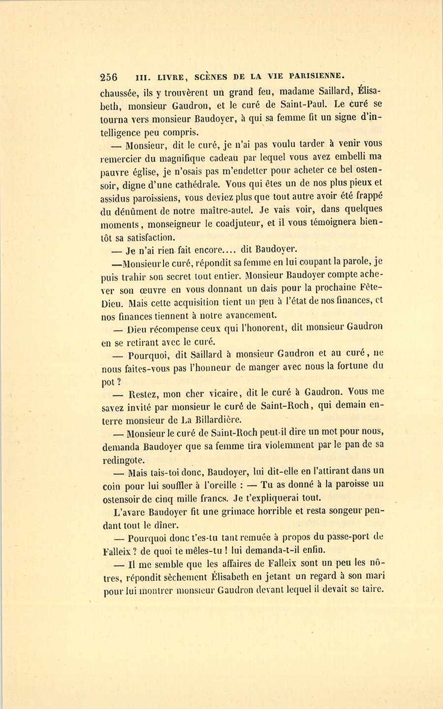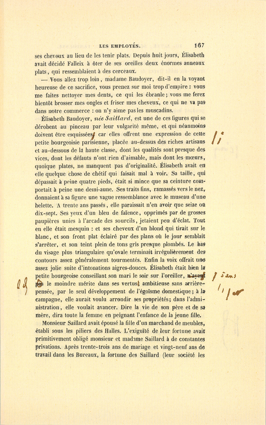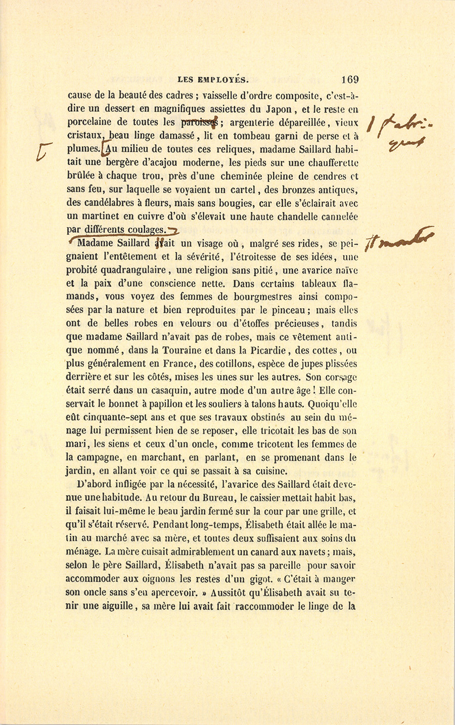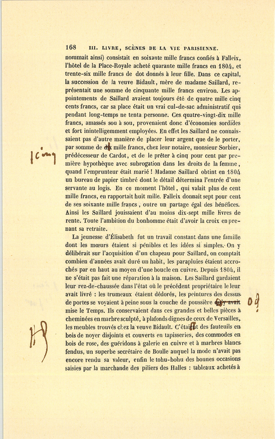 La jeunesse d’Élisabeth fut un travail constant dans une famille dont les mœurs étaient si pénibles et les idées si simples. On y délibérait sur l’acquisition d’un chapeau pour Saillard, on comptait combien d’années avait duré un habit, les parapluies étaient accrochés par en haut au moyen d’une boucle en cuivre. Depuis 1804, il ne s’était pas fait une réparation à la maison. Les Saillard gardaient leur rez-de-chaussée dans l’état où le précédent propriétaire le leur avait livré : les trumeaux étaient dédorés, les peintures des dessus de portes se voyaient à peine sous la couche de poussière mise par2 le Temps. Ils conservaient dans ces grandes et belles pièces à cheminées en marbre sculpté, à plafonds dignes de ceux de Versailles, les meubles trouvés chez la veuve Bidault. C’était des fauteuils en bois de noyer disjoints et couverts en tapisseries, des commodes en bois de rose, des guéridons à galerie en cuivre et à marbres blancs fendus, un superbe secrétaire de Boulle auquel la mode n’avait pas encore rendu sa valeur, enfin le tohu-bohu des bonnes occasions saisies par la marchande des piliers des Halles : tableaux achetés à {p. 169} cause de la beauté des cadres ; vaisselle d’ordre composite, c’est-à-dire un dessert en magnifiques assiettes du Japon, et le reste en porcelaine de toutes les fabriques ; argenterie dépareillée, vieux cristaux, beau linge damassé, lit en tombeau garni de perse et à plumes.