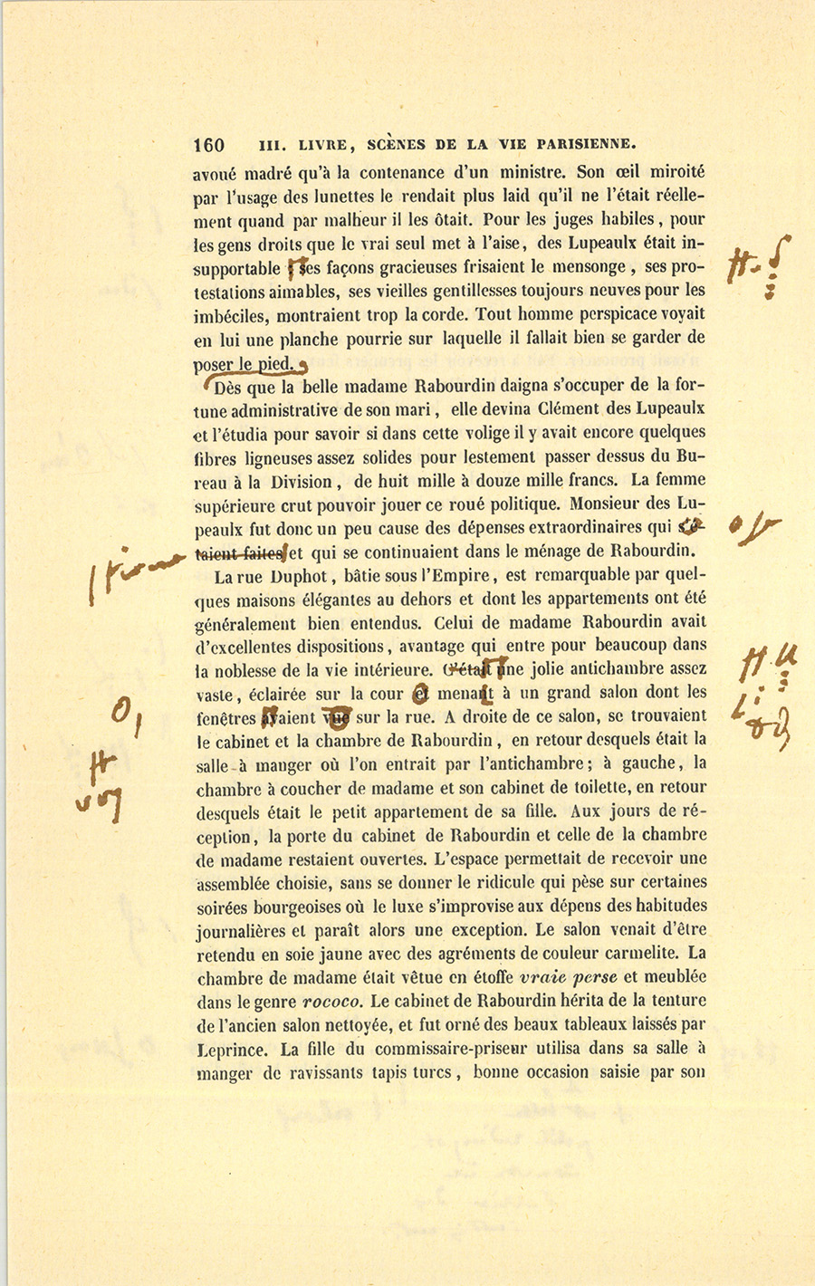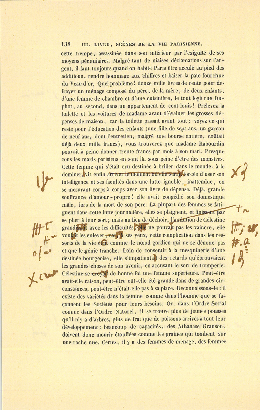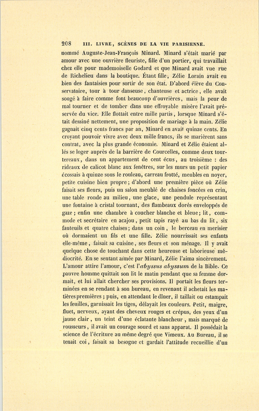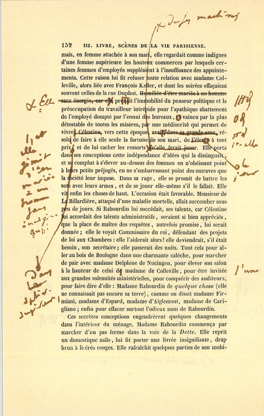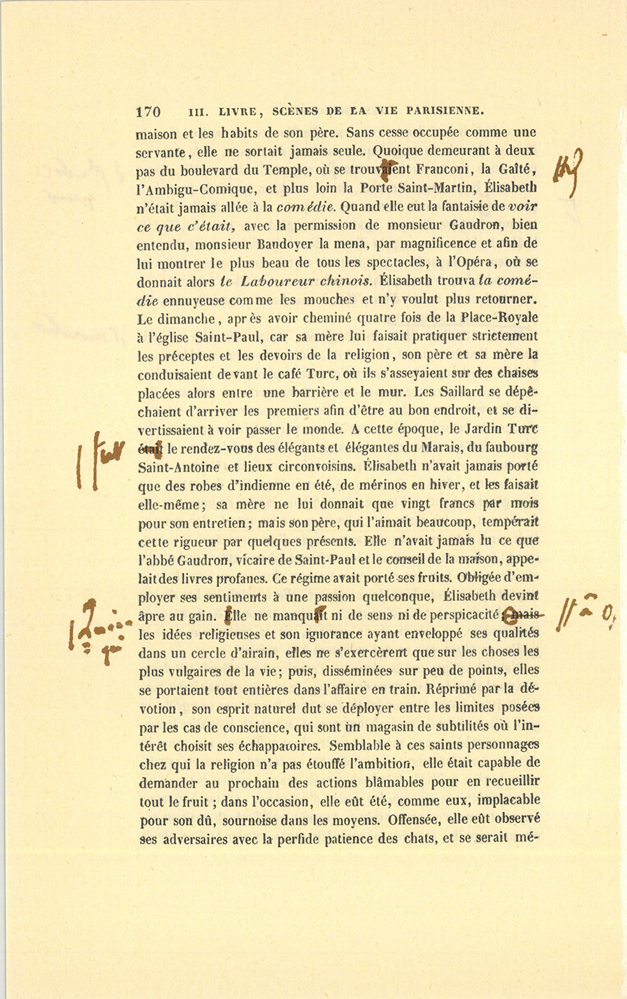 La jeunesse d’Élisabeth fut un travail constant dans une famille dont les mœurs étaient si pénibles et les idées si simples. On y délibérait sur l’acquisition d’un chapeau pour Saillard, on comptait combien d’années avait duré un habit, les parapluies étaient accrochés par en haut au moyen d’une boucle en cuivre. Depuis 1804, il ne s’était pas fait une réparation à la maison. Les Saillard gardaient leur rez-de-chaussée dans l’état où le précédent propriétaire le leur avait livré : les trumeaux étaient dédorés, les peintures des dessus de portes se voyaient à peine sous la couche de poussière mise par2 le Temps. Ils conservaient dans ces grandes et belles pièces à cheminées en marbre sculpté, à plafonds dignes de ceux de Versailles, les meubles trouvés chez la veuve Bidault. C’était des fauteuils en bois de noyer disjoints et couverts en tapisseries, des commodes en bois de rose, des guéridons à galerie en cuivre et à marbres blancs fendus, un superbe secrétaire de Boulle auquel la mode n’avait pas encore rendu sa valeur, enfin le tohu-bohu des bonnes occasions saisies par la marchande des piliers des Halles : tableaux achetés à {p. 169} cause de la beauté des cadres ; vaisselle d’ordre composite, c’est-à-dire un dessert en magnifiques assiettes du Japon, et le reste en porcelaine de toutes les fabriques ; argenterie dépareillée, vieux cristaux, beau linge damassé, lit en tombeau garni de perse et à plumes.