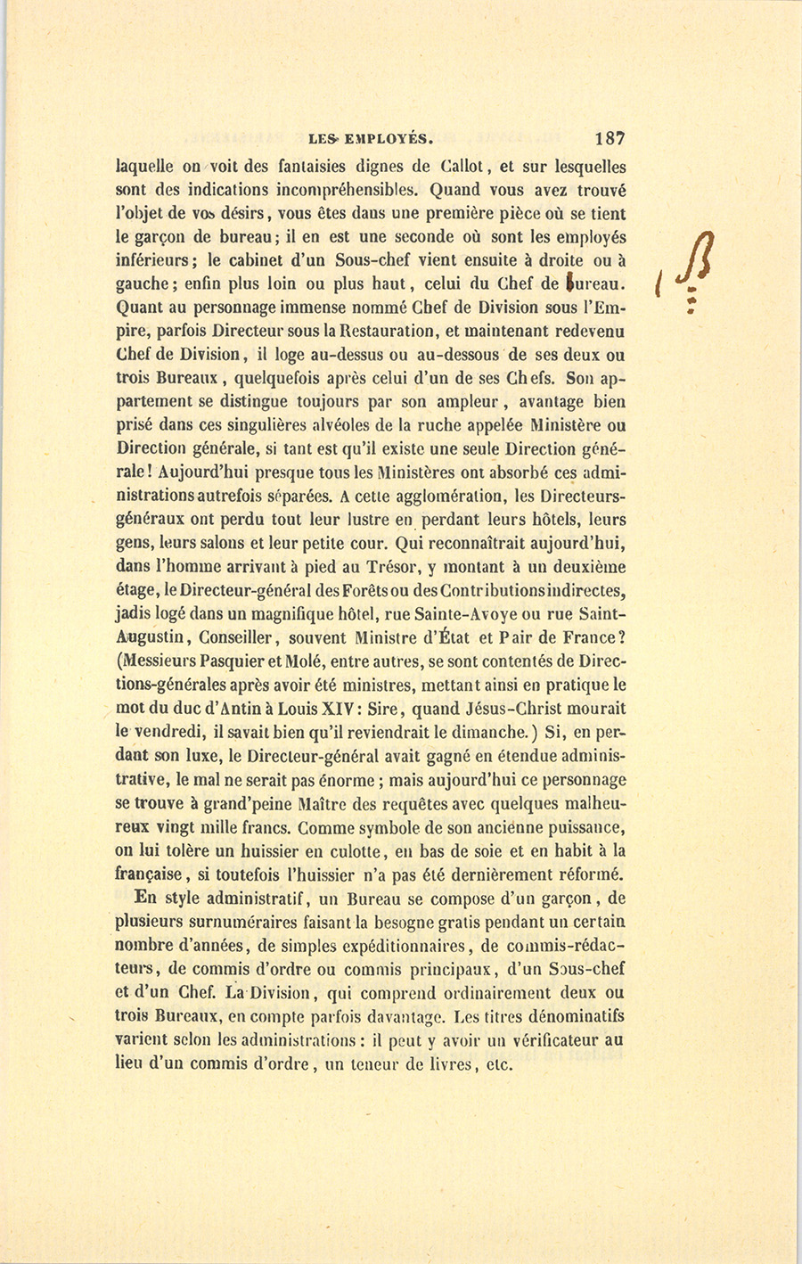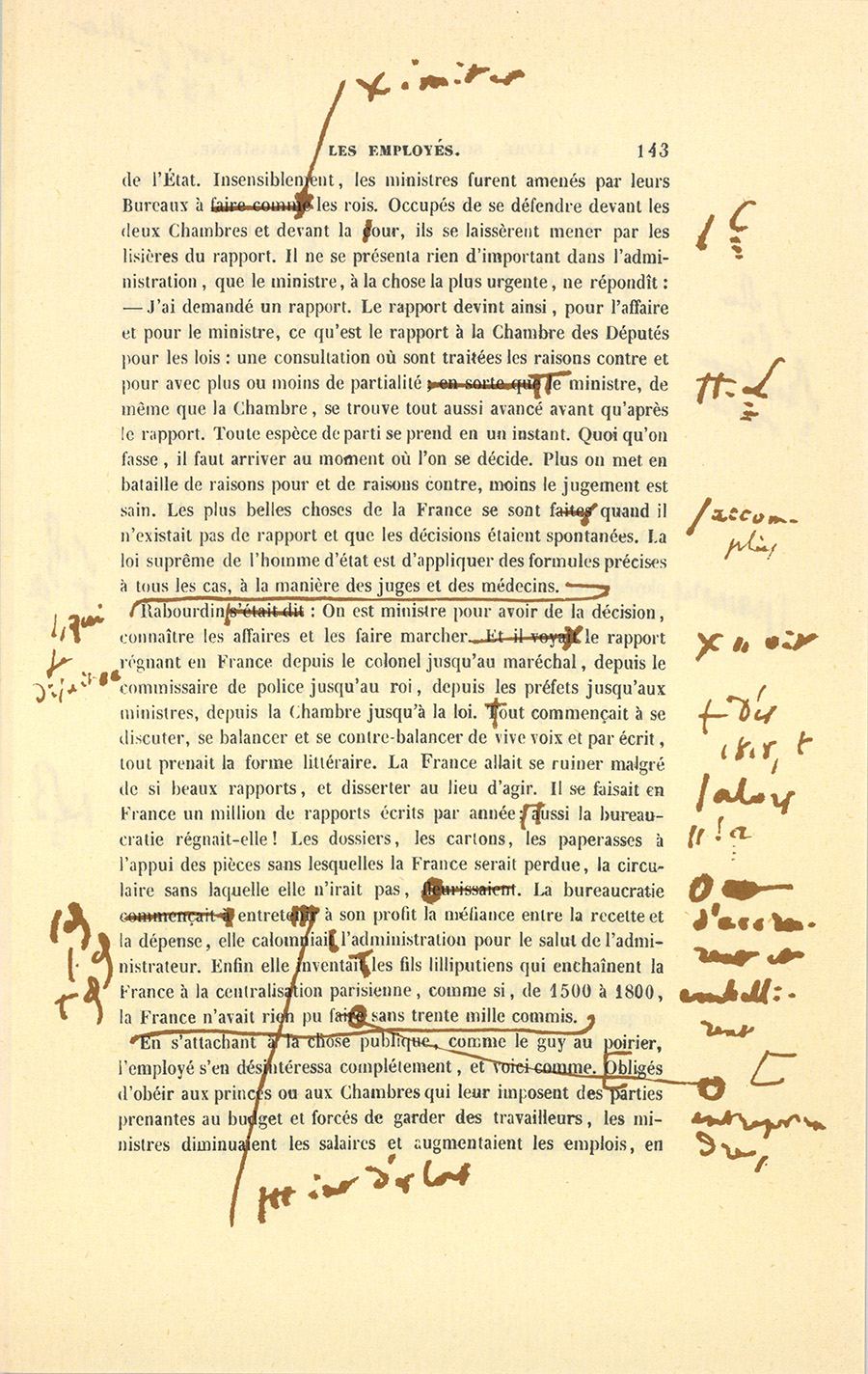 Autrefois, sous la monarchie, les armées bureaucratiques n’existaient point. Peu nombreux, les employés obéissaient à un premier ministre toujours en communication avec le souverain, et servaient ainsi presque directement le roi. Les chefs de ces serviteurs zélés étaient simplement nommés des premiers commis. Dans les parties d’administration que le roi ne régissait pas lui-même, comme les Fermes, les employés étaient à leurs chefs ce que les commis d’une maison de commerce sont à leurs patrons : ils apprenaient une science qui devait leur servir à se faire une fortune. Ainsi, le moindre point de la circonférence se rattachait au centre et en recevait la vie. Il y avait donc dévouement et foi. Depuis 1789, l’État, la patrie si l’on veut, a remplacé le Prince. Au lieu de relever directement d’un premier magistrat politique, les commis sont devenus, malgré nos belles idées sur la patrie, des employés du gouvernement, et leurs chefs flottent à tous les vents d’un pouvoir appelé Ministère qui ne sait pas la veille s’il existera le lendemain. Le courant des affaires devant toujours s’expédier, il surnage une certaine quantité de commis indispensables quoique congéables à merci et qui veulent rester en place. La bureaucratie, pouvoir gigantesque mis en mouvement par des nains, est née ainsi. Si en subordonnant toute chose et tout homme à sa volonté, Napoléon avait retardé pour un moment l’influence de la bureaucratie, ce rideau pesant placé entre le bien à faire et celui qui peut l’ordonner, elle s’était définitivement organisée sous le gouvernement constitutionnel, inévitablement ami des médiocrités, grand amateur de pièces probantes et de comptes, enfin tracassier comme une petite bourgeoise. Heureux de voir les ministres en lutte constante avec quatre cents petits esprits, avec dix ou douze têtes ambitieuses et de mauvaise foi, les Bureaux se hâtèrent de se rendre nécessaires en se substituant à l’action vivante par l’action écrite, et ils créèrent une puissance d’inertie appelée le Rapport. Expliquons le Rapport.