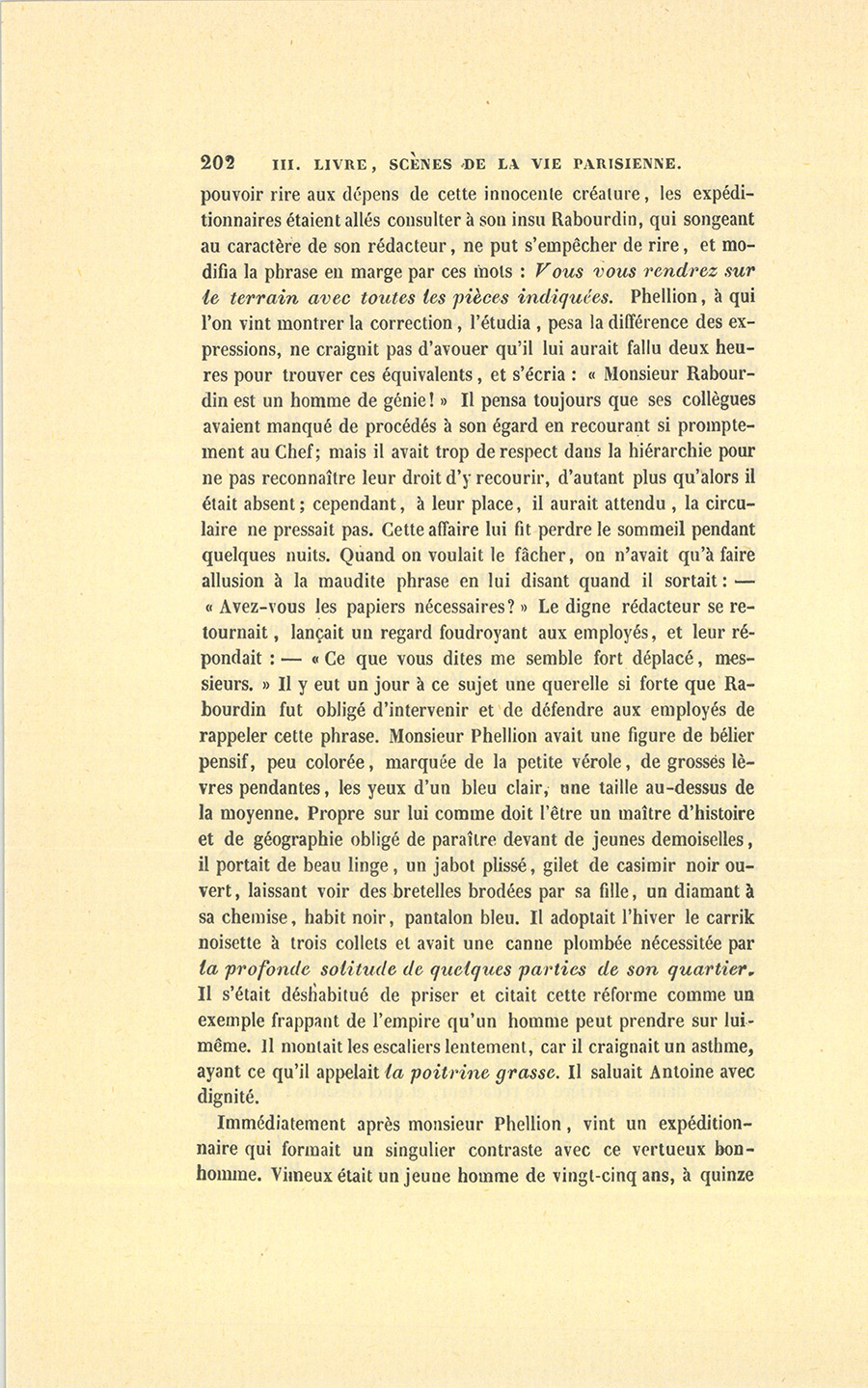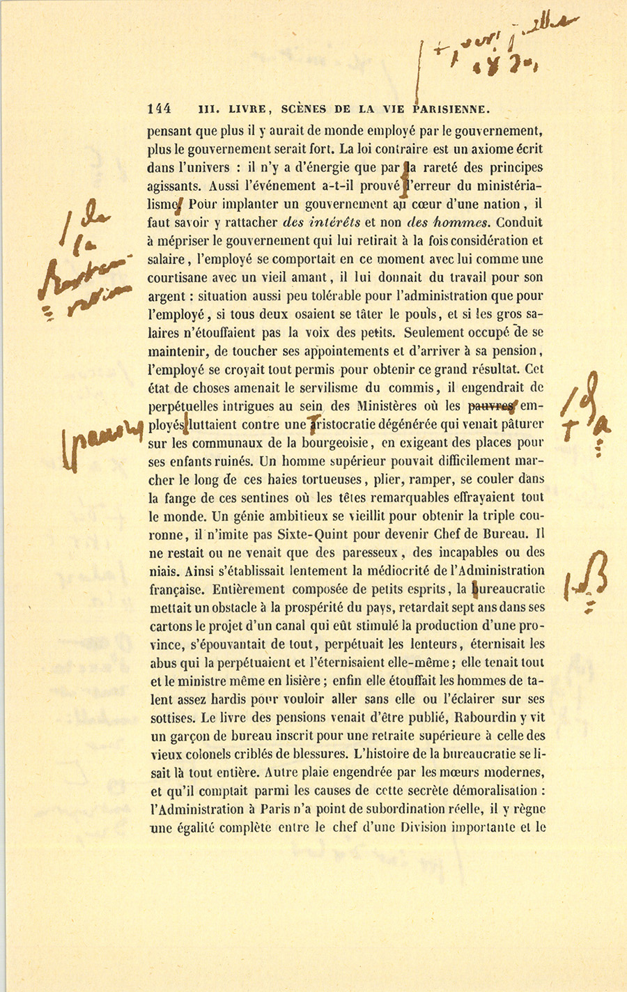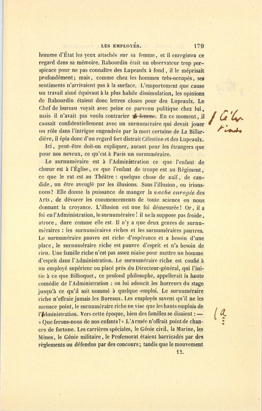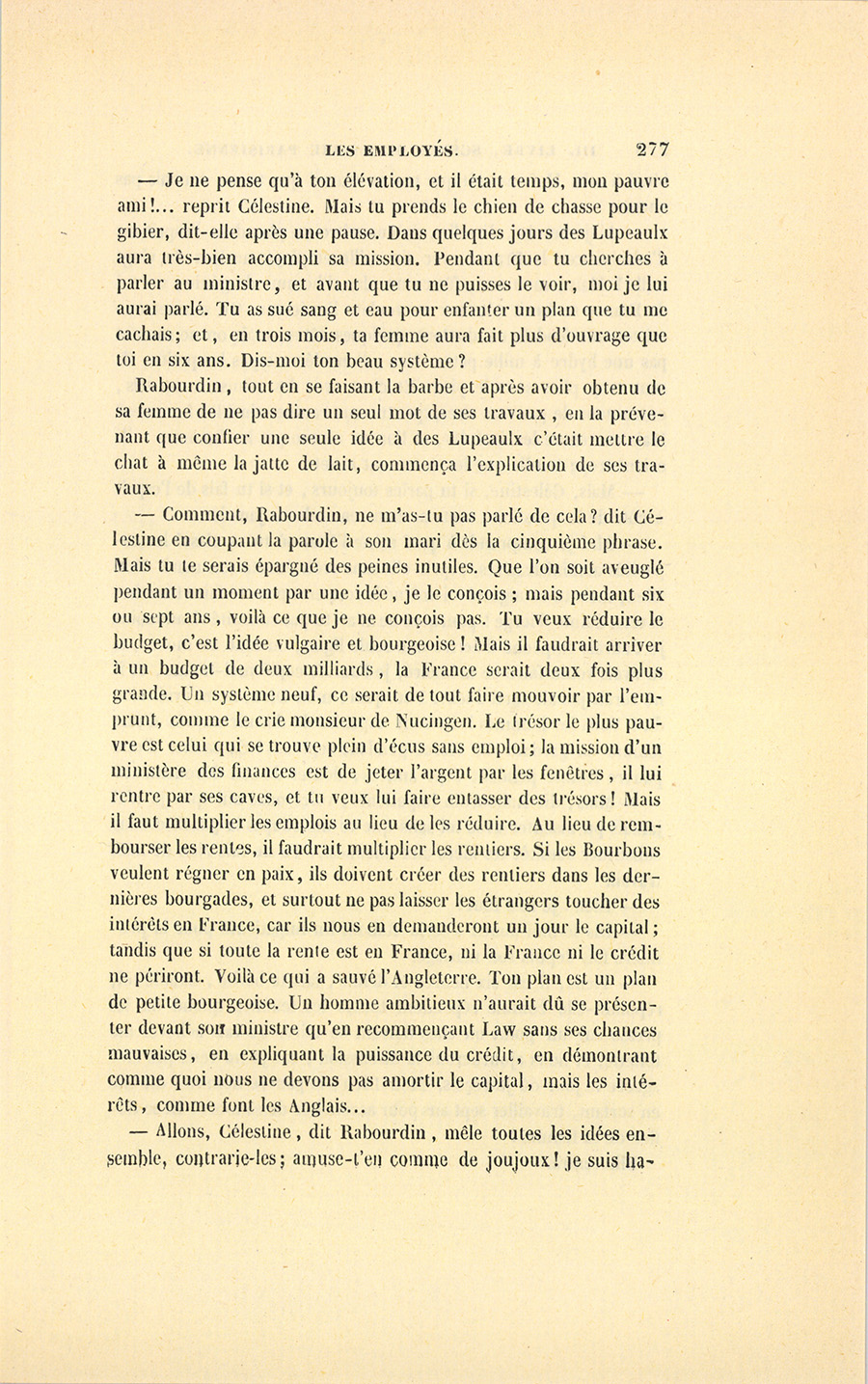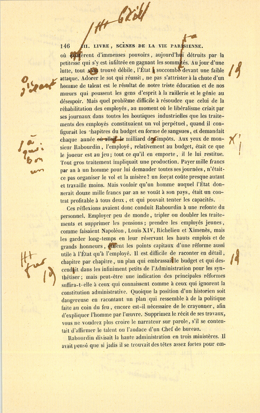 Selon monsieur Rabourdin, cent employés à douze mille francs {p. 330} feraient mieux et plus promptement que mille employés à douze cents francs.