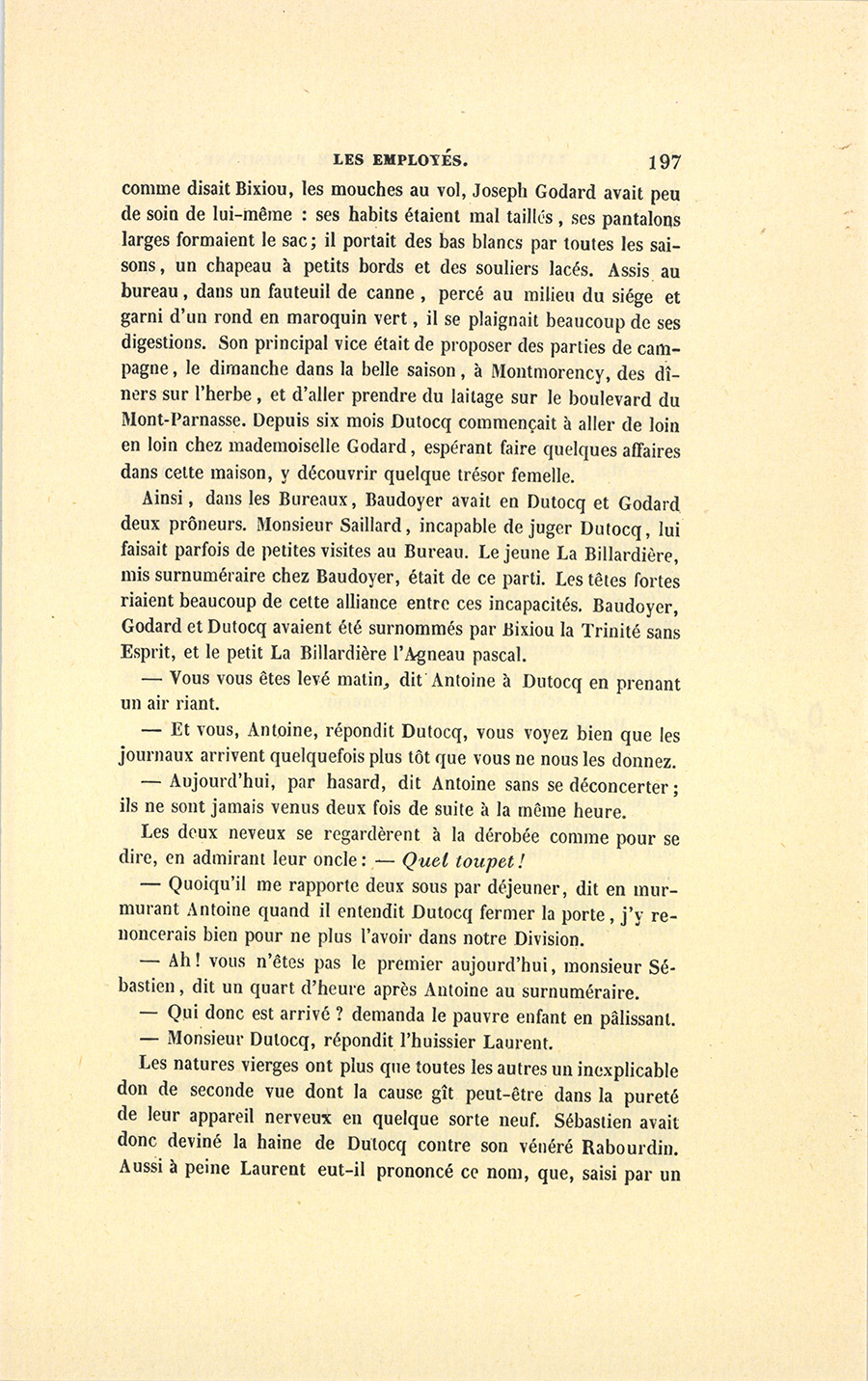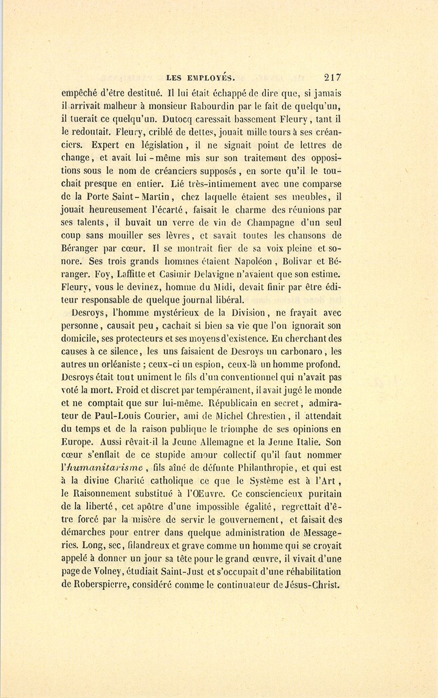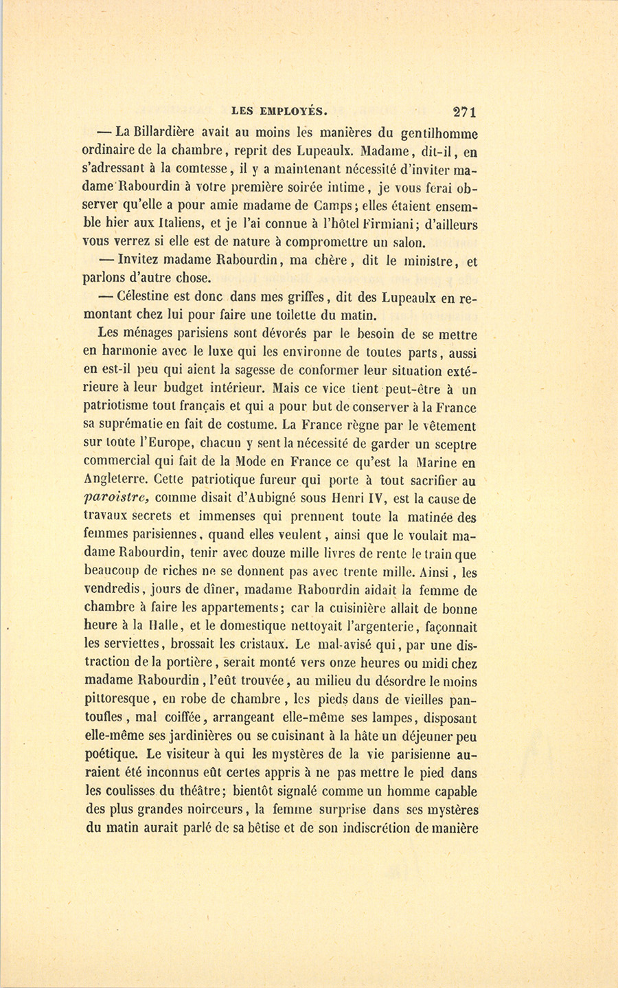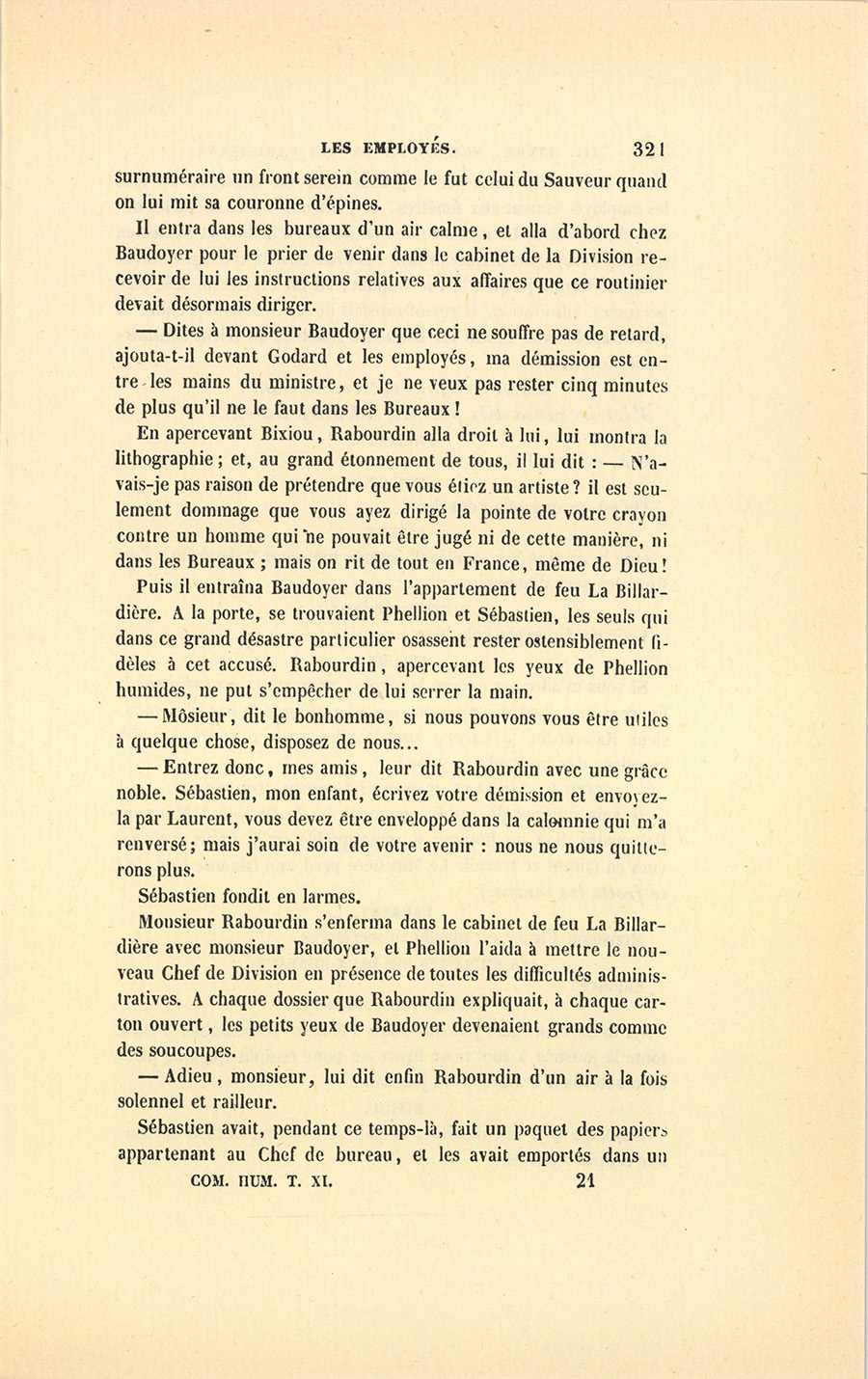 Profondément ému par les misères qu’il avait reconnues dans l’existence des employés, Xavier s’était demandé d’où venait leur croissante déconsidération ; il en avait recherché les {p. 142} causes, et les avait trouvées dans ces petites révolutions partielles qui furent comme le remous de la tempête de 1789 et que les historiens des grands mouvements sociaux négligent d’examiner, quoiqu’en définitif elles ayent fait nos mœurs ce qu’elles sont.