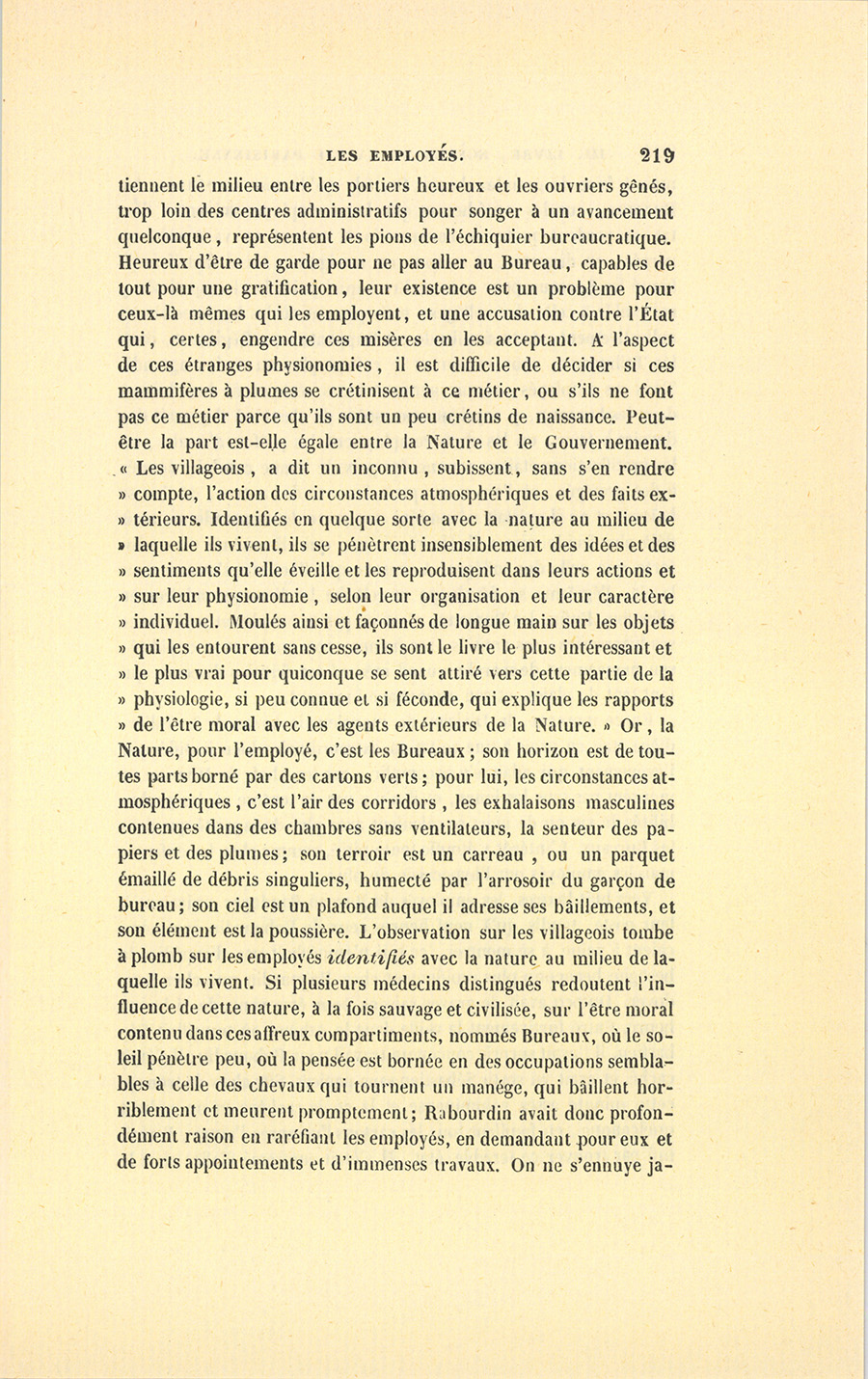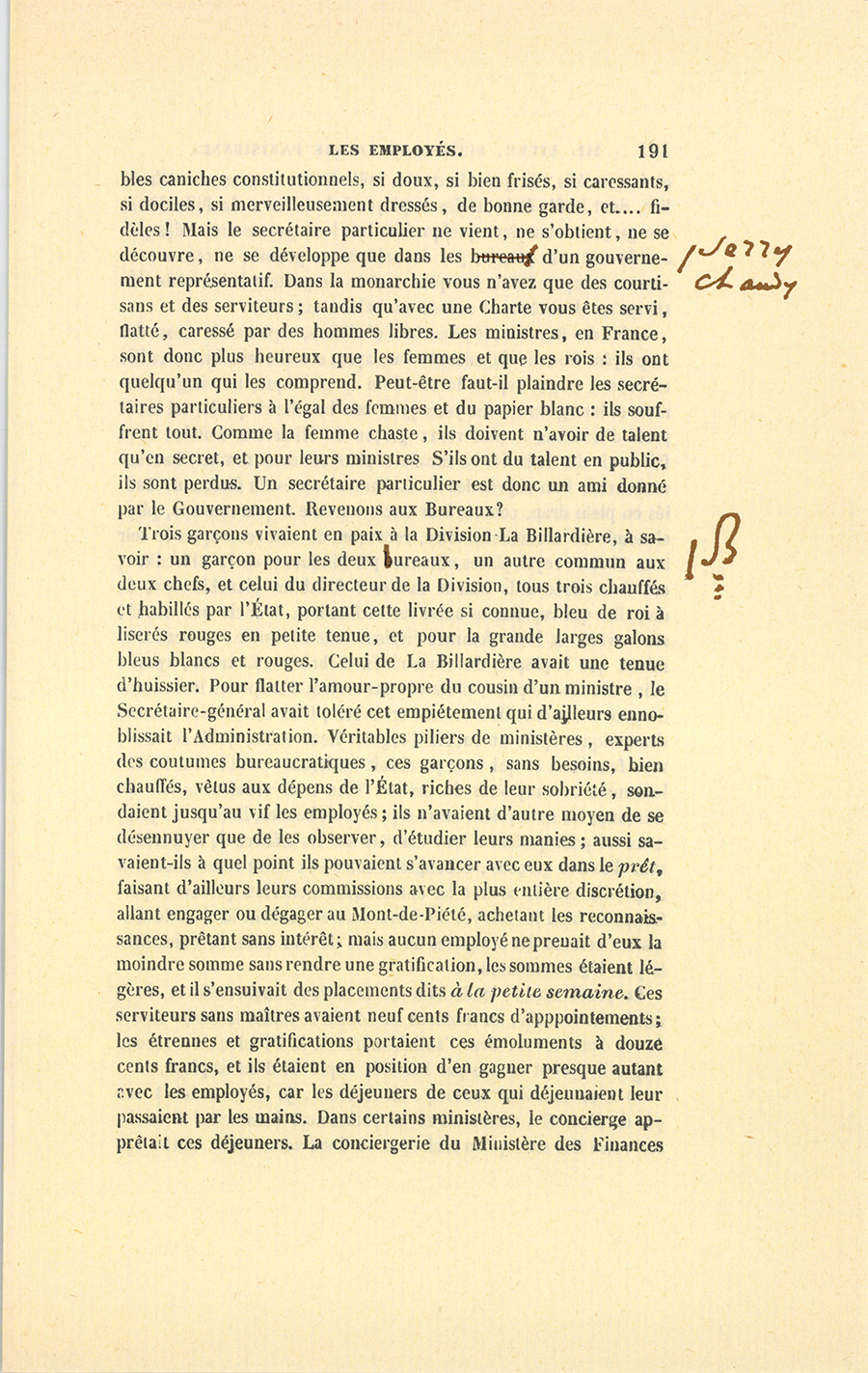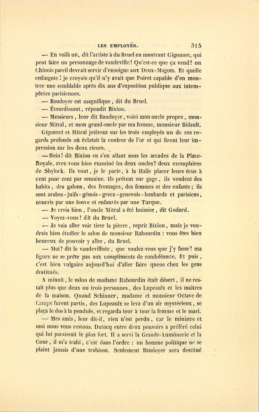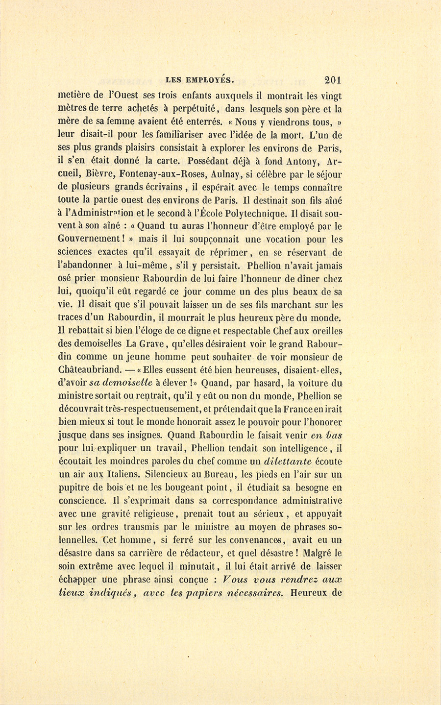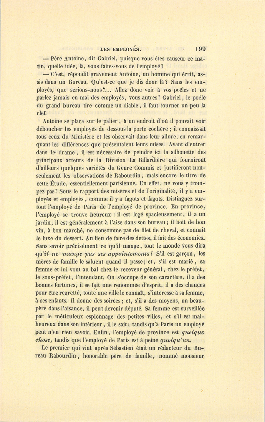 Profondément ému par les misères qu’il avait reconnues dans l’existence des employés, Xavier s’était demandé d’où venait leur croissante déconsidération ; il en avait recherché les {p. 142} causes, et les avait trouvées dans ces petites révolutions partielles qui furent comme le remous de la tempête de 1789 et que les historiens des grands mouvements sociaux négligent d’examiner, quoiqu’en définitif elles ayent fait nos mœurs ce qu’elles sont.