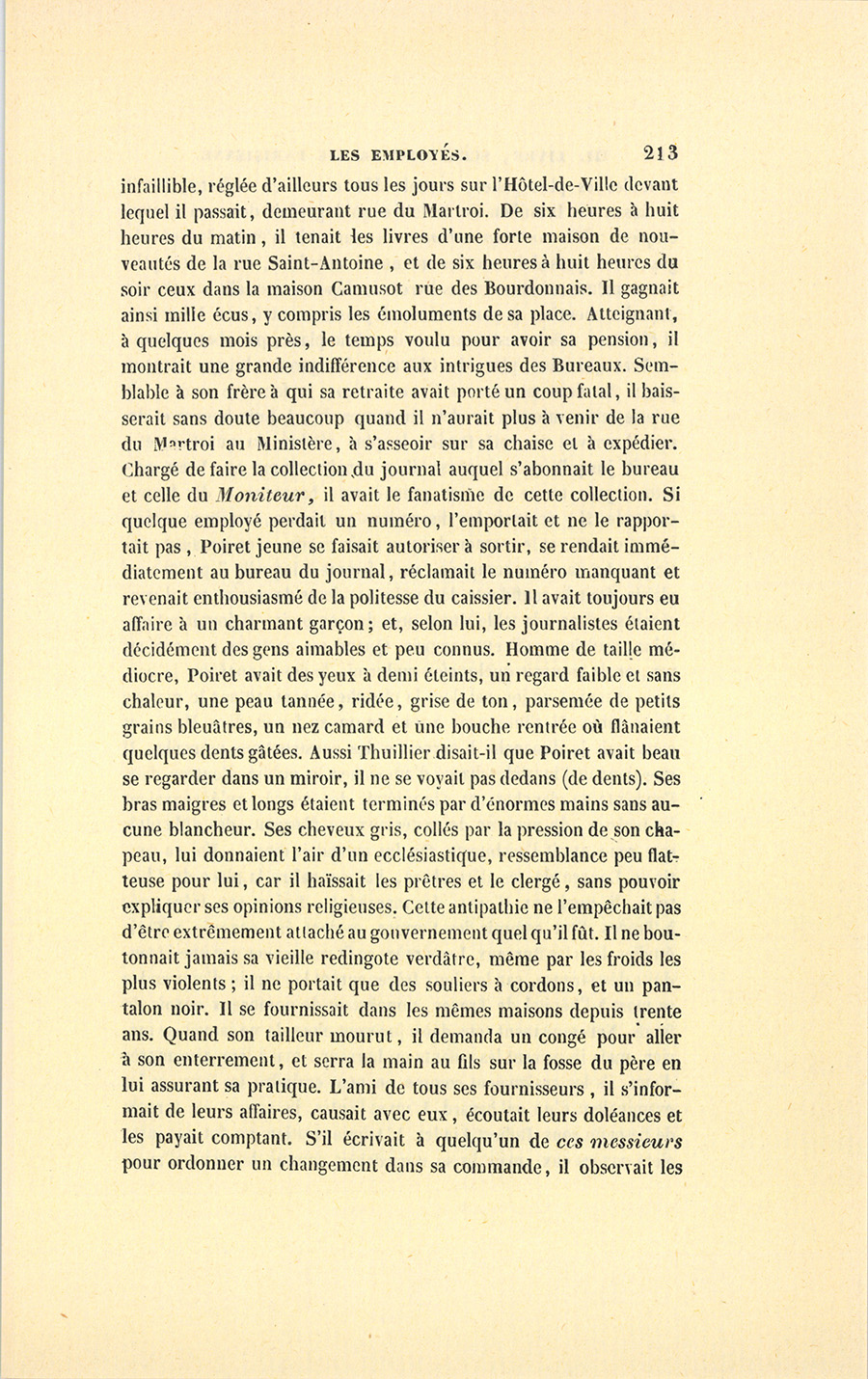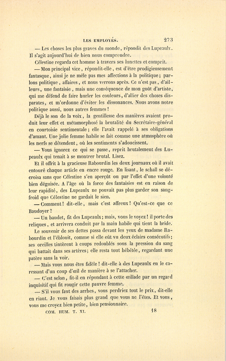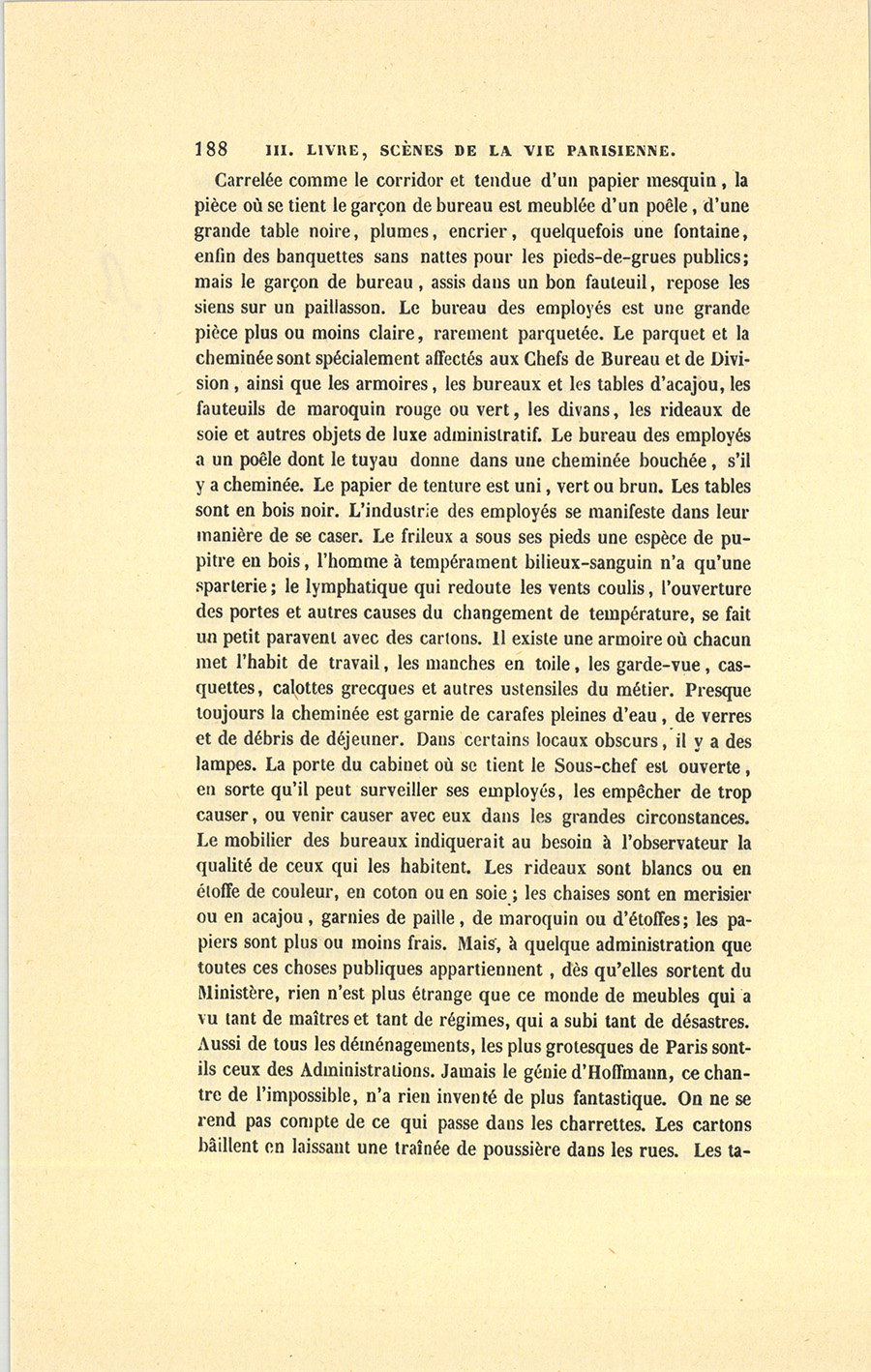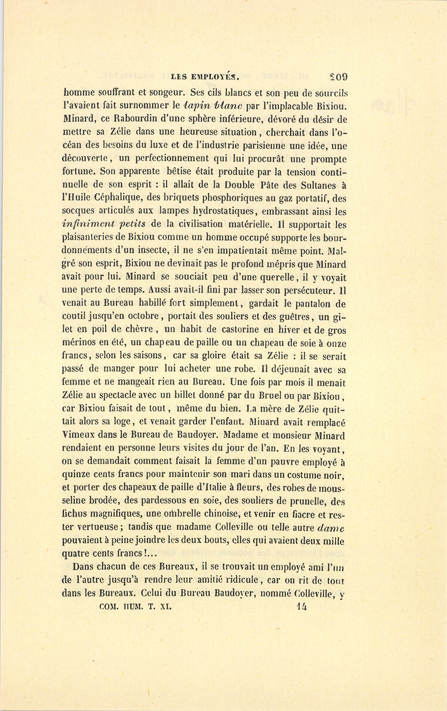 Profondément ému par les misères qu’il avait reconnues dans l’existence des employés, Xavier s’était demandé d’où venait leur croissante déconsidération ; il en avait recherché les {p. 142} causes, et les avait trouvées dans ces petites révolutions partielles qui furent comme le remous de la tempête de 1789 et que les historiens des grands mouvements sociaux négligent d’examiner, quoiqu’en définitif elles ayent fait nos mœurs ce qu’elles sont.