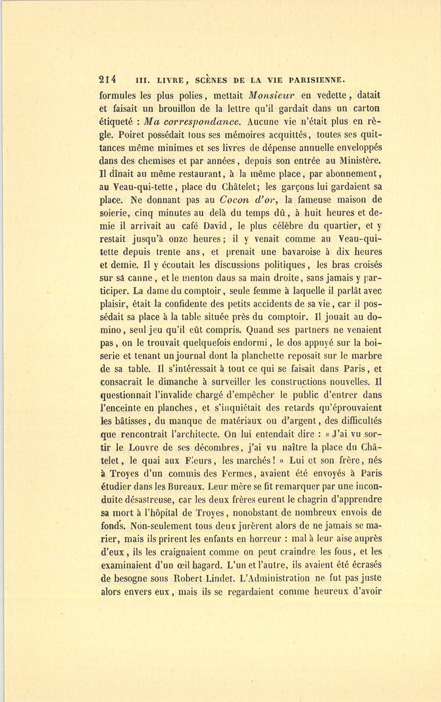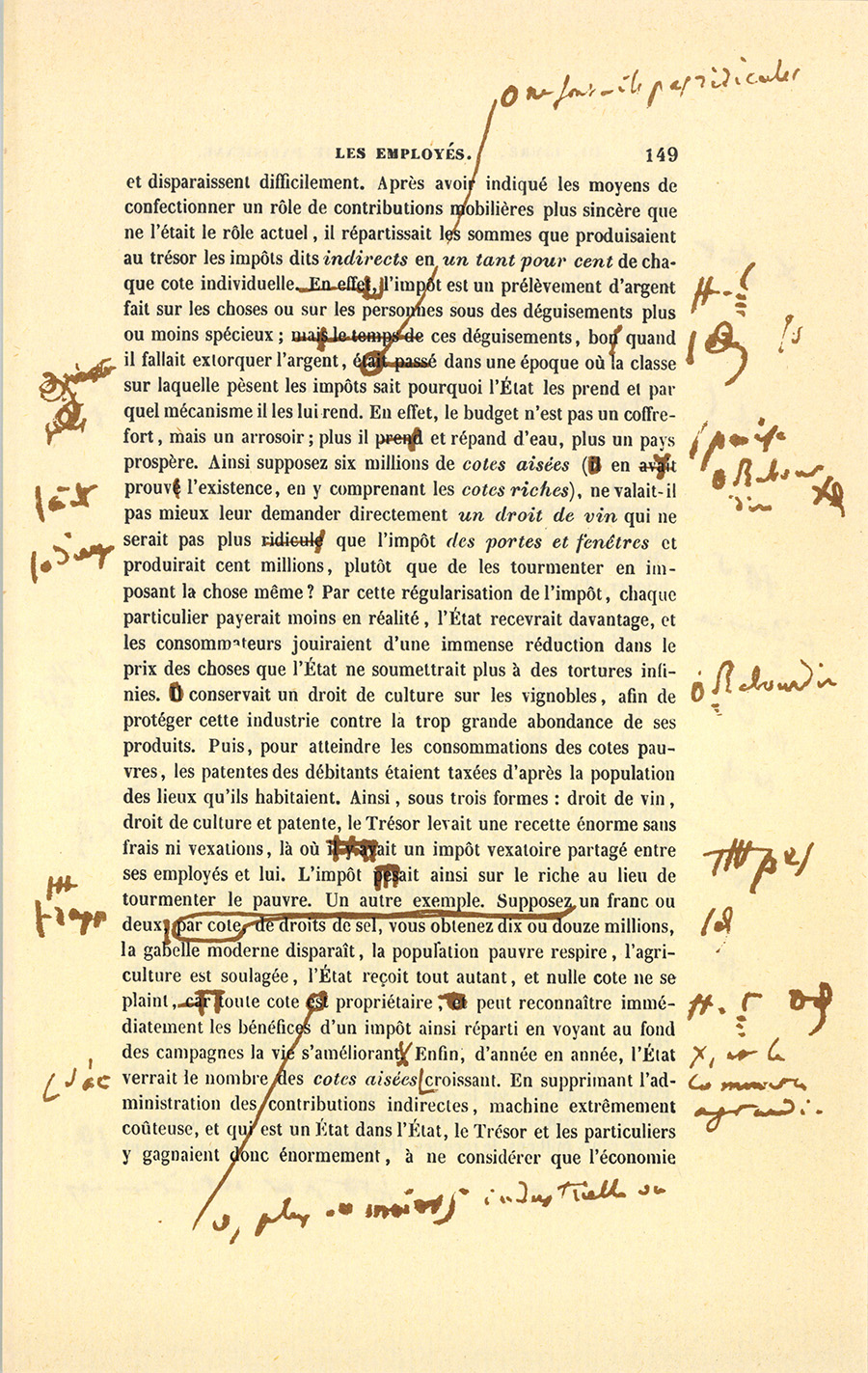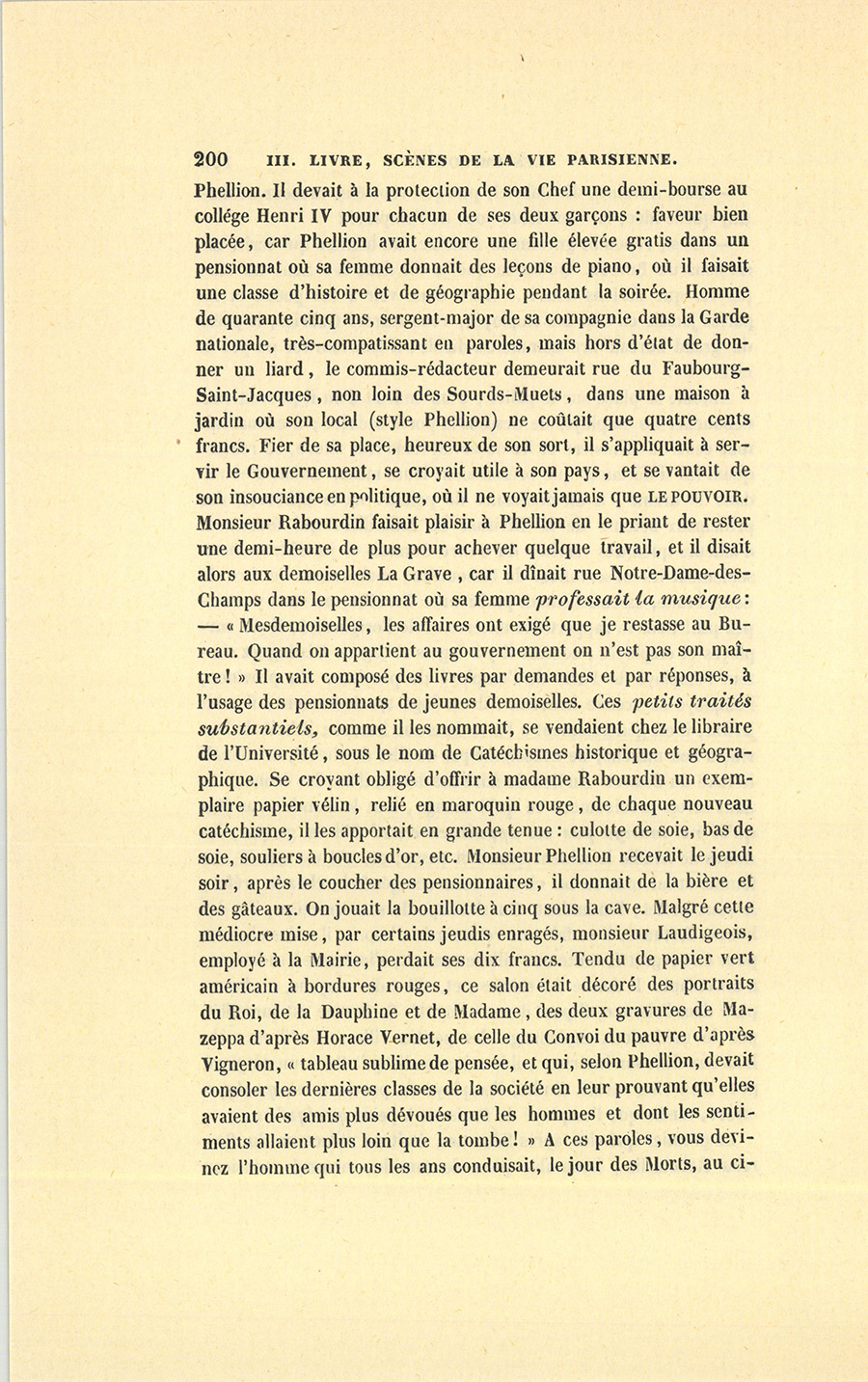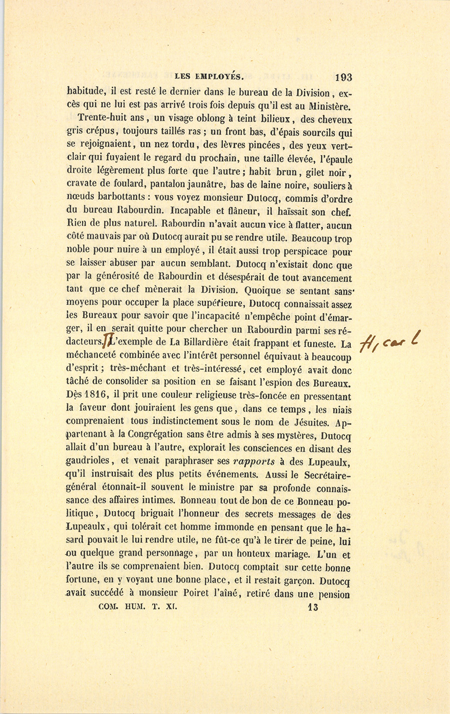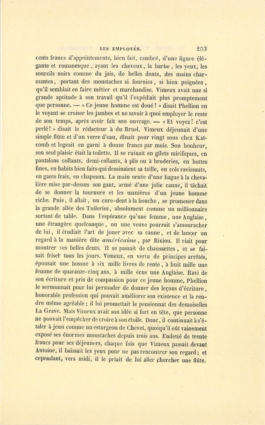 Profondément ému par les misères qu’il avait reconnues dans l’existence des employés, Xavier s’était demandé d’où venait leur croissante déconsidération ; il en avait recherché les {p. 142} causes, et les avait trouvées dans ces petites révolutions partielles qui furent comme le remous de la tempête de 1789 et que les historiens des grands mouvements sociaux négligent d’examiner, quoiqu’en définitif elles ayent fait nos mœurs ce qu’elles sont.