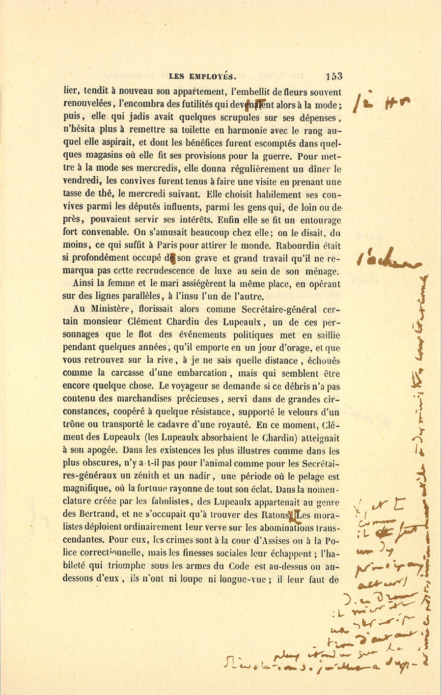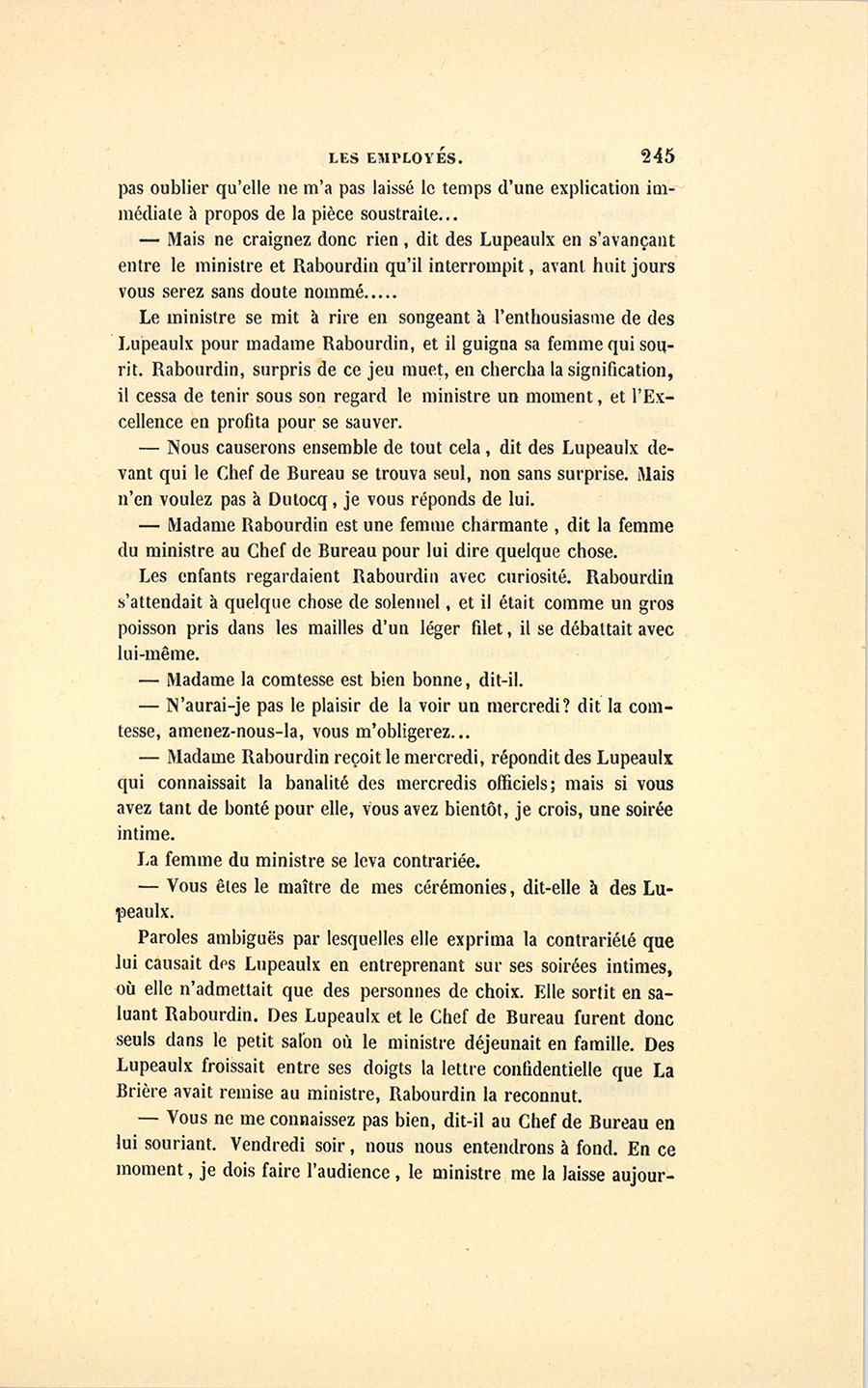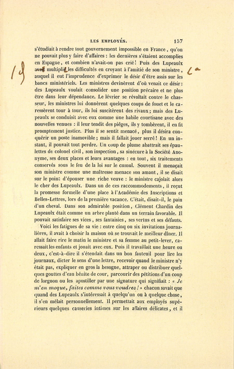 Au Ministère, florissait alors comme Secrétaire-général certain monsieur Clément Chardin des Lupeaulx, un de ces personnages que le flot des événements politiques met en saillie pendant quelques années, qu’il emporte en un jour d’orage, et que vous retrouvez sur la rive, à je ne sais quelle distance, échoués comme la carcasse d’une embarcation, mais qui semblent être encore quelque chose. Le voyageur se demande si ce débris n’a pas contenu des marchandises précieuses, servi dans de grandes circonstances, coopéré à quelque résistance, supporté le velours d’un trône ou transporté le cadavre d’une royauté. En ce moment, Clément des Lupeaulx (les Lupeaulx absorbaient le Chardin) atteignait à son apogée. Dans les existences les plus illustres comme dans les plus obscures, n’y a-t-il pas pour l’animal comme pour les Secrétaires-généraux un zénith et un nadir, une période où le pelage est magnifique, où la fortune rayonne de tout son éclat. Dans la nomenclature créée par les fabulistes, des Lupeaulx appartenait au genre des Bertrand, et ne s’occupait qu’à trouver des Ratons et comme il fut un des principaux acteurs de ce drame, il mérite une description d’autant plus étendue que la Révolution de juillet a supprimé ce poste, éminemment utile à des ministres constitutionnels.