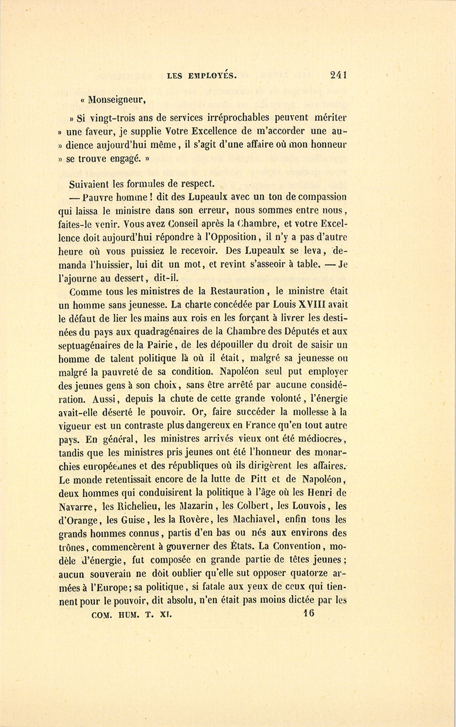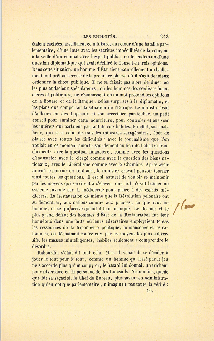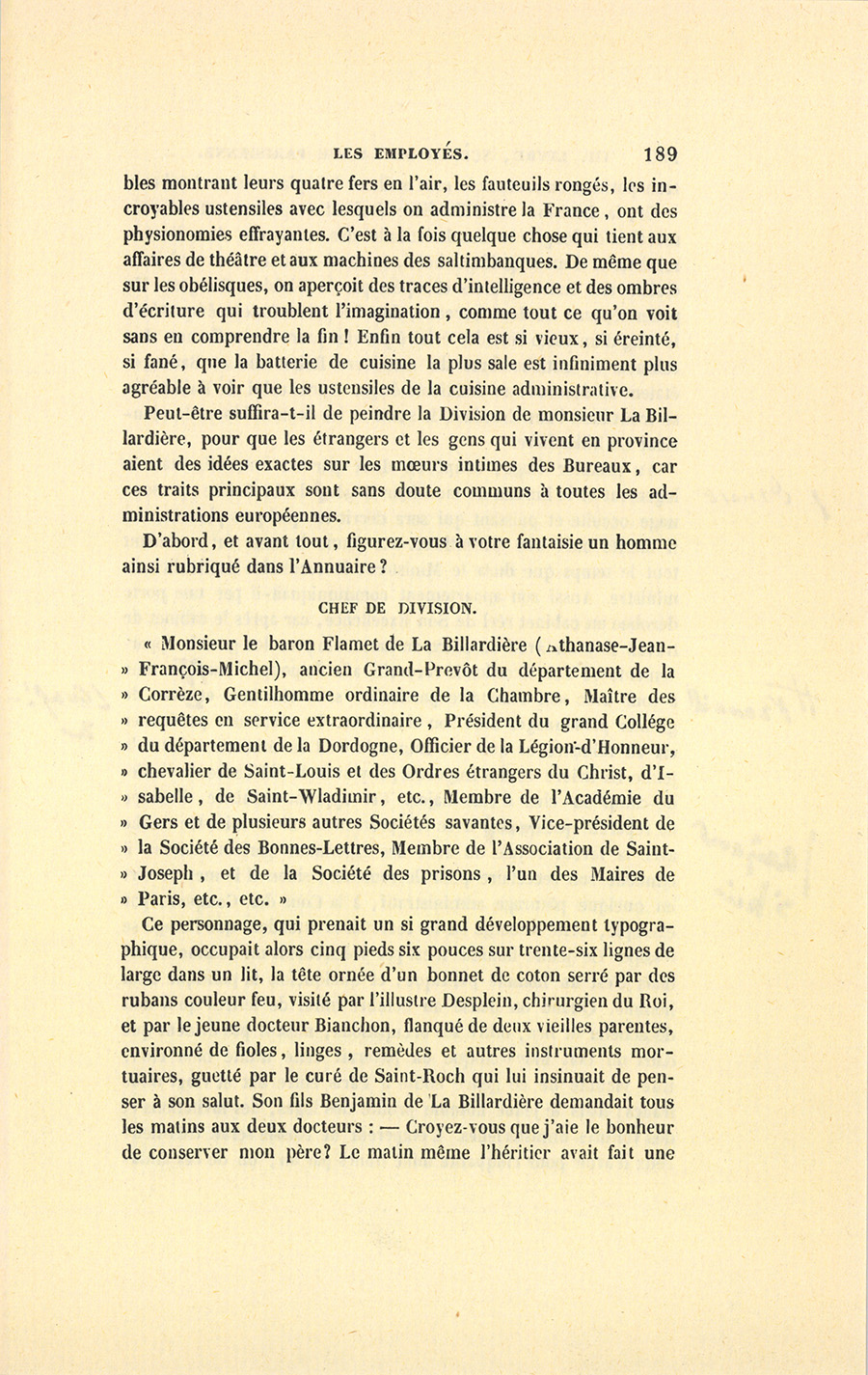 Au Ministère, florissait alors comme Secrétaire-général certain monsieur Clément Chardin des Lupeaulx, un de ces personnages que le flot des événements politiques met en saillie pendant quelques années, qu’il emporte en un jour d’orage, et que vous retrouvez sur la rive, à je ne sais quelle distance, échoués comme la carcasse d’une embarcation, mais qui semblent être encore quelque chose. Le voyageur se demande si ce débris n’a pas contenu des marchandises précieuses, servi dans de grandes circonstances, coopéré à quelque résistance, supporté le velours d’un trône ou transporté le cadavre d’une royauté. En ce moment, Clément des Lupeaulx (les Lupeaulx absorbaient le Chardin) atteignait à son apogée. Dans les existences les plus illustres comme dans les plus obscures, n’y a-t-il pas pour l’animal comme pour les Secrétaires-généraux un zénith et un nadir, une période où le pelage est magnifique, où la fortune rayonne de tout son éclat. Dans la nomenclature créée par les fabulistes, des Lupeaulx appartenait au genre des Bertrand, et ne s’occupait qu’à trouver des Ratons et comme il fut un des principaux acteurs de ce drame, il mérite une description d’autant plus étendue que la Révolution de juillet a supprimé ce poste, éminemment utile à des ministres constitutionnels.