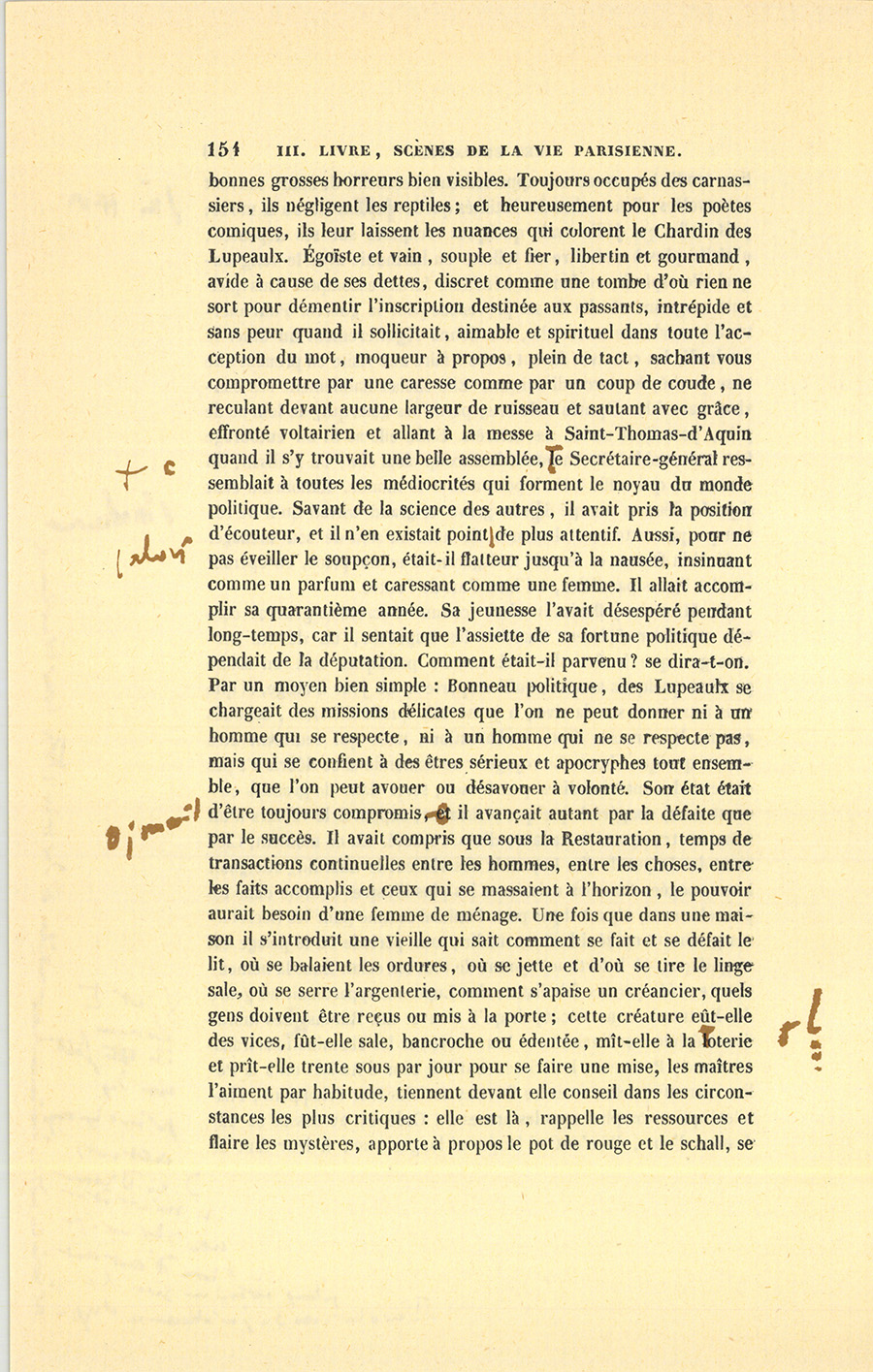 Les moralistes déploient ordinairement leur verve sur les abominations transcendantes. Pour eux, les crimes sont à la cour d’Assises ou à la Police correctionnelle, mais les finesses sociales leur échappent ; l’habileté qui triomphe sous les armes du Code est au-dessus ou au-dessous d’eux, ils n’ont ni loupe ni longue-vue ; il leur faut de {p. 154} bonnes grosses horreurs bien visibles. Toujours occupés des carnassiers, ils négligent les reptiles ; et heureusement pour les poètes comiques, ils leur laissent les nuances qui colorent le Chardin des Lupeaulx. Égoïste et vain, souple et fier, libertin et gourmand, avide à cause de ses dettes, discret comme une tombe d’où rien ne sort pour démentir l’inscription destinée aux passants, intrépide et sans peur quand il sollicitait, aimable et spirituel dans toute l’acception du mot, moqueur à propos, plein de tact, sachant vous compromettre par une caresse comme par un coup de coude, ne reculant devant aucune largeur de ruisseau et sautant avec grâce, effronté voltairien et allant à la messe à Saint-Thomas-d’Aquin quand il s’y trouvait une belle assemblée, ce Secrétaire-général ressemblait à toutes les médiocrités qui forment le noyau du monde politique. Savant de la science des autres, il avait pris la position d’écouteur, et il n’en existait point alors de plus attentif. Aussi, pour ne pas éveiller le soupçon, était-il flatteur jusqu’à la nausée, insinuant comme un parfum et caressant comme une femme. Il allait accomplir sa quarantième année. Sa jeunesse l’avait désespéré pendant long-temps, car il sentait que l’assiette de sa fortune politique dépendait de la députation. Comment était-il parvenu ? se dira-t-on. Par un moyen bien simple : Bonneau politique, des Lupeaulx se chargeait des missions délicates que l’on ne peut donner ni à un homme qui se respecte, ni à un homme qui ne se respecte pas, mais qui se confient à des êtres sérieux et apocryphes tout ensemble, que l’on peut avouer ou désavouer à volonté. Son état était d’être toujours compromis ; mais il avançait autant par la défaite que par le succès. Il avait compris que sous la Restauration, temps de transactions continuelles entre les hommes, entre les choses, entre les faits accomplis et ceux qui se massaient à l’horizon, le pouvoir aurait besoin d’une femme de ménage. Une fois que dans une maison il s’introduit une vieille qui sait comment se fait et se défait le lit, où se balaient les ordures, où se jette et d’où se tire le linge sale, où se serre l’argenterie, comment s’apaise un créancier, quels gens doivent être reçus ou mis à la porte ; cette créature eût-elle des vices, fût-elle sale, bancroche ou édentée, mît-elle à la Loterie et prît-elle trente sous par jour pour se faire une mise, les maîtres l’aiment par habitude, tiennent devant elle conseil dans les circonstances les plus critiques : elle est là, rappelle les ressources et flaire les mystères, apporte à propos le pot de rouge et le schall, se {p. 155} laisse gronder, rouler par les escaliers, et le lendemain, au réveil présente gaiement un excellent consommé. Quelque grand que soit un homme d’État, il a besoin d’une femme de ménage avec laquelle il puisse être faible, indécis, disputailleur avec son propre destin, s’interroger, se répondre et s’enhardir au combat. N’est-ce pas comme le bois mou des Sauvages, qui, frotté contre du bois dur, donne le feu ? Beaucoup de génies s’allument ainsi. Napoléon faisait ménage avec Berthier, et Richelieu avec le père Joseph. Des Lupeaulx faisait ménage avec tout le monde. Il restait l’ami des ministres déchus en se constituant leur intermédiaire auprès de ceux qui arrivaient, embaumant ainsi la dernière flatterie et parfumant le premier compliment. Il entendait d’ailleurs admirablement les petites choses auxquelles un homme d’état n’a pas le loisir de songer : il comprenait une nécessité, il obéissait bien ; il relevait sa bassesse en en plaisantant le premier afin d’en relever tout le prix, et choisissait toujours dans les services à rendre celui que l’on n’oublierait pas. Ainsi, quand il fallut franchir le fossé qui sépara l’Empire de la Restauration, quand chacun cherchait une planche pour le passer, au moment où les roquets de l’Empire se ruaient dans un dévouement de paroles, des Lupeaulx passait la frontière après avoir emprunté de fortes sommes à des usuriers. Jouant le tout pour le tout, il racheta les créances les plus criardes sur le roi Louis XVIII, et liquida par ce moyen, lui le premier, près de trois millions à vingt pour cent ; car il eut le bonheur d’opérer à cheval sur 1814 et sur 1815. Les bénéfices furent dévorés par les sieurs Gobseck, Werbrust et Gigonnet, croupiers de l’entreprise ; mais des Lupeaulx les leur avait promis, il ne jouait pas une mise, il jouait toute la banque, en sachant bien que Louis XVIII n’était pas homme à oublier cette lessive. Des Lupeaulx fut nommé Maître des requêtes, chevalier de Saint-Louis et officier de la Légion-d’Honneur. Une fois grimpé, l’homme habile chercha les moyens de se maintenir sur son échelon ; car, dans la place forte où il s’était introduit, les généraux ne conservent pas long-temps les bouches inutiles. Aussi, à son métier de ménagère et d’entremetteur, avait-il joint la consultation gratuite dans les maladies secrètes du pouvoir. Après avoir reconnu chez les prétendues supériorités de la Restauration une profonde infériorité relativement aux événements qui les dominaient, il imposa leur médiocrité politique en leur apportant, leur vendant au milieu {p. 156} d’une crise ce mot d’ordre que les gens de talent écoutent dans l’avenir. Ne croyez point que ceci vînt de lui-même ; autrement, des Lupeaulx eût été un homme de génie, et ce n’était qu’un homme d’esprit. Ce
