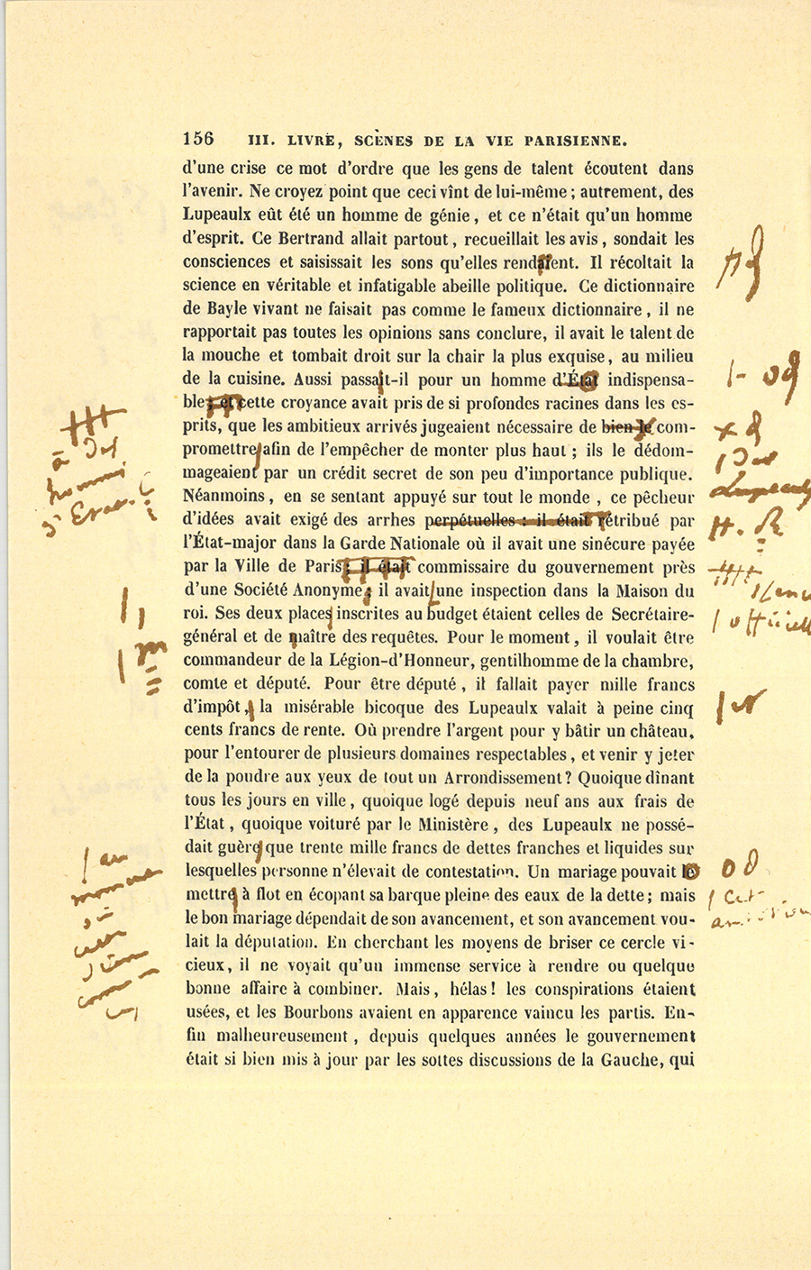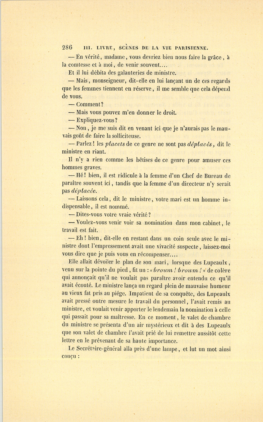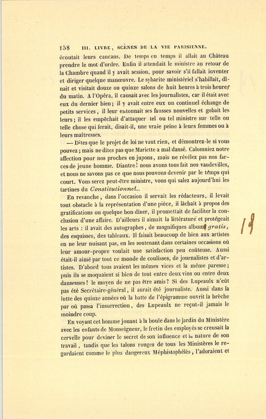 Voici les fatigues de sa vie : entre cinq ou six invitations journalières, il avait à choisir la maison où se trouvait le meilleur dîner. Il allait faire rire le matin le ministre et sa femme au petit-lever, caressait les enfants et jouait avec eux. Puis il travaillait une heure ou deux, c’est-à-dire il s’étendait dans un bon fauteuil pour lire les journaux, dicter le sens d’une lettre, recevoir quand le ministre n’y était pas, expliquer en gros la besogne, attraper ou distribuer quelques gouttes d’eau bénite de cour, parcourir des pétitions d’un coup de lorgnon ou les apostiller par une signature qui signifiait : « Je m’en moque, faites comme vous voudrez ! » chacun savait que quand des Lupeaulx s’intéressait à quelqu’un ou à quelque chose, il s’en mêlait personnellement. Il permettait aux employés supérieurs quelques causeries intimes sur les affaires délicates, et il {p. 158} écoutait leurs cancans. De temps en temps il allait au Château prendre le mot d’ordre. Enfin il attendait le ministre au retour de la Chambre quand il y avait session, pour savoir s’il fallait inventer et diriger quelque manœuvre. Le sybarite ministériel s’habillait, dînait et visitait douze ou quinze salons de huit heures à trois heures du matin. À l’Opéra, il causait avec les journalistes, car il était avec eux du dernier bien ; il y avait entre eux un continuel échange de petits services, il leur entonnait ses fausses nouvelles et gobait les leurs ; il les empêchait d’attaquer tel ou tel ministre sur telle ou telle chose qui ferait, disait-il, une vraie peine à leurs femmes ou à leurs maîtresses.