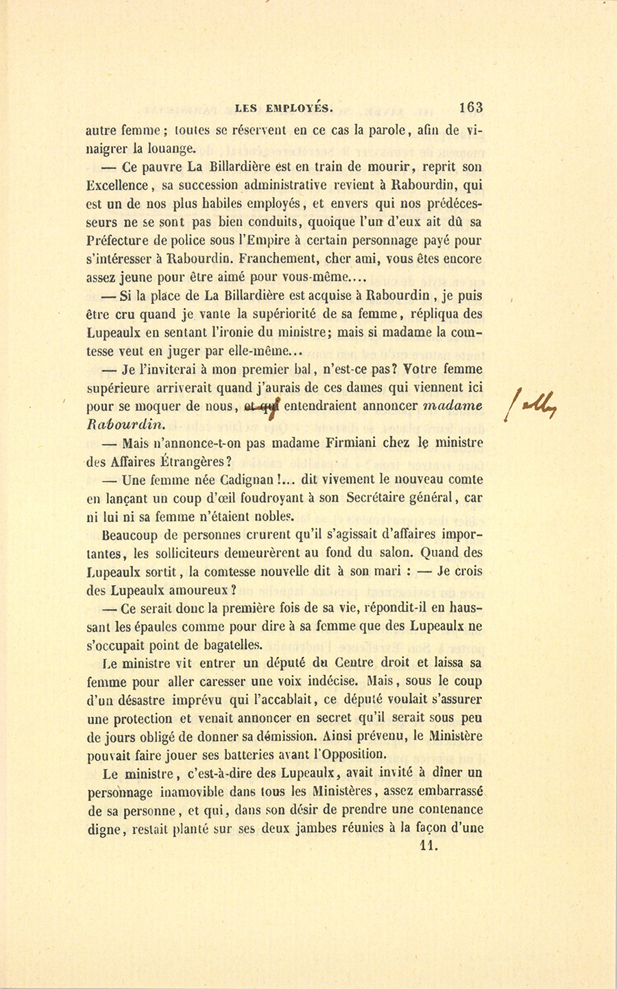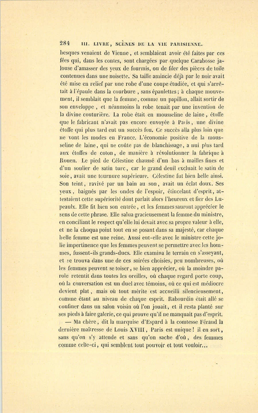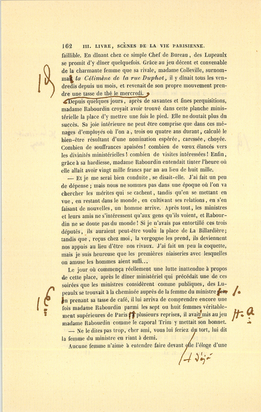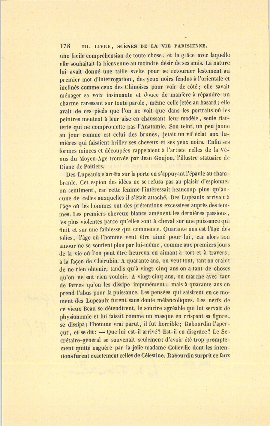 À onze heures, au moment où tout était calme à la Place-Royale, monsieur des Lupeaulx quittait l’Opéra pour venir rue Duphot. Ce mercredi fut un des plus brillants de madame Rabourdin. Plusieurs de ses habitués revinrent du théâtre et augmentèrent les groupes formés dans ses salons et où se remarquaient plusieurs célébrités : Canalis le poète, le peintre Schinner, le docteur Bianchon, Lucien de Rubempré, Octave de Camps, le comte de Granville, le vicomte de Fontaine, du Bruel le vaudevilliste, Andoche Finot le journaliste, Derville, une des plus fortes têtes du palais, le comte4 du Châtelet, député, du Tillet le banquier, des jeunes gens élégants comme Paul de Manerville et le jeune vicomte de Portenduère. Célestine servait le thé quand le Secrétaire-général entra. Sa toilette lui allait bien ce soir-là : elle avait une robe de velours noir sans ornement, une écharpe de gaze noire, les cheveux bien lissés, relevés par une natte ronde, et de chaque côté les boucles tombant à l’anglaise. Ce qui distinguait cette femme, était le laissez-aller italien de l’artiste, {p. 178} une facile compréhension de toute chose, et la grâce avec laquelle elle souhaitait la bienvenue au moindre désir de ses amis. La nature lui avait donné une taille svelte pour se retourner lestement au premier mot d’interrogation, des yeux noirs fendus à l’orientale et inclinés comme ceux des Chinoises pour voir de côté ; elle savait ménager sa voix insinuante et douce de manière à répandre un charme caressant sur toute parole, même celle jetée au hasard ; elle avait de ces pieds que l’on ne voit que dans les portraits où les peintres mentent à leur aise en chaussant leur modèle, seule flatterie qui ne compromette pas l’Anatomie. Son teint, un peu jaune au jour comme est celui des brunes, jetait un vif éclat aux lumières qui faisaient briller ses cheveux et ses yeux noirs. Enfin ses formes minces et découpées rappelaient à l’artiste celles de la Vénus du Moyen-Âge trouvée par Jean Goujon, l’illustre statuaire de Diane de Poitiers.