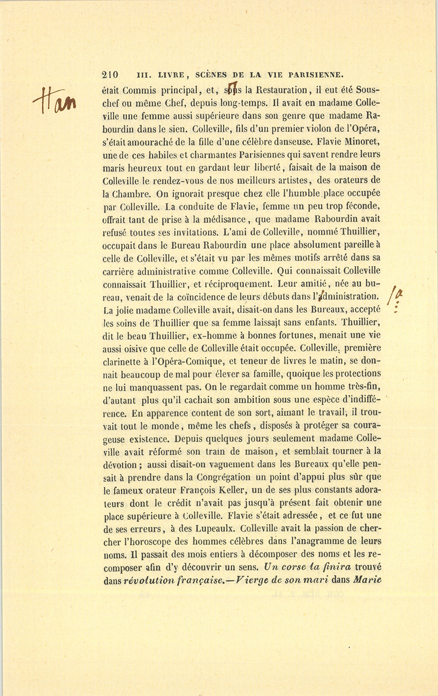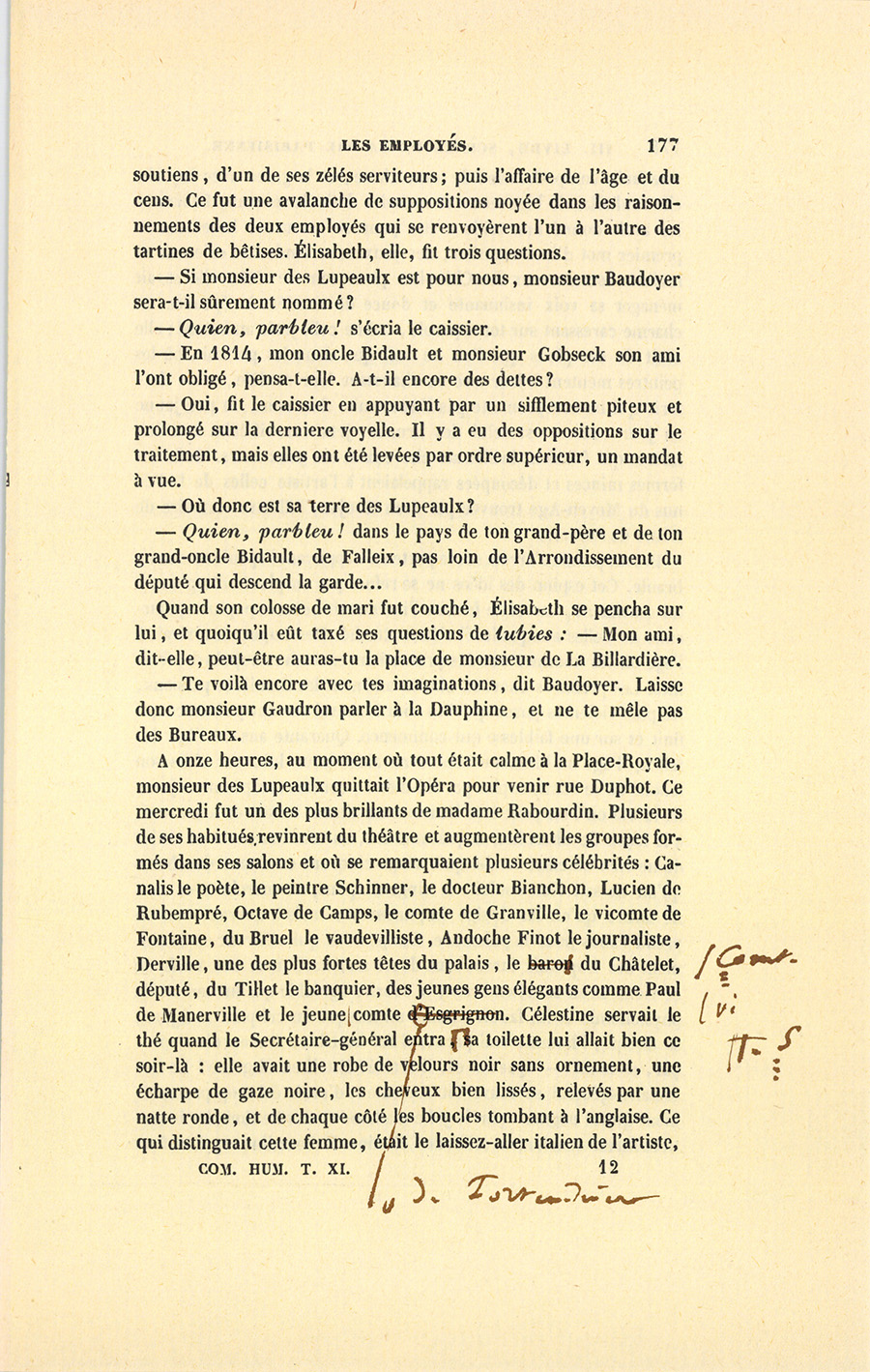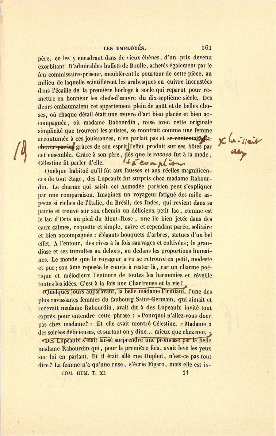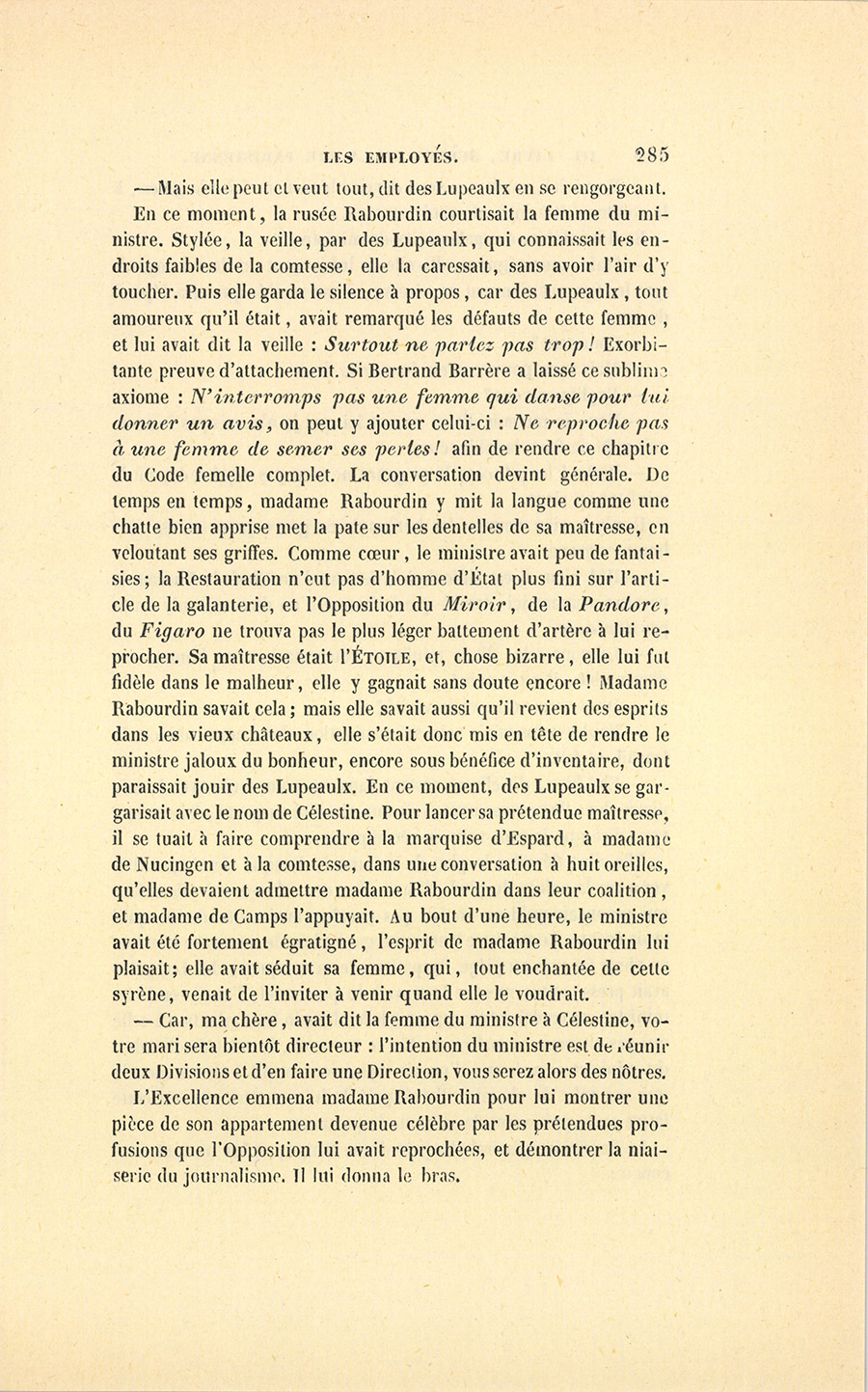 À onze heures, au moment où tout était calme à la Place-Royale, monsieur des Lupeaulx quittait l’Opéra pour venir rue Duphot. Ce mercredi fut un des plus brillants de madame Rabourdin. Plusieurs de ses habitués revinrent du théâtre et augmentèrent les groupes formés dans ses salons et où se remarquaient plusieurs célébrités : Canalis le poète, le peintre Schinner, le docteur Bianchon, Lucien de Rubempré, Octave de Camps, le comte de Granville, le vicomte de Fontaine, du Bruel le vaudevilliste, Andoche Finot le journaliste, Derville, une des plus fortes têtes du palais, le comte4 du Châtelet, député, du Tillet le banquier, des jeunes gens élégants comme Paul de Manerville et le jeune vicomte de Portenduère. Célestine servait le thé quand le Secrétaire-général entra. Sa toilette lui allait bien ce soir-là : elle avait une robe de velours noir sans ornement, une écharpe de gaze noire, les cheveux bien lissés, relevés par une natte ronde, et de chaque côté les boucles tombant à l’anglaise. Ce qui distinguait cette femme, était le laissez-aller italien de l’artiste, {p. 178} une facile compréhension de toute chose, et la grâce avec laquelle elle souhaitait la bienvenue au moindre désir de ses amis. La nature lui avait donné une taille svelte pour se retourner lestement au premier mot d’interrogation, des yeux noirs fendus à l’orientale et inclinés comme ceux des Chinoises pour voir de côté ; elle savait ménager sa voix insinuante et douce de manière à répandre un charme caressant sur toute parole, même celle jetée au hasard ; elle avait de ces pieds que l’on ne voit que dans les portraits où les peintres mentent à leur aise en chaussant leur modèle, seule flatterie qui ne compromette pas l’Anatomie. Son teint, un peu jaune au jour comme est celui des brunes, jetait un vif éclat aux lumières qui faisaient briller ses cheveux et ses yeux noirs. Enfin ses formes minces et découpées rappelaient à l’artiste celles de la Vénus du Moyen-Âge trouvée par Jean Goujon, l’illustre statuaire de Diane de Poitiers.