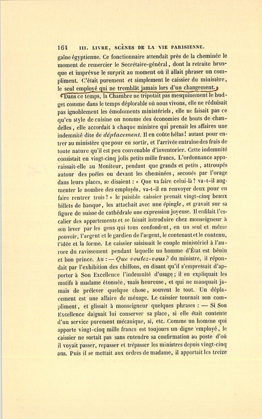 Le ministre, c’est-à-dire des Lupeaulx, avait invité à dîner un personnage inamovible dans tous les Ministères, assez embarrassé de sa personne, et qui, dans son désir de prendre une contenance digne, restait planté sur ses deux jambes réunies à la façon d’une {p. 164} gaîne égyptienne. Ce fonctionnaire attendait près de la cheminée le moment de remercier le Secrétaire-général, dont la retraite brusque et imprévue le surprit au moment où il allait phraser un compliment. C’était purement et simplement le caissier du ministère, le seul employé qui ne tremblât jamais lors d’un changement. Dans ce temps, la Chambre ne tripotait pas mesquinement le budget comme dans le temps déplorable où nous vivons, elle ne réduisait pas ignoblement les émoluments ministériels, elle ne faisait pas ce qu’en style de cuisine on nomme des économies de bouts de chandelles, elle accordait à chaque ministre qui prenait les affaires une indemnité dite de déplacement. Il en coûte hélas ! autant pour entrer au ministère que pour en sortir, et l’arrivée entraîne des frais de toute nature qu’il est peu convenable d’inventorier. Cette indemnité consistait en vingt-cinq jolis petits mille francs. L’ordonnance apparaissait-elle au Moniteur, pendant que grands et petits, attroupés autour des poêles ou devant les cheminées, secoués par l’orage dans leurs places, se disaient : « Que va faire celui-là ? va-t-il augmenter le nombre des employés, va-t-il en renvoyer deux pour en faire rentrer trois ? » le paisible caissier prenait vingt-cinq beaux billets de banque, les attachait avec une épingle, et gravait sur sa figure de suisse de cathédrale une expression joyeuse. Il enfilait l’escalier des appartements et se faisait introduire chez monseigneur à son lever par les gens qui tous confondent, en un seul et même pouvoir, l’argent et le gardien de l’argent, le contenant et le contenu, l’idée et la forme. Le caissier saisissait le couple ministériel à l’aurore du ravissement pendant laquelle un homme d’État est bénin et bon prince. Au : – Que voulez-vous ? du ministre, il répondait par l’exhibition des chiffons, en disant qu’il s’empressait d’apporter à Son Excellence l’indemnité d’usage ; il en expliquait les motifs à madame étonnée, mais heureuse, et qui ne manquait jamais de prélever quelque chose, souvent le tout. Un déplacement est une affaire de ménage. Le caissier tournait son compliment, et glissait à monseigneur quelques phrases : – Si Son Excellence daignait lui conserver sa place, si elle était contente d’un service purement mécanique, si, etc. Comme un homme qui apporte vingt-cinq mille francs est toujours un digne employé, le caissier ne sortait pas sans entendre sa confirmation au poste d’où il voyait passer, repasser et trépasser les ministres depuis vingt-cinq ans. Puis il se mettait aux ordres de madame, il apportait les treize {p. 165} mille francs du mois en temps utile, il les avançait ou les retardait à commandement, et se ménageait ainsi, suivant une vieille expression monastique, une voix au Chapitre.