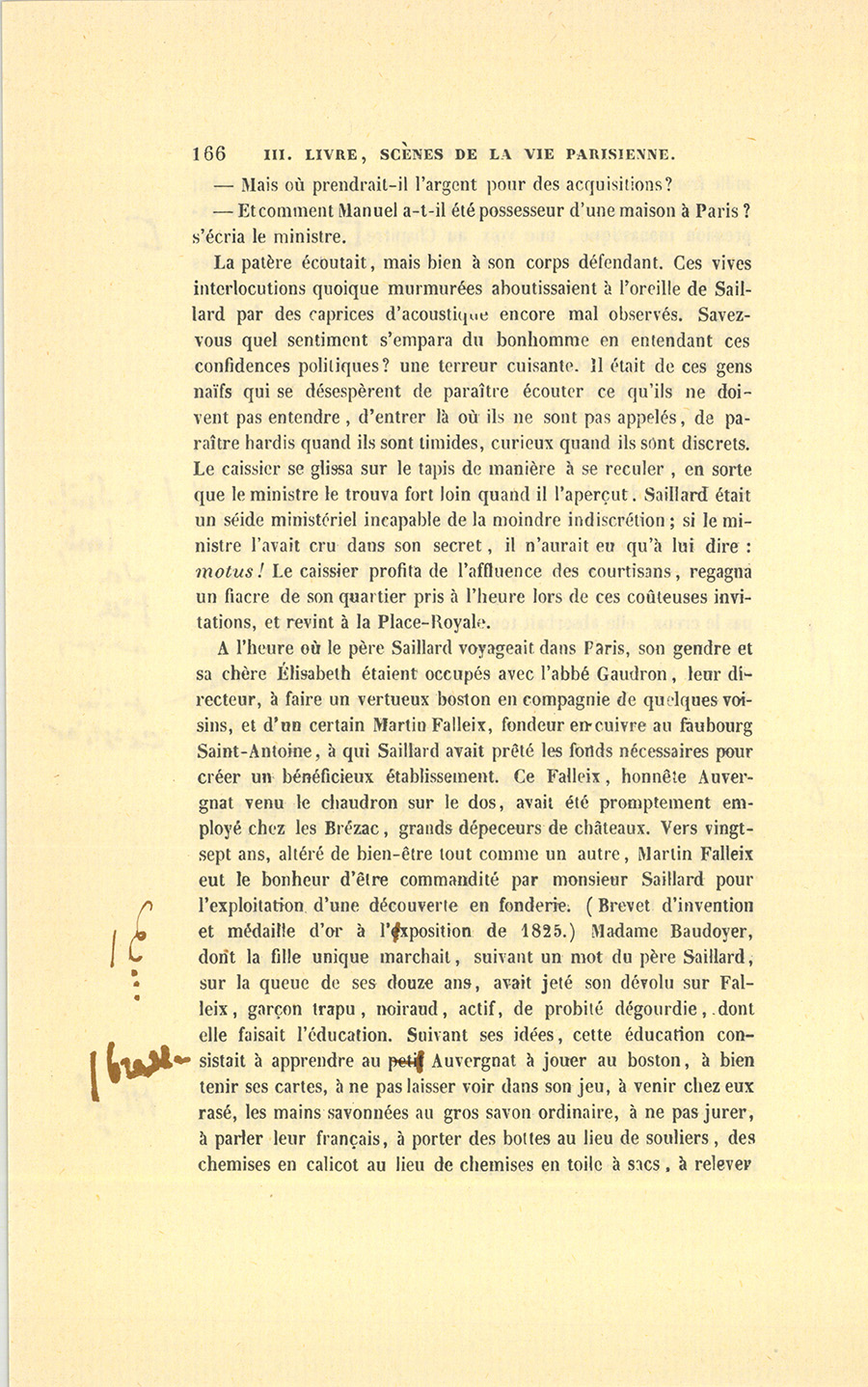 À l’heure où le père Saillard voyageait dans Paris, son gendre et sa chère Élisabeth étaient occupés avec l’abbé Gaudron, leur directeur, à faire un vertueux boston en compagnie de quelques voisins, et d’un certain Martin Falleix, fondeur en cuivre au faubourg Saint-Antoine, à qui Saillard avait prêté les fonds nécessaires pour créer un bénéficieux établissement. Ce Falleix, honnête Auvergnat venu le chaudron sur le dos, avait été promptement employé chez les Brézac, grands dépeceurs de châteaux. Vers vingt-sept ans, altéré de bien-être tout comme un autre, Martin Falleix eut le bonheur d’être commandité par monsieur Saillard pour l’exploitation d’une découverte en fonderie. (Brevet d’invention et médaille d’or à l’Exposition de 1825.) Madame Baudoyer, dont la fille unique marchait, suivant un mot du père Saillard, sur la queue de ses douze ans, avait jeté son dévolu sur Falleix, garçon trapu, noiraud, actif, de probité dégourdie, dont elle faisait l’éducation. Suivant ses idées, cette éducation consistait à apprendre au brave Auvergnat à jouer au boston, à bien tenir ses cartes, à ne pas laisser voir dans son jeu, à venir chez eux rasé, les mains savonnées au gros savon ordinaire, à ne pas jurer, à parler leur français, à porter des bottes au lieu de souliers, des chemises en calicot au lieu de chemises en toile à sacs, à relever {p. 167} ses cheveux au lieu de les tenir plats. Depuis huit jours, Élisabeth avait décidé Falleix à ôter de ses oreilles deux énormes anneaux plats, qui ressemblaient à des cerceaux.