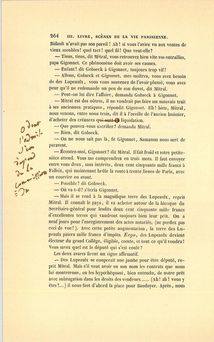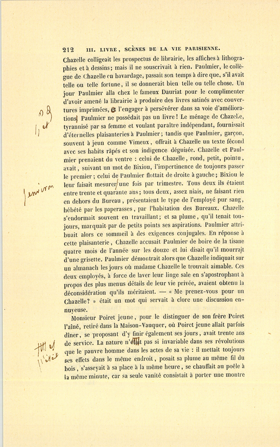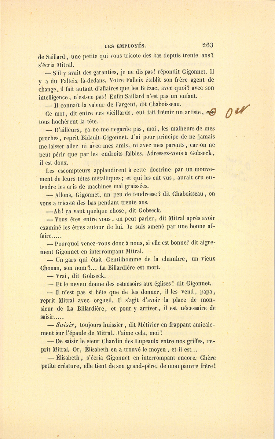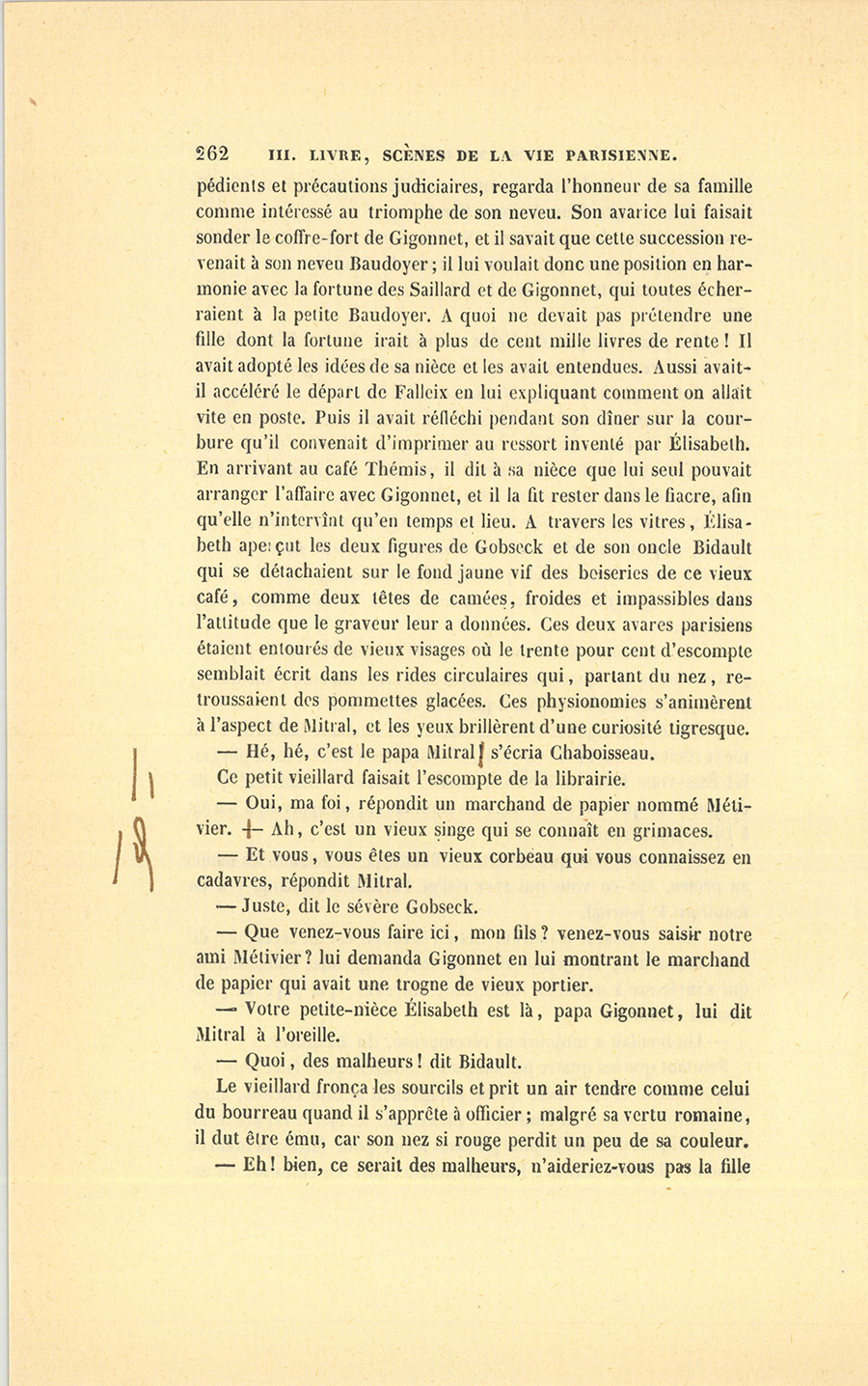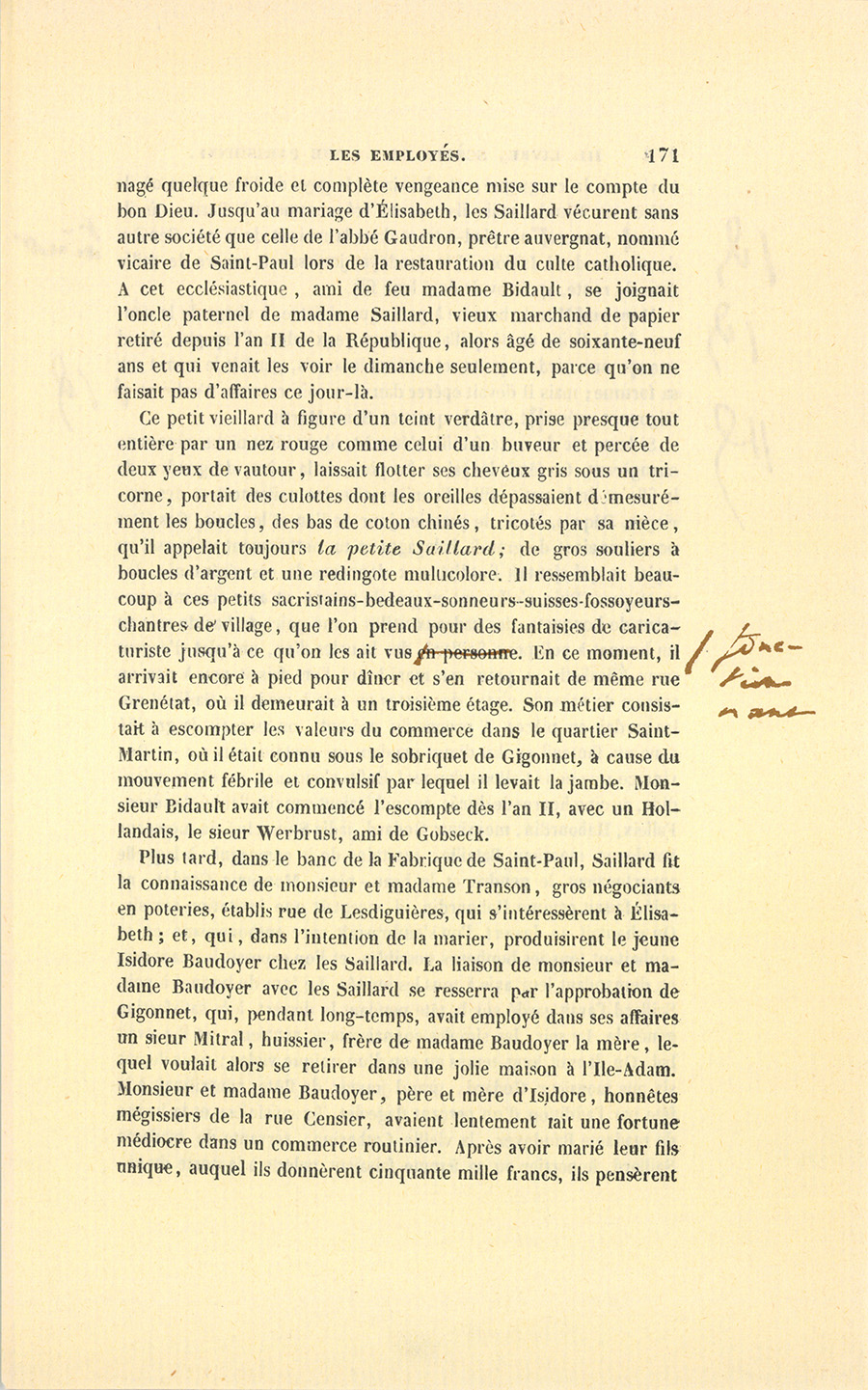 Ce petit vieillard à figure d’un teint verdâtre, prise presque tout entière par un nez rouge comme celui d’un buveur et percée de deux yeux de vautour, laissait flotter ses cheveux gris sous un tricorne, portait des culottes dont les oreilles dépassaient démesurément les boucles, des bas de coton chinés, tricotés par sa nièce, qu’il appelait toujours la petite Saillard ; de gros souliers à boucles d’argent et une redingote multicolore. Il ressemblait beaucoup à ces petits sacristains-bedeaux-sonneurs-suisses-fossoyeurs-chantres de village, que l’on prend pour des fantaisies de caricaturiste jusqu’à ce qu’on les ait vus fonctionnant. [ill.] En ce moment, il arrivait encore à pied pour dîner et s’en retournait de même rue Greneta3, où il demeurait à un troisième étage. Son métier consistait à escompter les valeurs du commerce dans le quartier Saint-Martin, où il était connu sous le sobriquet de Gigonnet, à cause du mouvement fébrile et convulsif par lequel il levait la jambe. Monsieur Bidault avait commencé l’escompte dès l’an II, avec un Hollandais, le sieur Werbrust, ami de Gobseck.