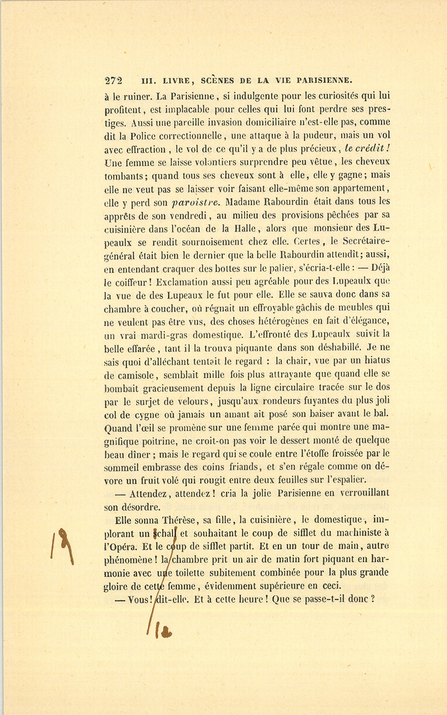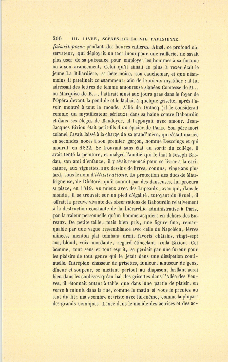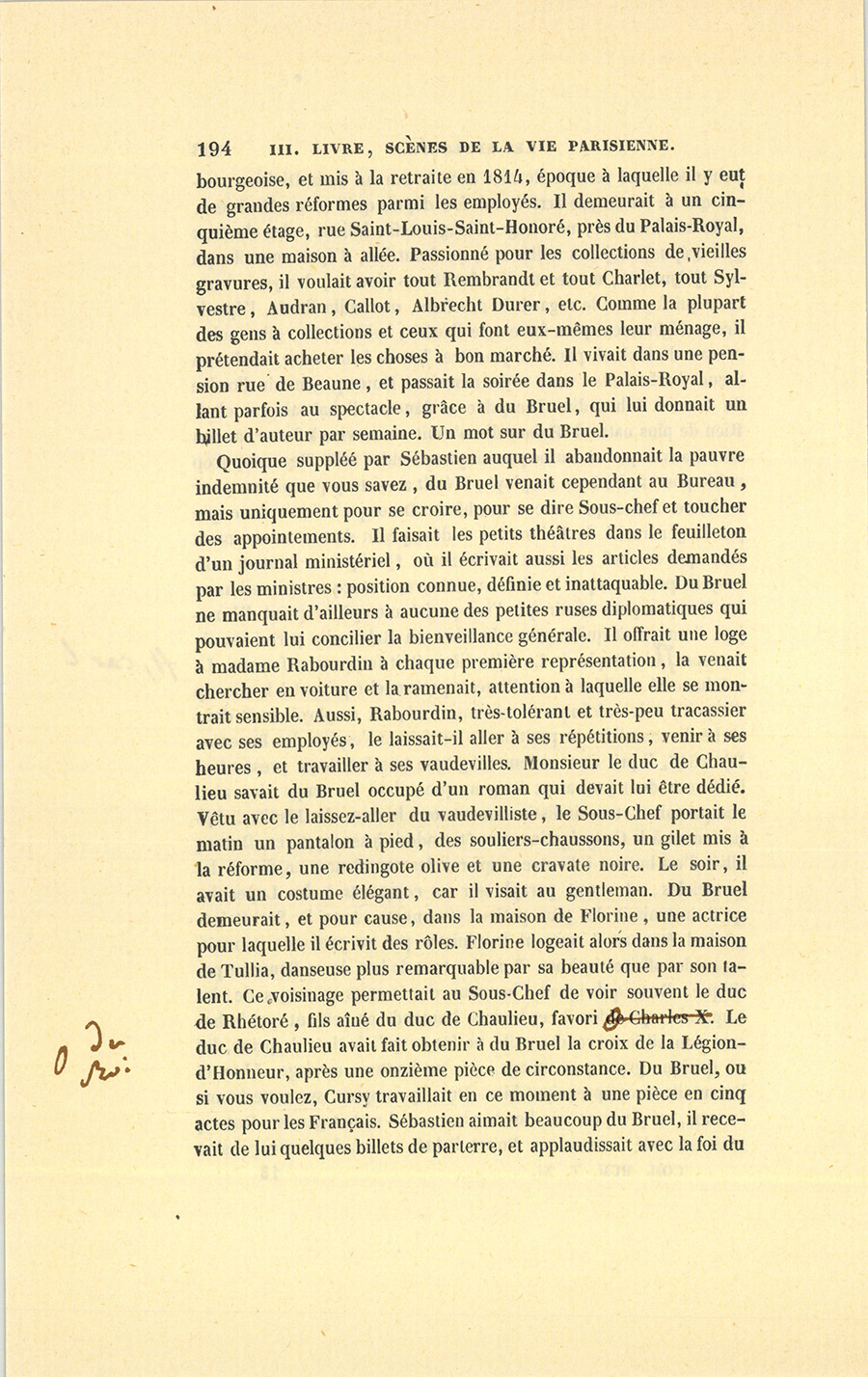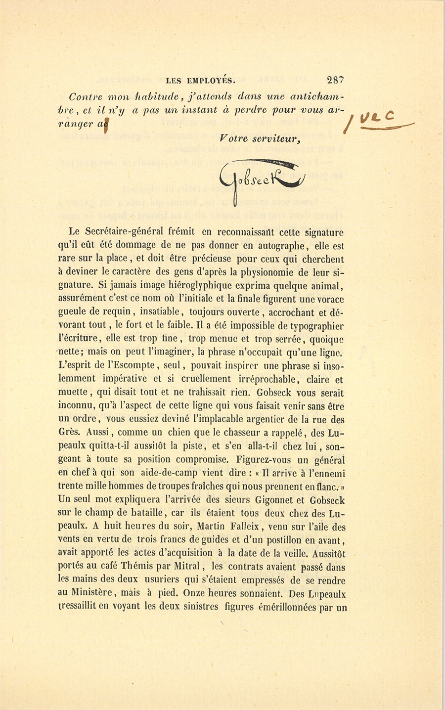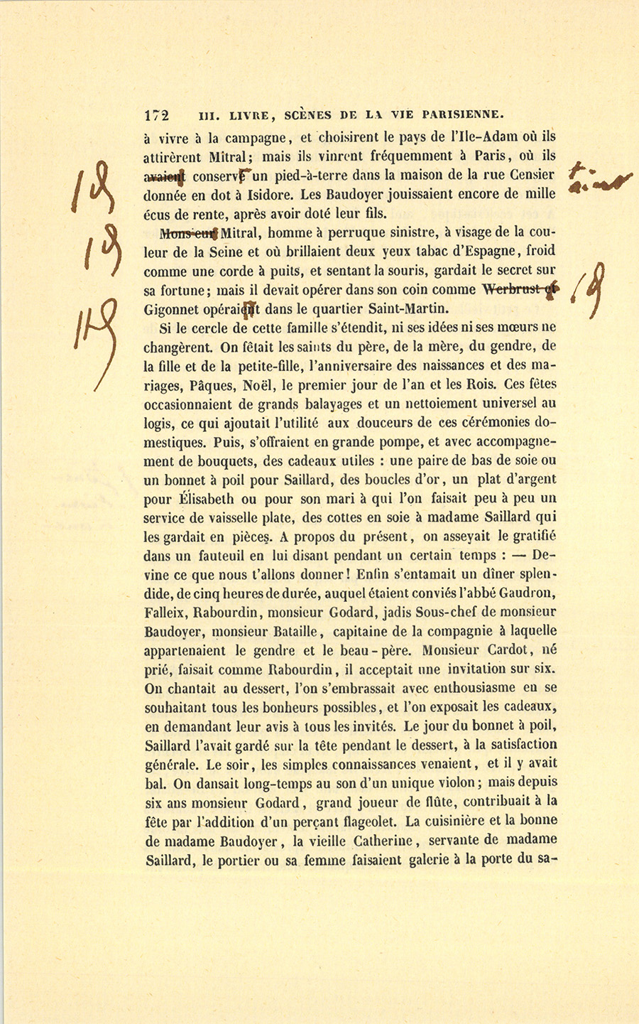 Ce petit vieillard à figure d’un teint verdâtre, prise presque tout entière par un nez rouge comme celui d’un buveur et percée de deux yeux de vautour, laissait flotter ses cheveux gris sous un tricorne, portait des culottes dont les oreilles dépassaient démesurément les boucles, des bas de coton chinés, tricotés par sa nièce, qu’il appelait toujours la petite Saillard ; de gros souliers à boucles d’argent et une redingote multicolore. Il ressemblait beaucoup à ces petits sacristains-bedeaux-sonneurs-suisses-fossoyeurs-chantres de village, que l’on prend pour des fantaisies de caricaturiste jusqu’à ce qu’on les ait vus fonctionnant. [ill.] En ce moment, il arrivait encore à pied pour dîner et s’en retournait de même rue Greneta3, où il demeurait à un troisième étage. Son métier consistait à escompter les valeurs du commerce dans le quartier Saint-Martin, où il était connu sous le sobriquet de Gigonnet, à cause du mouvement fébrile et convulsif par lequel il levait la jambe. Monsieur Bidault avait commencé l’escompte dès l’an II, avec un Hollandais, le sieur Werbrust, ami de Gobseck.