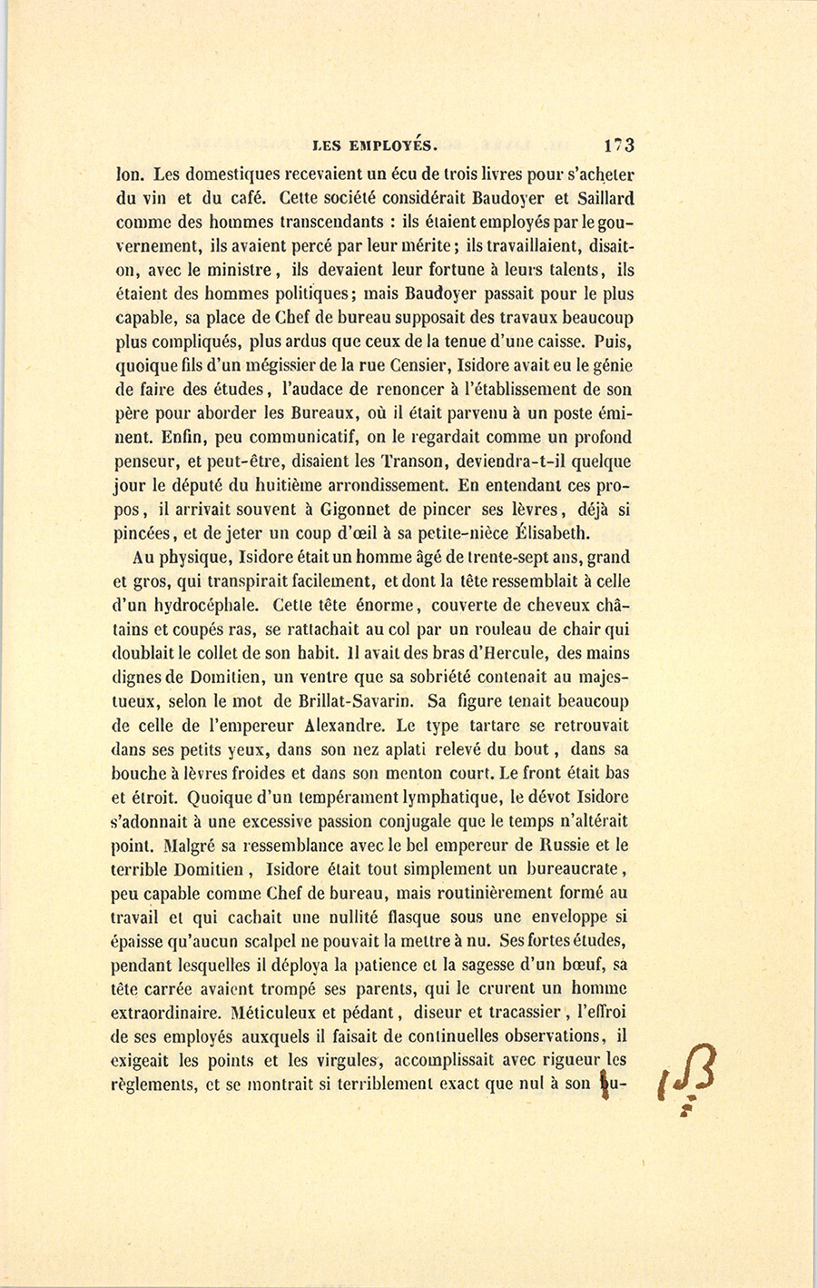 Au physique, Isidore était un homme âgé de trente-sept ans, grand et gros, qui transpirait facilement, et dont la tête ressemblait à celle d’un hydrocéphale. Cette tête énorme, couverte de cheveux châtains et coupés ras, se rattachait au col par un rouleau de chair qui doublait le collet de son habit. Il avait des bras d’Hercule, des mains dignes de Domitien, un ventre que sa sobriété contenait au majestueux, selon le mot de Brillat-Savarin. Sa figure tenait beaucoup de celle de l’empereur Alexandre. Le type tartare se retrouvait dans ses petits yeux, dans son nez aplati relevé du bout, dans sa bouche à lèvres froides et dans son menton court. Le front était bas et étroit. Quoique d’un tempérament lymphatique, le dévot Isidore s’adonnait à une excessive passion conjugale que le temps n’altérait point. Malgré sa ressemblance avec le bel empereur de Russie et le terrible Domitien, Isidore était tout simplement un bureaucrate, peu capable comme Chef de bureau, mais routinièrement formé au travail et qui cachait une nullité flasque sous une enveloppe si épaisse qu’aucun scalpel ne pouvait la mettre à nu. Ses fortes études, pendant lesquelles il déploya la patience et la sagesse d’un bœuf, sa tête carrée avaient trompé ses parents, qui le crurent un homme extraordinaire. Méticuleux et pédant, diseur et tracassier, l’effroi de ses employés auxquels il faisait de continuelles observations, il exigeait les points et les virgules, accomplissait avec rigueur les règlements, et se montrait si terriblement exact que nul à son {p. 174} Bureau ne manquait à s’y trouver avant lui. Baudoyer portait un habit bleu barbeau à boutons jaunes, un gilet chamois, un pantalon gris et une cravatte de couleur. Il avait de larges pieds mal chaussés. La chaîne de sa montre était ornée d’un énorme paquet de vieilles breloques parmi lesquelles il conservait en 1824 les graines d’Amérique à la mode en l’an VII.