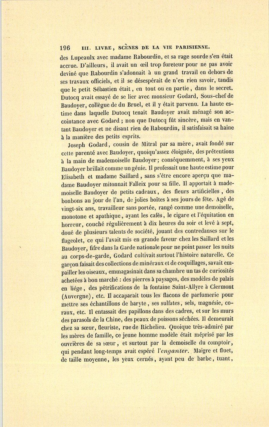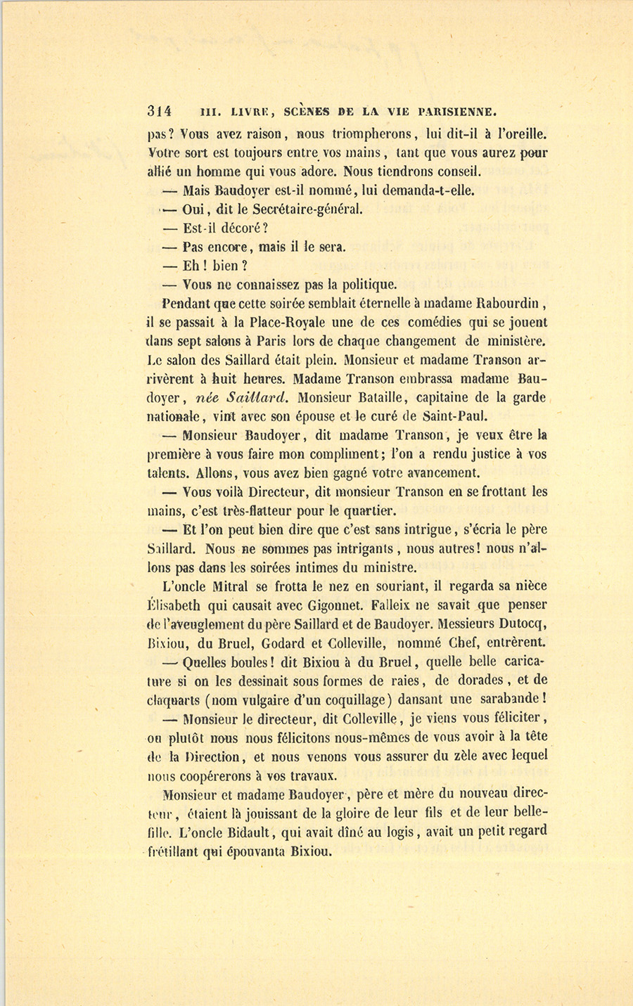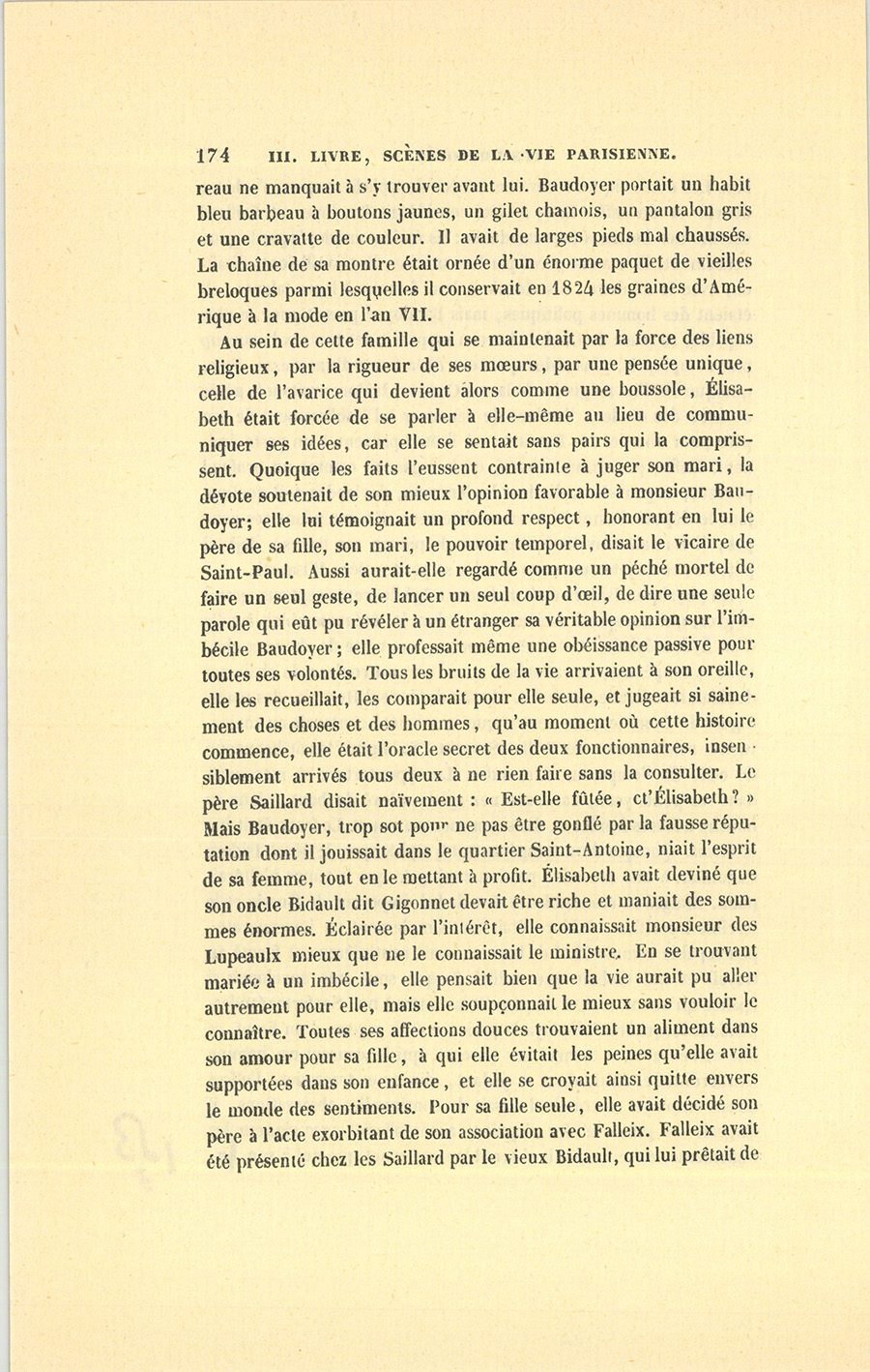 Plus tard, dans le banc de la Fabrique de Saint-Paul, Saillard fit la connaissance de monsieur et madame Transon, gros négociants en poteries, établis rue de Lesdiguières, qui s’intéressèrent à Élisabeth, et, qui, dans l’intention de la marier, produisirent le jeune Isidore Baudoyer chez les Saillard. La liaison de monsieur et madame Baudoyer avec les Saillard se resserra par l’approbation de Gigonnet, qui, pendant long-temps, avait employé dans ses affaires un sieur Mitral, huissier, frère de madame Baudoyer la mère, lequel voulait alors se retirer dans une jolie maison à L’Île-Adam. Monsieur et madame Baudoyer, père et mère d’Isidore, honnêtes mégissiers de la rue Censier, avaient lentement fait une fortune médiocre dans un commerce routinier. Après avoir marié leur fils unique, auquel ils donnèrent cinquante mille francs, ils pensèrent {p. 172} à vivre à la campagne, et choisirent le pays de L’Île-Adam où ils attirèrent Mitral ; mais ils vinrent fréquemment à Paris, où ils conservaient un pied-à-terre dans la maison de la rue Censier donnée en dot à Isidore. Les Baudoyer jouissaient encore de mille écus de rente, après avoir doté leur fils.