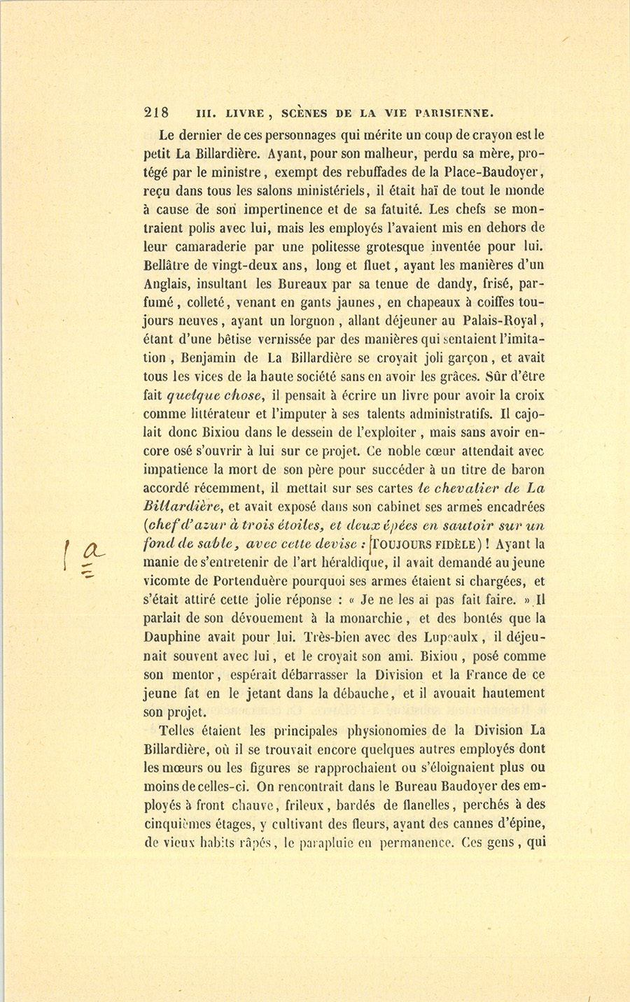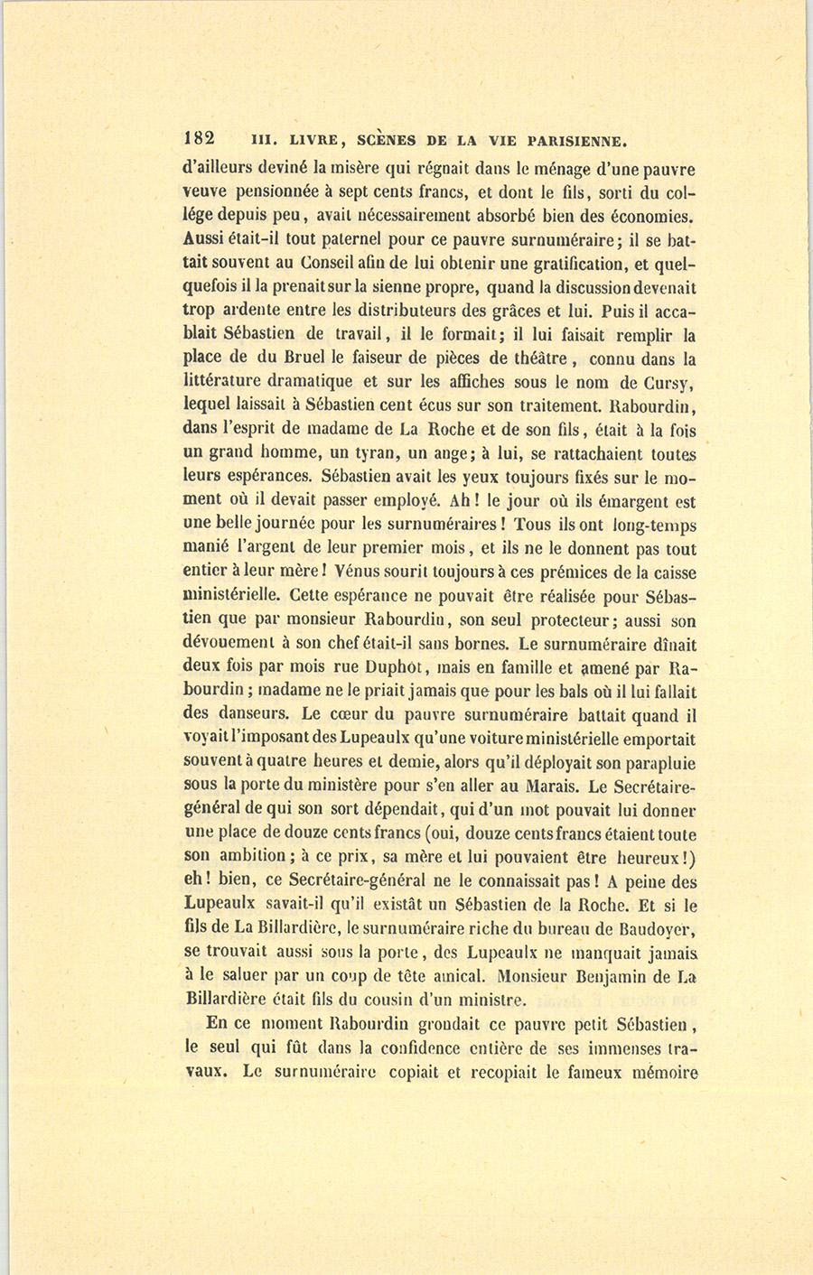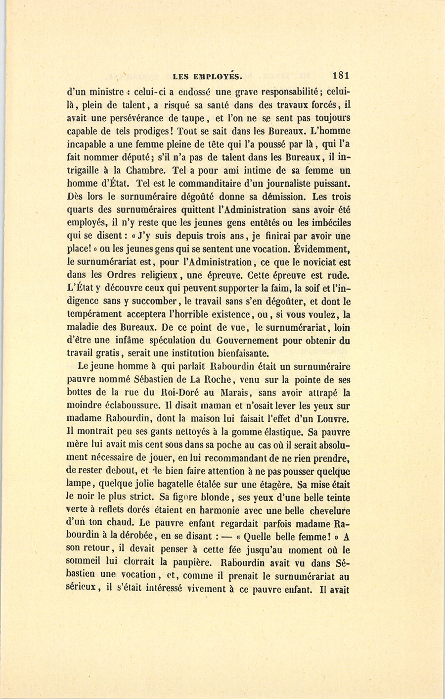 Le jeune homme à qui parlait Rabourdin était un surnuméraire pauvre nommé Sébastien de La Roche, venu sur la pointe de ses bottes de la rue du Roi-Doré au Marais, sans avoir attrapé la moindre éclaboussure. Il disait maman et n’osait lever les yeux sur madame Rabourdin, dont la maison lui faisait l’effet d’un Louvre. Il montrait peu ses gants nettoyés à la gomme élastique. Sa pauvre mère lui avait mis cent sous dans sa poche au cas où il serait absolument nécessaire de jouer, en lui recommandant de ne rien prendre, de rester debout, et de bien faire attention à ne pas pousser quelque lampe, quelque jolie bagatelle étalée sur une étagère. Sa mise était le noir le plus strict. Sa figure blonde, ses yeux d’une belle teinte verte à reflets dorés étaient en harmonie avec une belle chevelure d’un ton chaud. Le pauvre enfant regardait parfois madame Rabourdin à la dérobée, en se disant : – « Quelle belle femme ! » À son retour, il devait penser à cette fée jusqu’au moment où le sommeil lui clorait5 la paupière. Rabourdin avait vu dans Sébastien une vocation, et, comme il prenait le surnumérariat au sérieux, il s’était intéressé vivement à ce pauvre enfant. Il avait {p. 182} d’ailleurs deviné la misère qui régnait dans le ménage d’une pauvre veuve pensionnée à sept cents francs, et dont le fils, sorti du collége depuis peu, avait nécessairement absorbé bien des économies. Aussi était-il tout paternel pour ce pauvre surnuméraire ; il se battait souvent au Conseil afin de lui obtenir une gratification, et quelquefois il la prenait sur la sienne propre, quand la discussion devenait trop ardente entre les distributeurs des grâces et lui. Puis il accablait Sébastien de travail, il le formait ; il lui faisait remplir la place de du Bruel le faiseur de pièces de théâtre, connu dans la littérature dramatique et sur les affiches sous le nom de Cursy, lequel laissait à Sébastien cent écus sur son traitement. Rabourdin, dans l’esprit de madame de La Roche et de son fils, était à la fois un grand homme, un tyran, un ange ; à lui, se rattachaient toutes leurs espérances. Sébastien avait les yeux toujours fixés sur le moment où il devait passer employé. Ah ! le jour où ils émargent est une belle journée pour les surnuméraires ! Tous ils ont long-temps manié l’argent de leur premier mois, et ils ne le donnent pas tout entier à leur mère ! Vénus sourit toujours à ces prémices de la caisse ministérielle. Cette espérance ne pouvait être réalisée pour Sébastien que par monsieur Rabourdin, son seul protecteur, aussi son dévouement à son chef était-il sans bornes. Le surnuméraire dînait deux fois par mois rue Duphot, mais en famille et amené par Rabourdin ; madame ne le priait jamais que pour les bals où il lui fallait des danseurs. Le cœur du pauvre surnuméraire battait quand il voyait l’imposant des Lupeaulx qu’une voiture ministérielle emportait souvent à quatre heures et demie, alors qu’il déployait son parapluie sous la porte du ministère pour s’en aller au Marais. Le Secrétaire-général de qui son sort dépendait, qui d’un mot pouvait lui donner une place de douze cents francs (oui, douze cents francs étaient toute son ambition ; à ce prix, sa mère et lui pouvaient être heureux !) eh ! bien, ce Secrétaire-général ne le connaissait pas ! À peine des Lupeaulx savait-il qu’il existât un Sébastien de la Roche. Et si le fils de La Billardière, le surnuméraire riche du bureau de Baudoyer, se trouvait aussi sous la porte, des Lupeaulx ne manquait jamais à le saluer par un coup de tête amical. Monsieur Benjamin de La Billardière était fils du cousin d’un ministre.