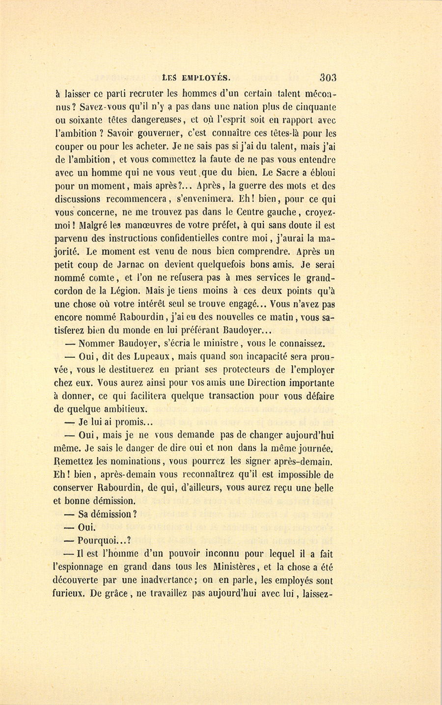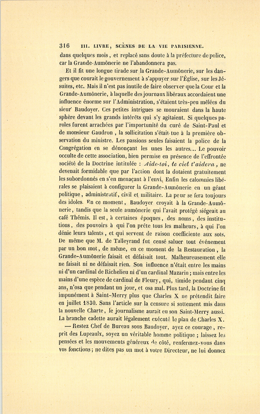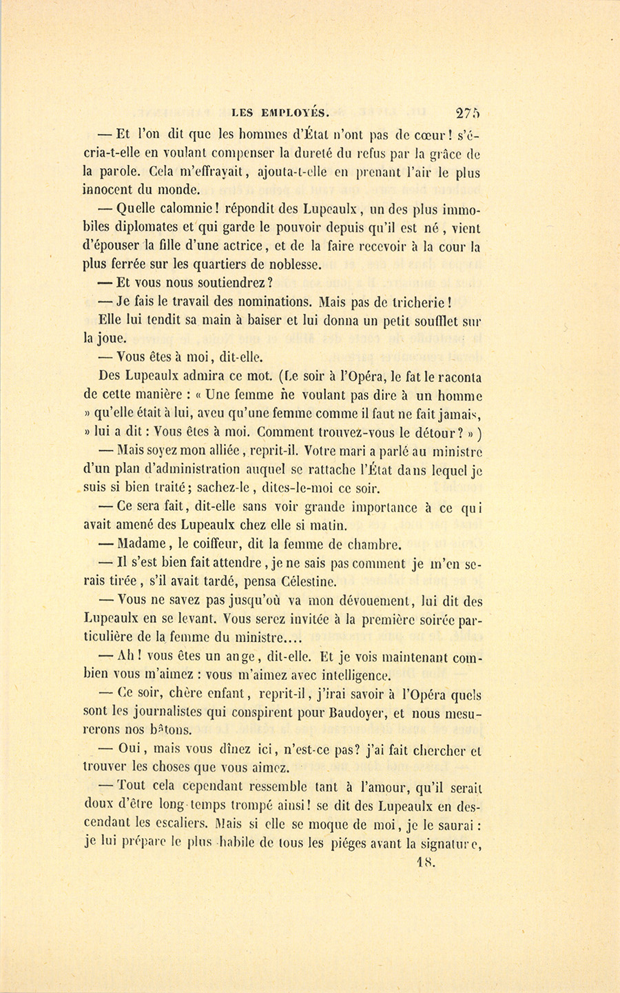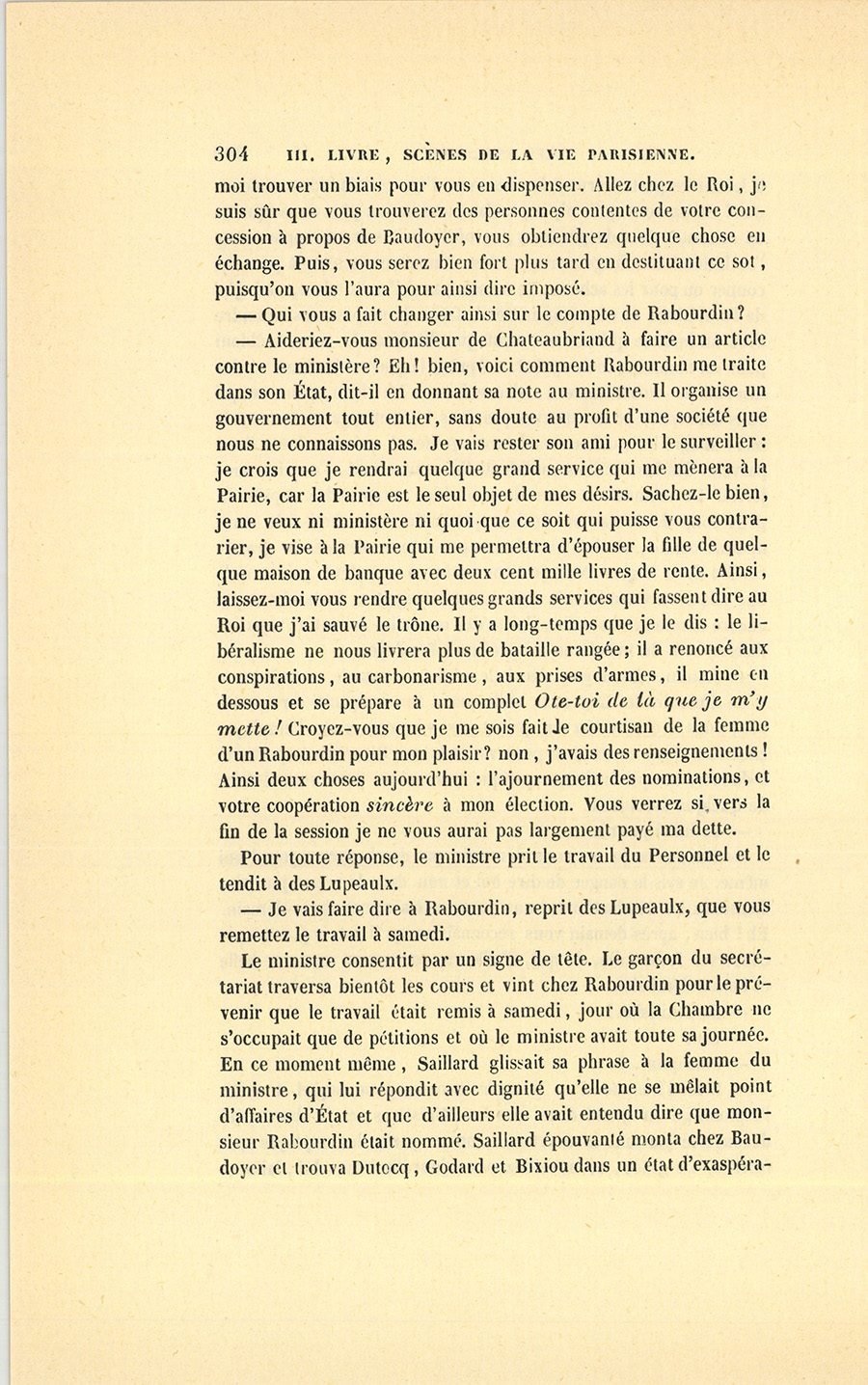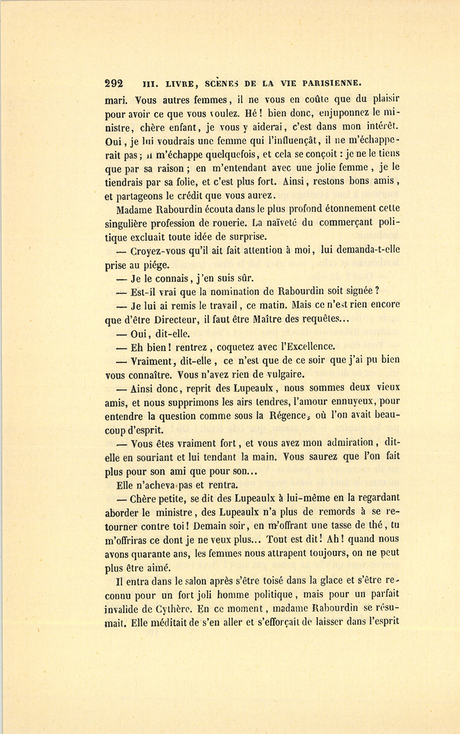– Attendez ! dit l’Excellence en laissant son secrétaire particulier et prenant le bras de des Lupeaulx avec qui il alla dans l’embrasure de la fenêtre. Mon cher, laissez-moi cet arrondissement, vous serez nommé comte, et je paie vos dettes… Enfin, si, après {p. 334} le renouvellement de la Chambre, je reste aux affaires, je trouverai l’occasion de vous faire nommer pair de France dans une fournée.