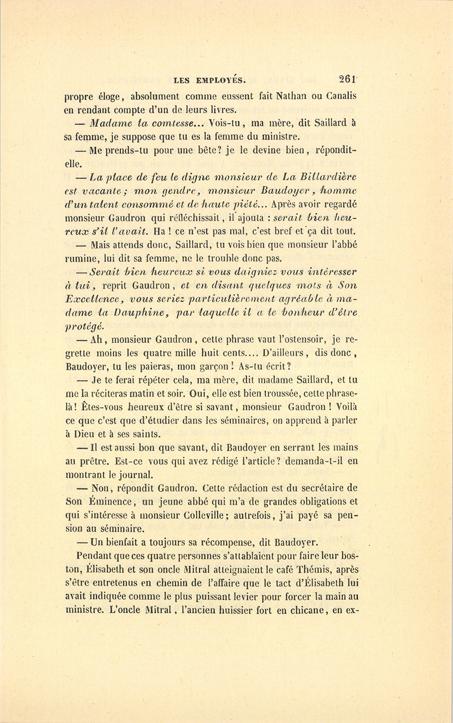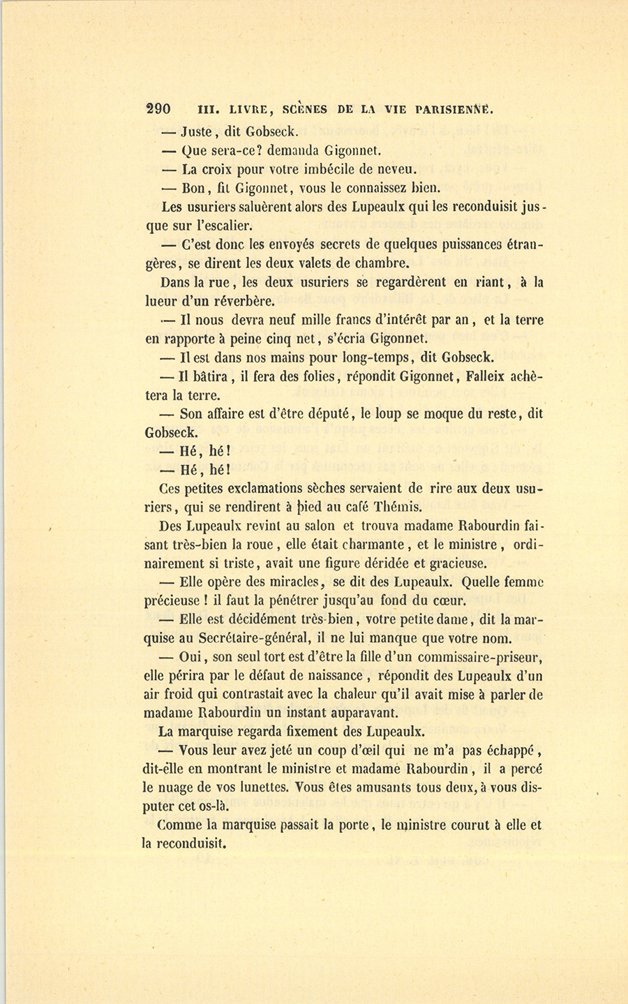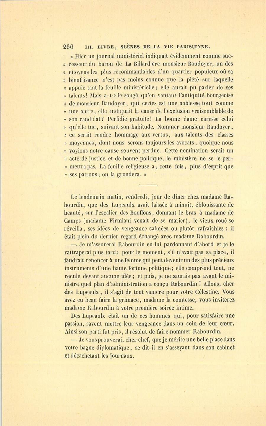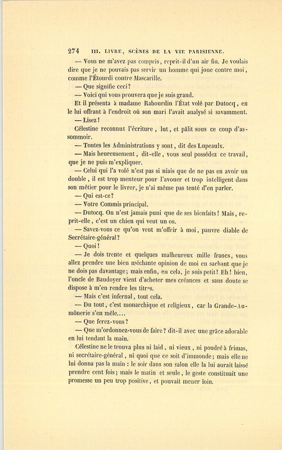 – Attendez ! dit l’Excellence en laissant son secrétaire particulier et prenant le bras de des Lupeaulx avec qui il alla dans l’embrasure de la fenêtre. Mon cher, laissez-moi cet arrondissement, vous serez nommé comte, et je paie vos dettes… Enfin, si, après {p. 334} le renouvellement de la Chambre, je reste aux affaires, je trouverai l’occasion de vous faire nommer pair de France dans une fournée.