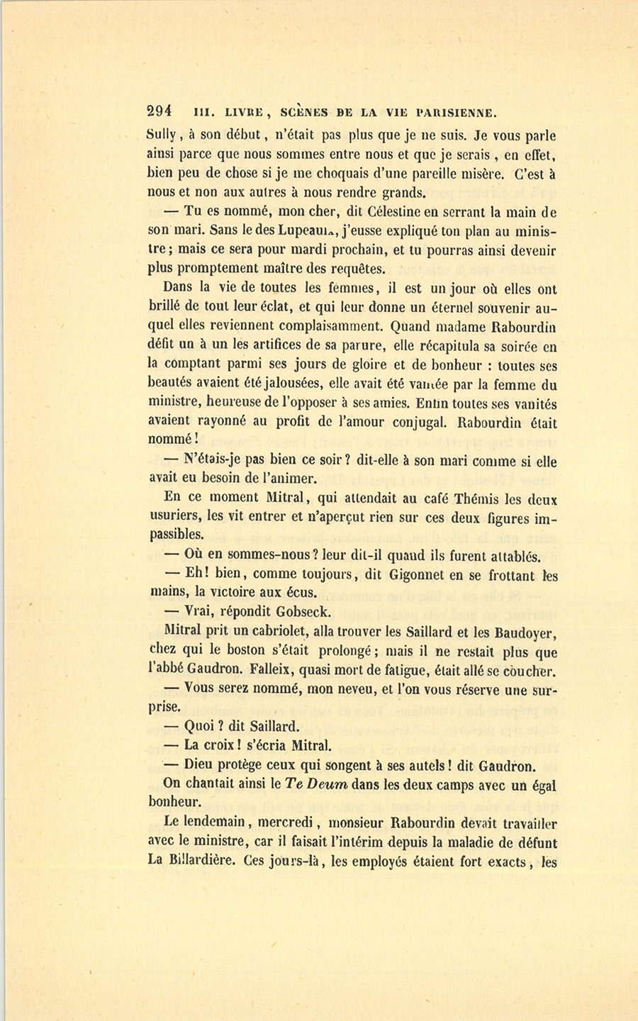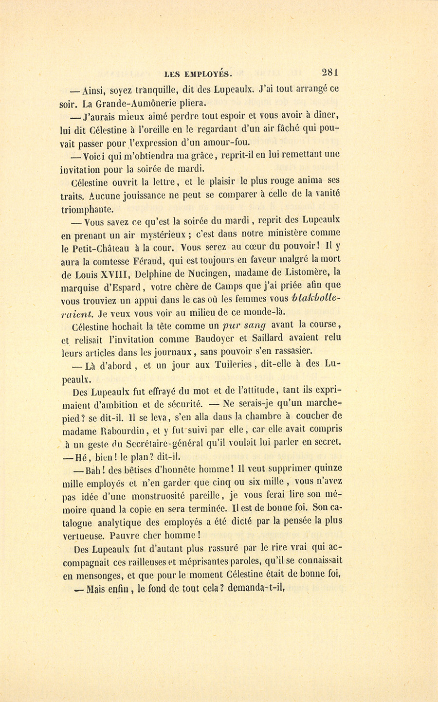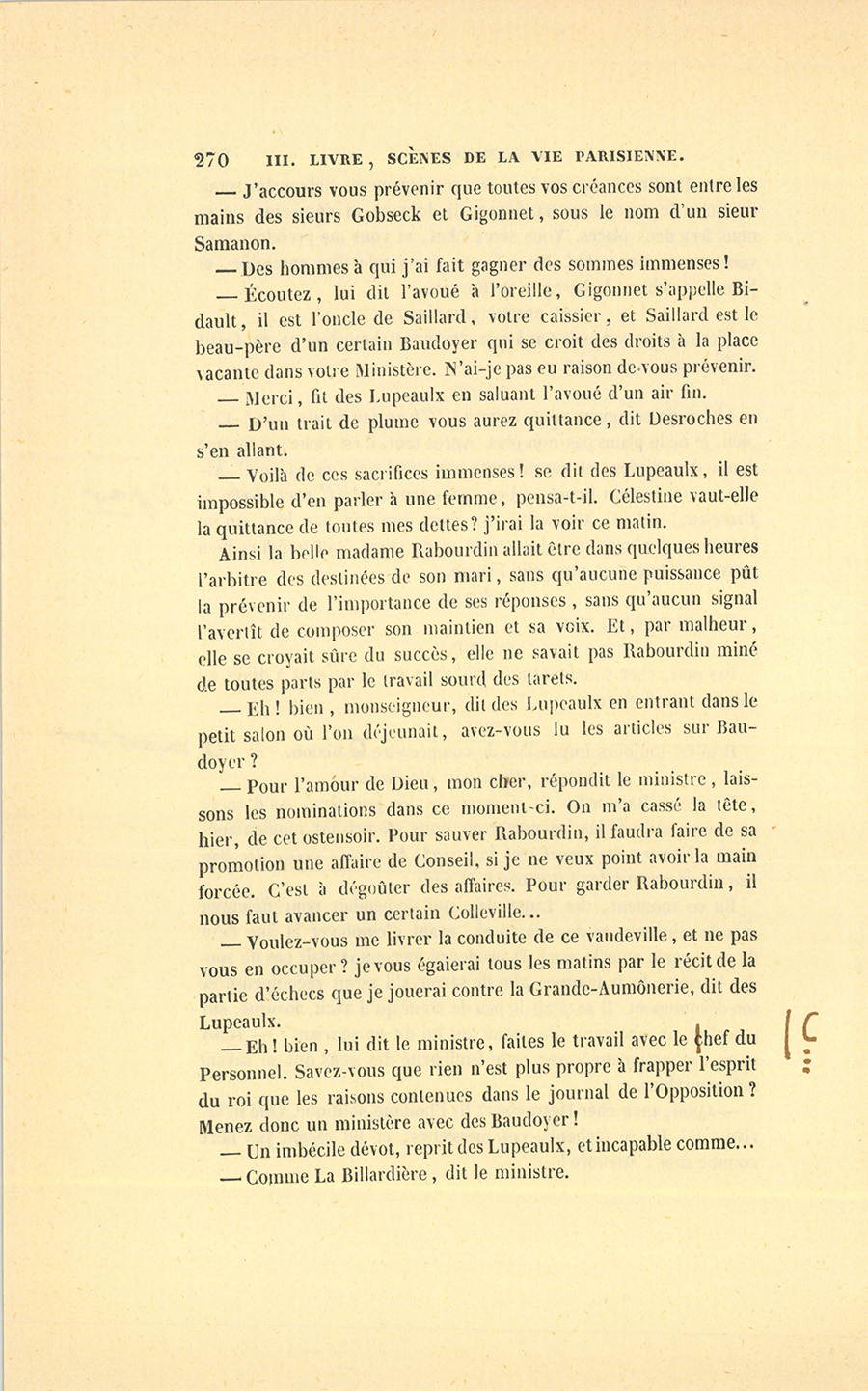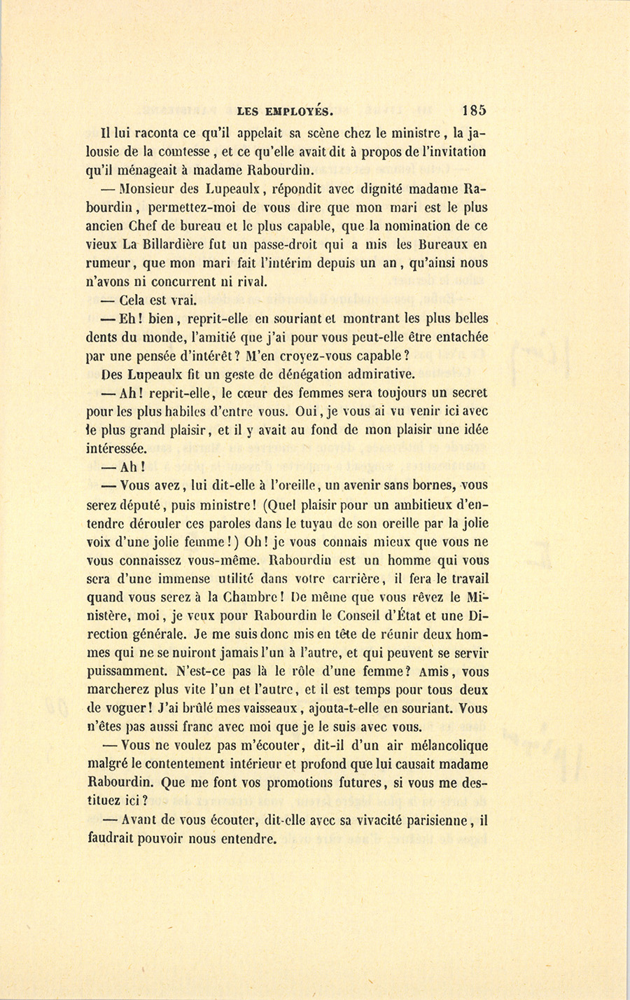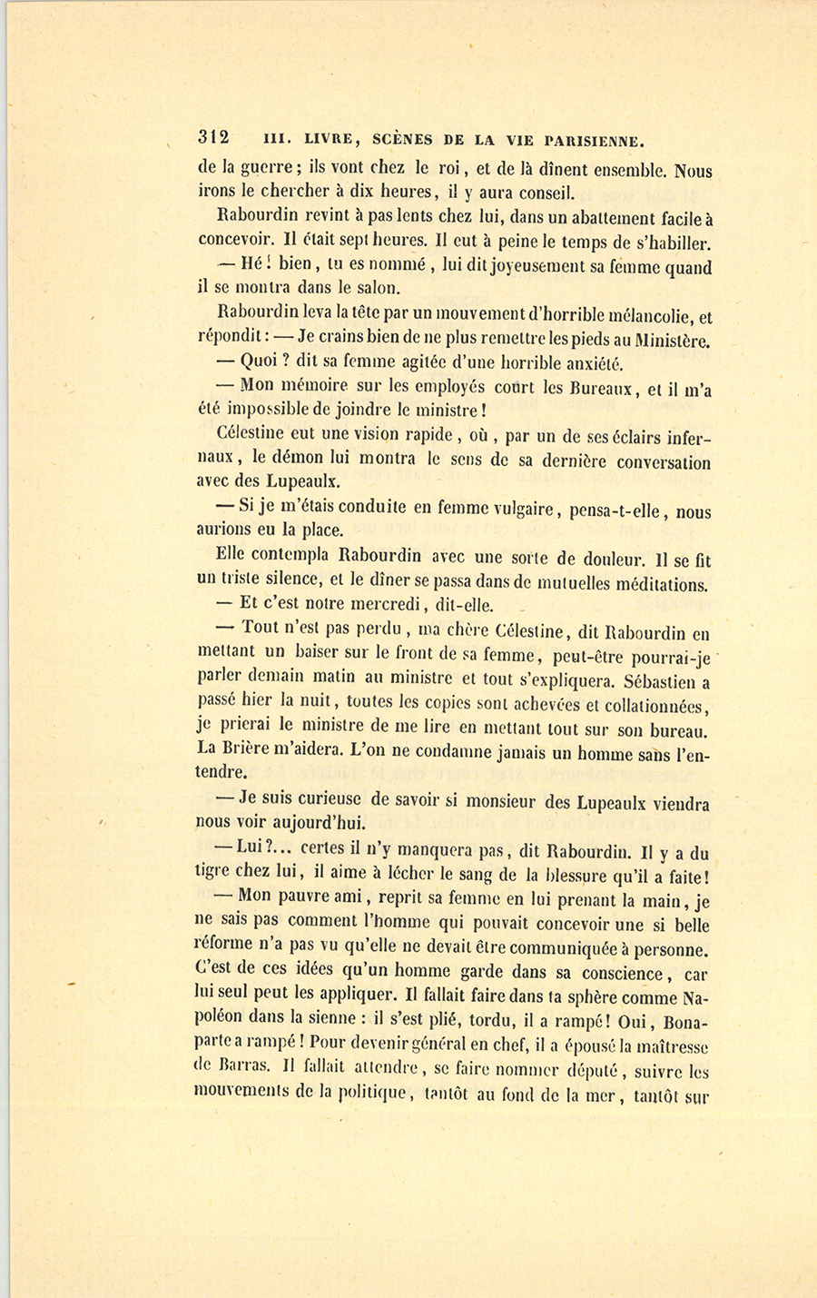 – Attendez ! dit l’Excellence en laissant son secrétaire particulier et prenant le bras de des Lupeaulx avec qui il alla dans l’embrasure de la fenêtre. Mon cher, laissez-moi cet arrondissement, vous serez nommé comte, et je paie vos dettes… Enfin, si, après {p. 334} le renouvellement de la Chambre, je reste aux affaires, je trouverai l’occasion de vous faire nommer pair de France dans une fournée.