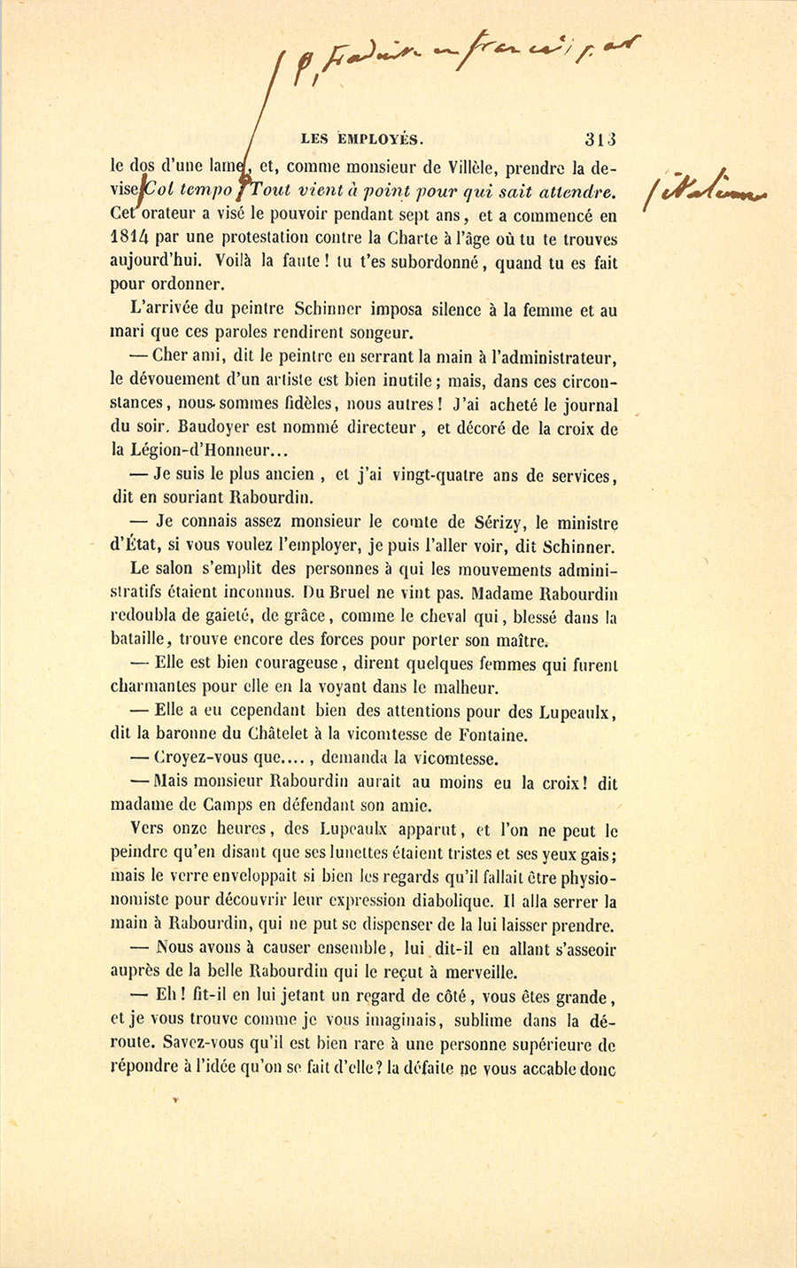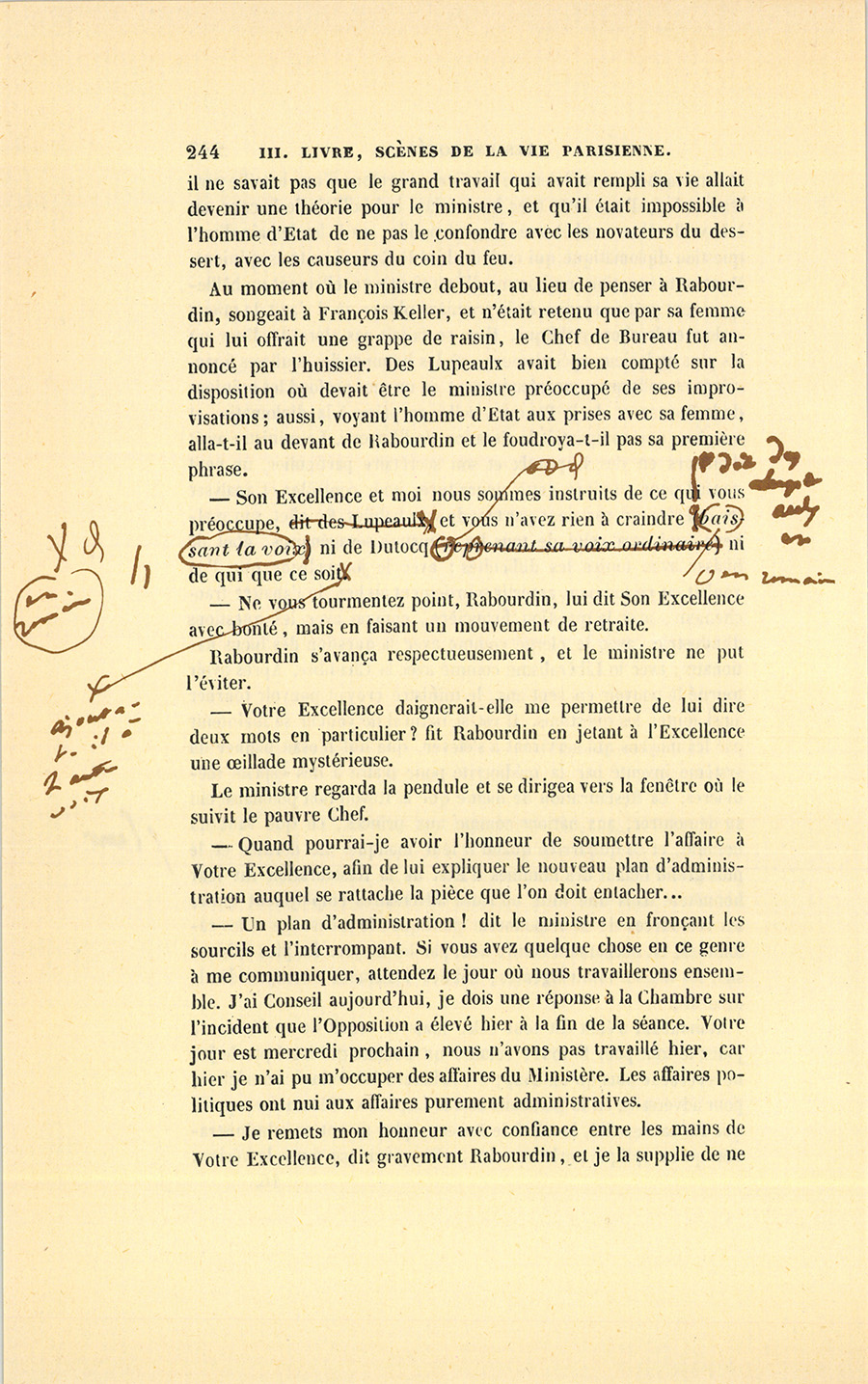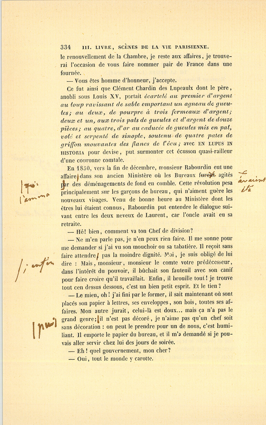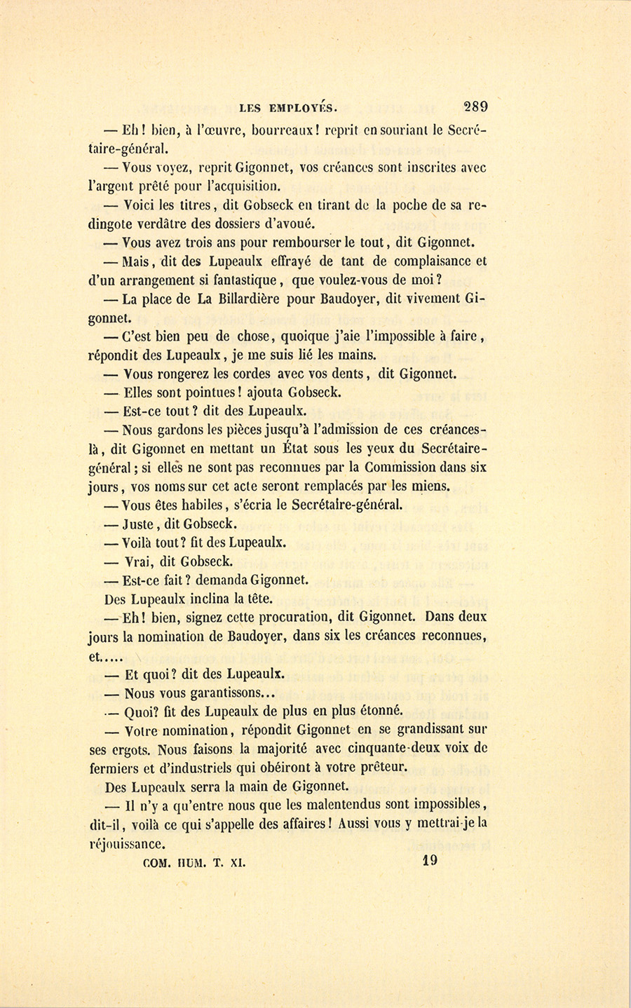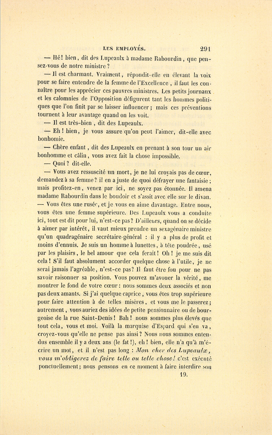 – Attendez ! dit l’Excellence en laissant son secrétaire particulier et prenant le bras de des Lupeaulx avec qui il alla dans l’embrasure de la fenêtre. Mon cher, laissez-moi cet arrondissement, vous serez nommé comte, et je paie vos dettes… Enfin, si, après {p. 334} le renouvellement de la Chambre, je reste aux affaires, je trouverai l’occasion de vous faire nommer pair de France dans une fournée.
