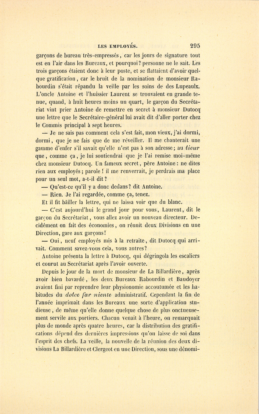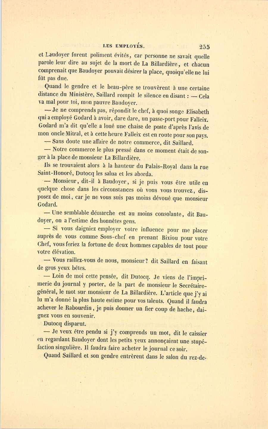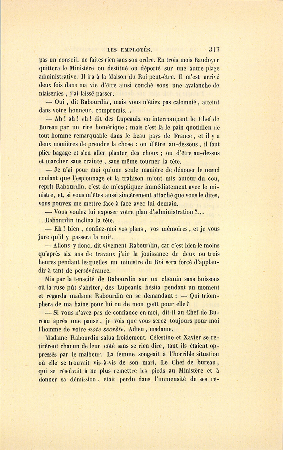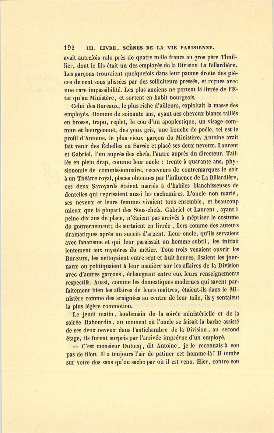 En 1830, vers la fin de décembre, monsieur Rabourdin eut une affaire qui l’amena dans son ancien Ministère où les Bureaux avaient été agités par des déménagements de fond en comble. Cette révolution pesa principalement sur les garçons de bureau, qui n’aiment guère les nouveaux visages. Venu de bonne heure au Ministère dont les êtres lui étaient connus, Rabourdin put entendre le dialogue suivant entre les deux neveux de Laurent, car l’oncle avait eu sa retraite.
