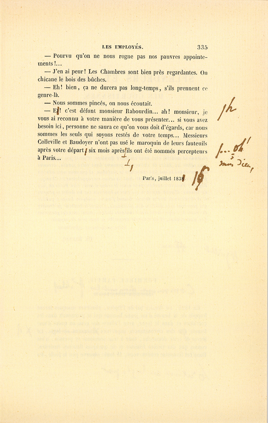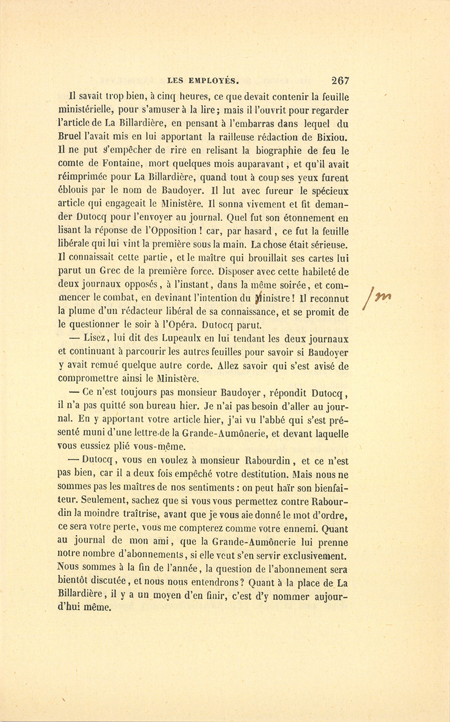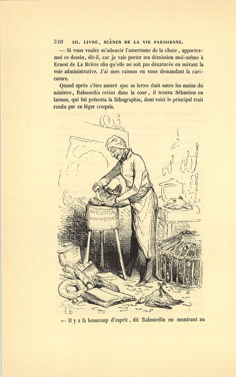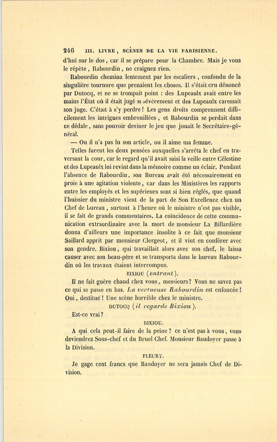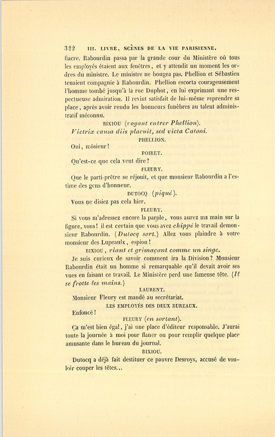 En 1830, vers la fin de décembre, monsieur Rabourdin eut une affaire qui l’amena dans son ancien Ministère où les Bureaux avaient été agités par des déménagements de fond en comble. Cette révolution pesa principalement sur les garçons de bureau, qui n’aiment guère les nouveaux visages. Venu de bonne heure au Ministère dont les êtres lui étaient connus, Rabourdin put entendre le dialogue suivant entre les deux neveux de Laurent, car l’oncle avait eu sa retraite.