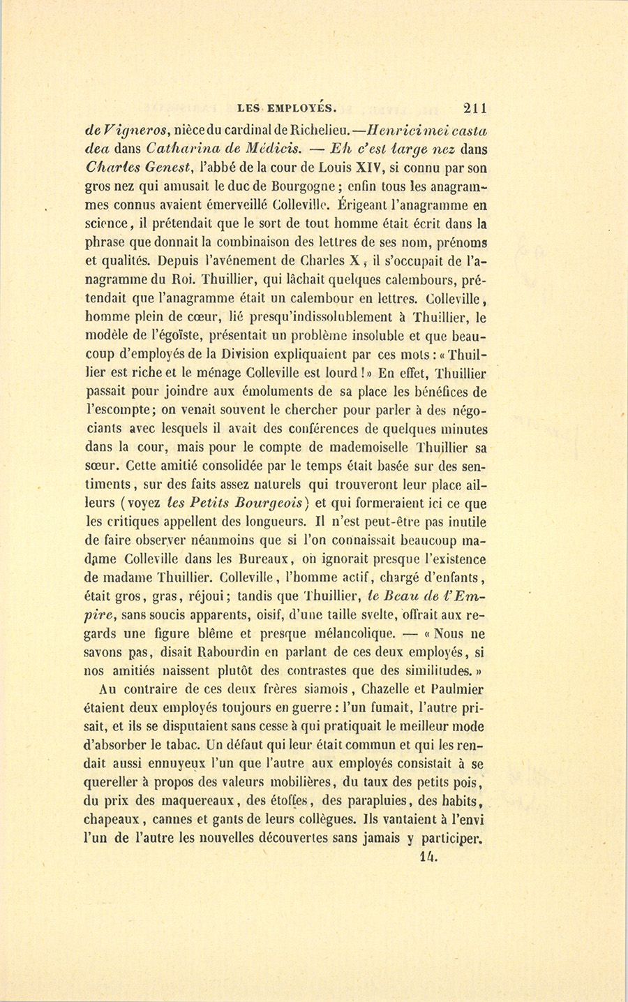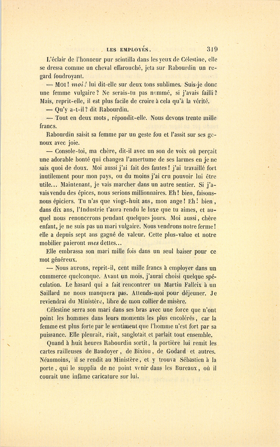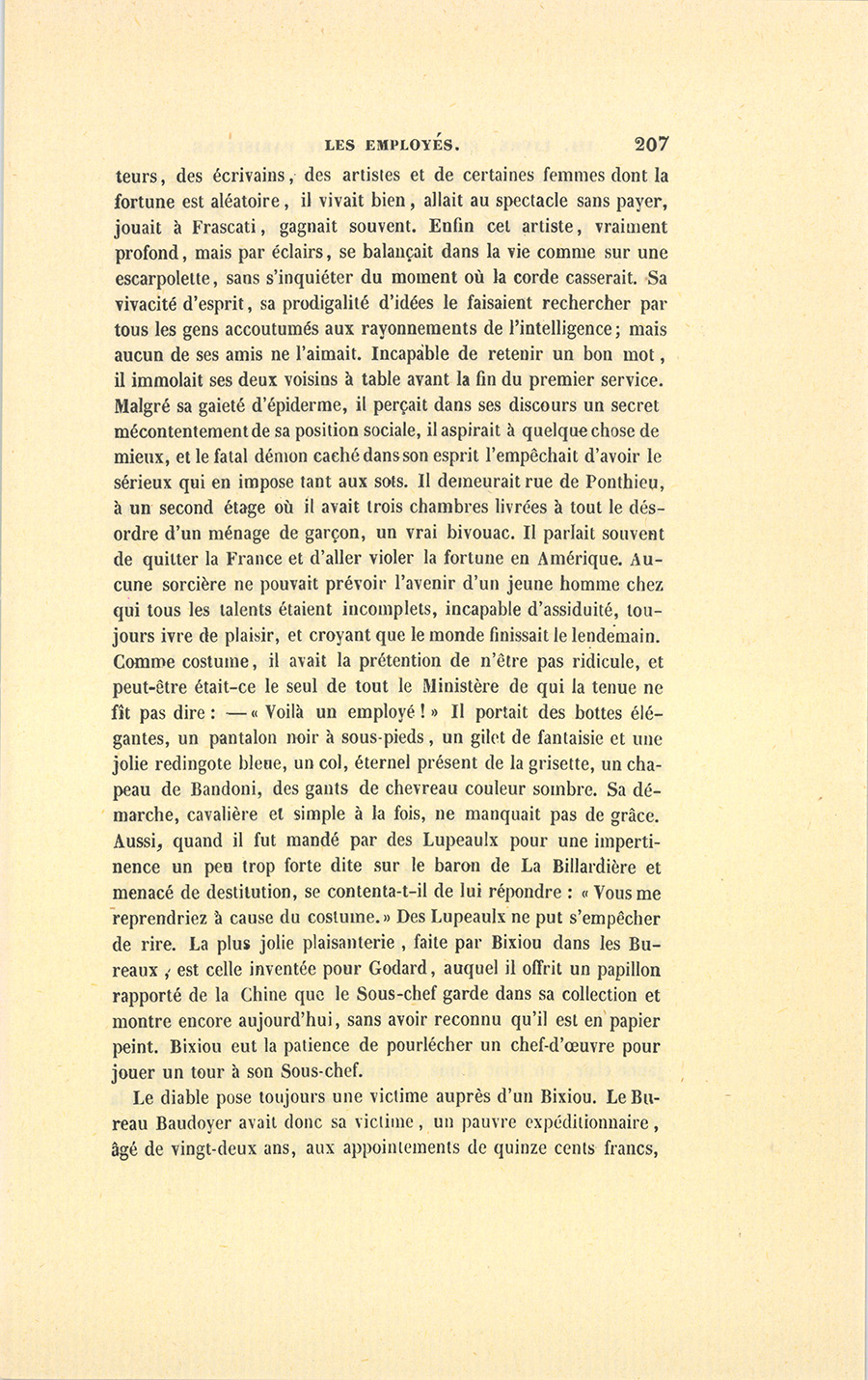 À Paris tout employé qui n’a pas, comme Rabourdin, une patriotique ambition ou quelque capacité supérieure, joint les fruits d’une industrie aux produits de sa place afin de pouvoir exister. Il fait comme monsieur Saillard, il s’intéresse à un commerce en baillant des fonds, et le soir il tient les livres de son associé. Beaucoup d’employés sont mariés à des lingères, à des débitantes de tabac, à des directrices de bureau de loterie ou de cabinets de lecture. Quelques-uns, comme le mari de madame Colleville, l’antagoniste de Célestine, sont placés à l’orchestre d’un Théâtre. D’autres, comme du Bruel, fabriquent des vaudevilles, des opéras-comiques, des mélodrames, ou dirigent des spectacles. En ce genre, on peut citer messieurs Sewrin, Pixerécourt, Planard, etc. Dans leur temps Pigault-Lebrun, Piis, Duvicquet avaient des places. Le premier libraire de monsieur Scribe fut un employé au Trésor.