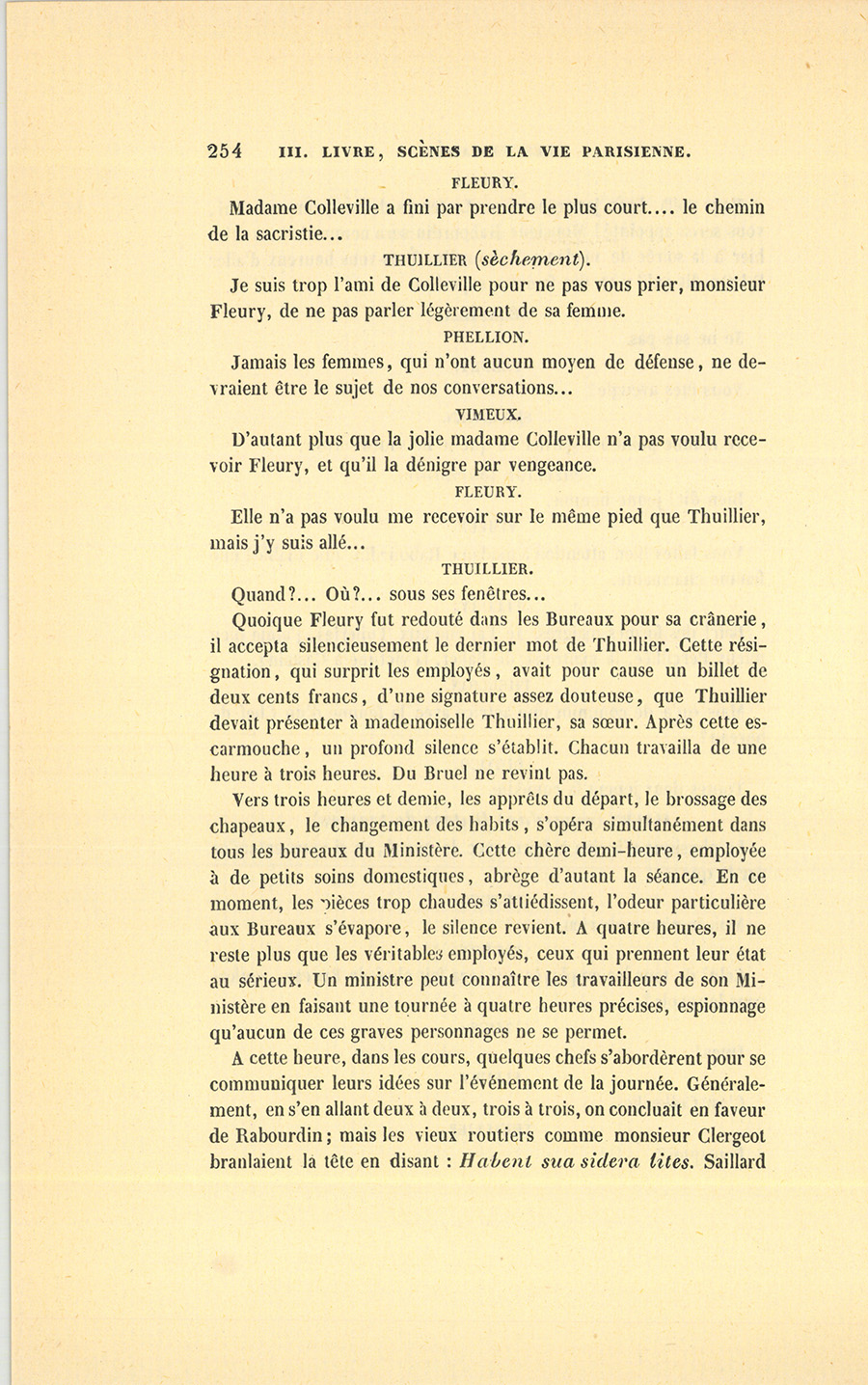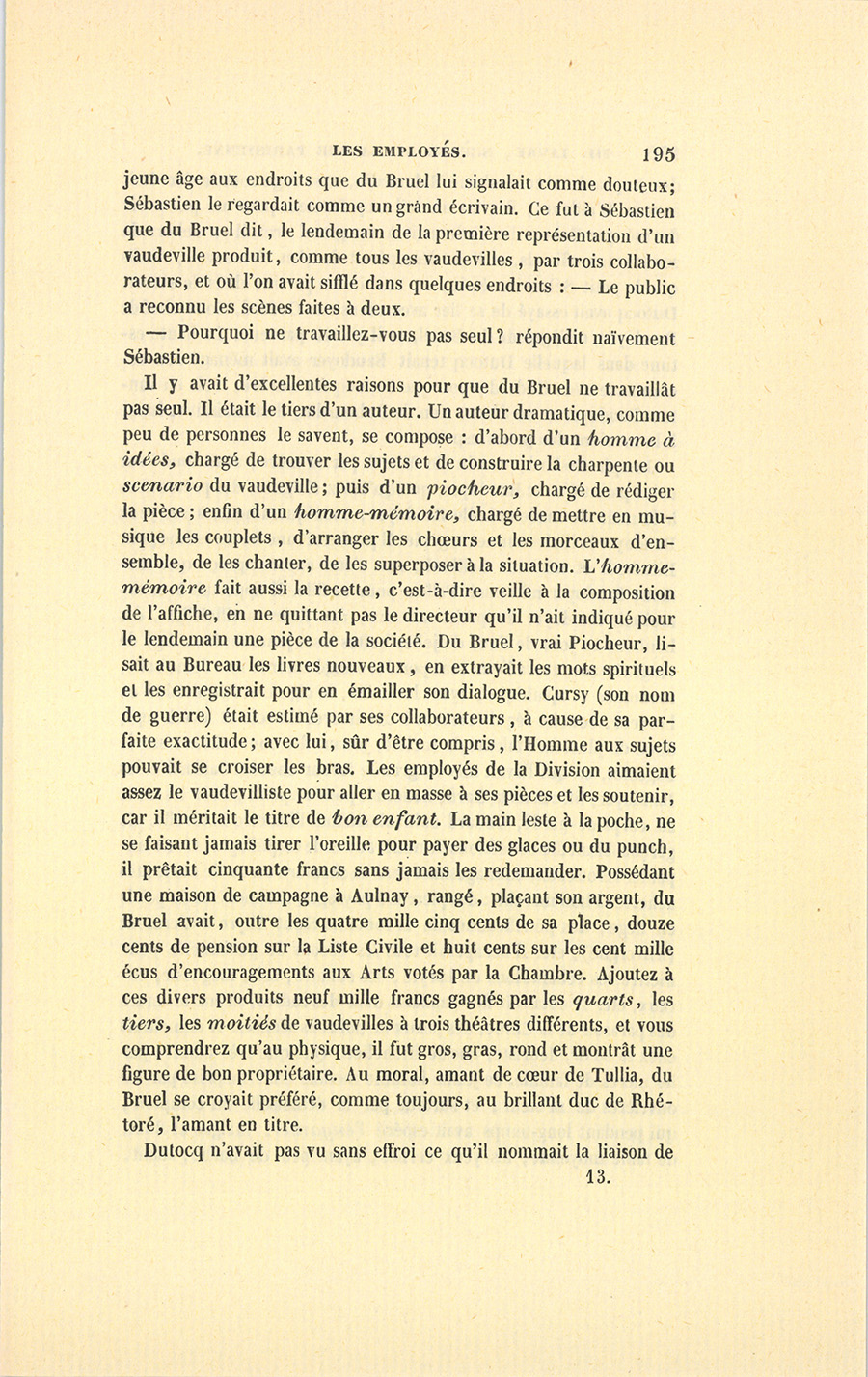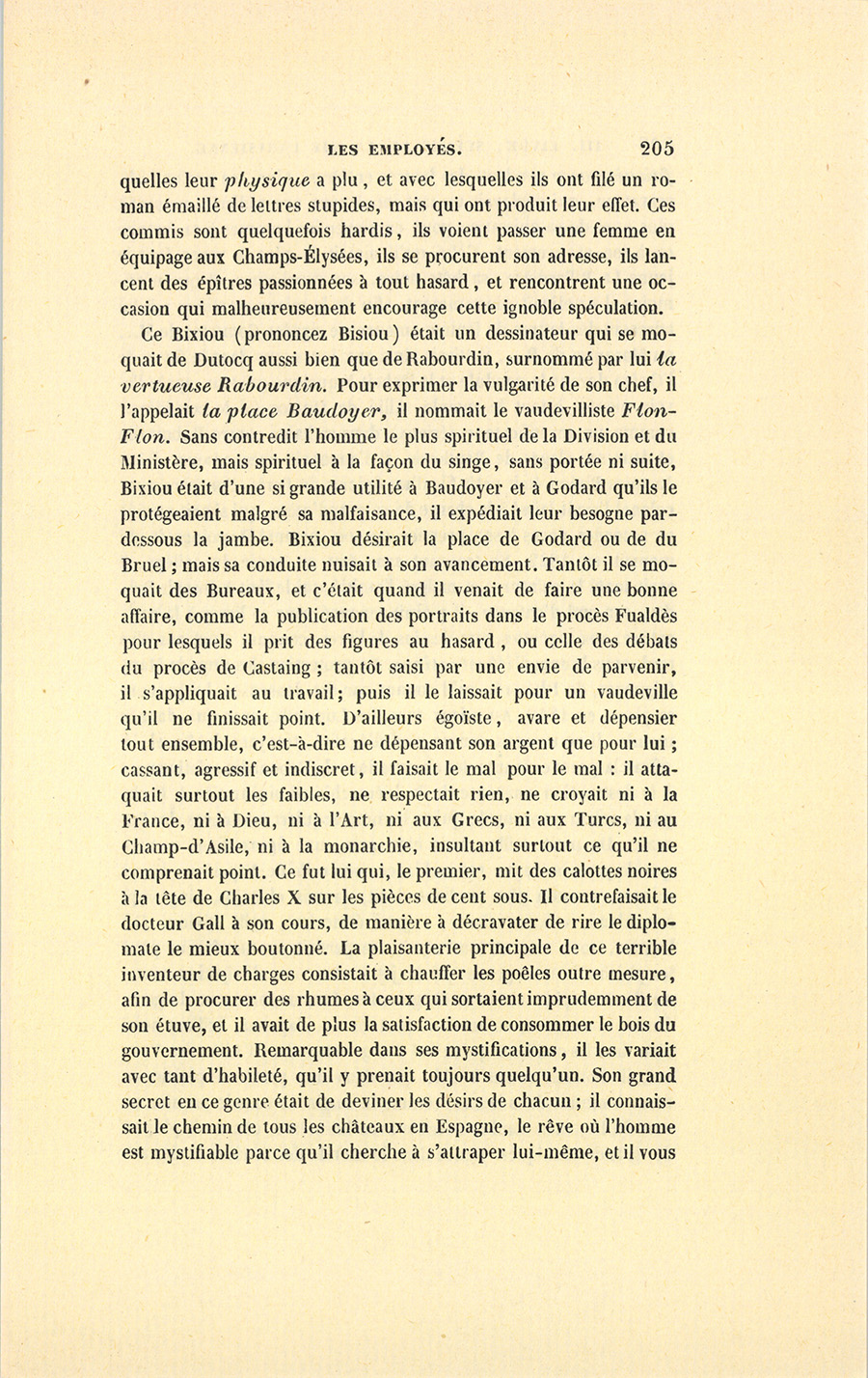 À Paris tout employé qui n’a pas, comme Rabourdin, une patriotique ambition ou quelque capacité supérieure, joint les fruits d’une industrie aux produits de sa place afin de pouvoir exister. Il fait comme monsieur Saillard, il s’intéresse à un commerce en baillant des fonds, et le soir il tient les livres de son associé. Beaucoup d’employés sont mariés à des lingères, à des débitantes de tabac, à des directrices de bureau de loterie ou de cabinets de lecture. Quelques-uns, comme le mari de madame Colleville, l’antagoniste de Célestine, sont placés à l’orchestre d’un Théâtre. D’autres, comme du Bruel, fabriquent des vaudevilles, des opéras-comiques, des mélodrames, ou dirigent des spectacles. En ce genre, on peut citer messieurs Sewrin, Pixerécourt, Planard, etc. Dans leur temps Pigault-Lebrun, Piis, Duvicquet avaient des places. Le premier libraire de monsieur Scribe fut un employé au Trésor.