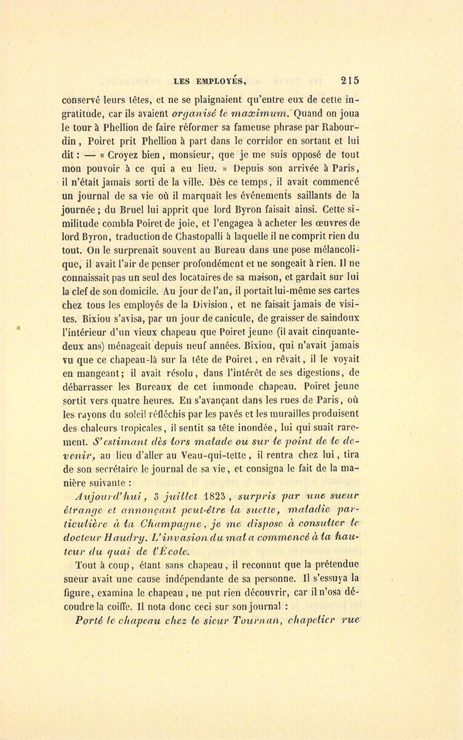 Il se rencontre cependant peu d’hommes d’État parmi les préfets. Le préfet serait alors un neutre des Genres supérieurs. Il se trouverait entre l’homme d’État et l’employé, comme le douanier se trouve entre le civil et le militaire. Continuons à débrouiller ces hautes questions. (Poiret devient rouge.) Ceci ne peut-il pas se formuler par ce théorème digne de Larochefoucault : Au-dessus de vingt mille francs d’appointements, il n’y a plus d’employés. Nous pouvons mathématiquement en tirer ce premier corollaire : L’homme d’État se déclare dans la sphère des traitements supérieurs. Et ce non moins important et logique deuxième corollaire : Les Directeurs généraux peuvent être des hommes d’État. Peut-être est-ce dans ce sens que plus d’un député se dit : – C’est un bel état que d’être directeur général ! Mais, dans l’intérêt de la langue française et de l’Académie…