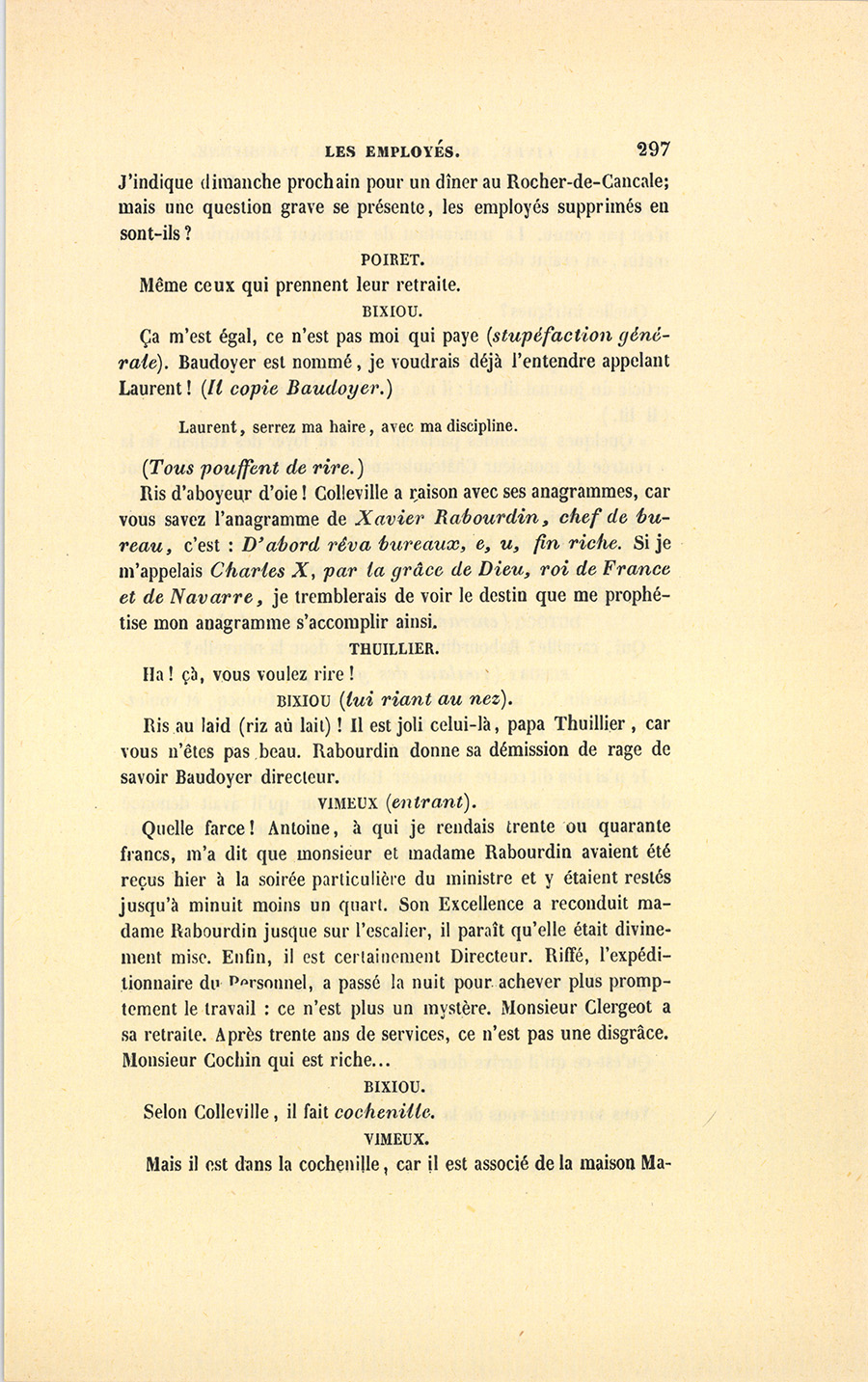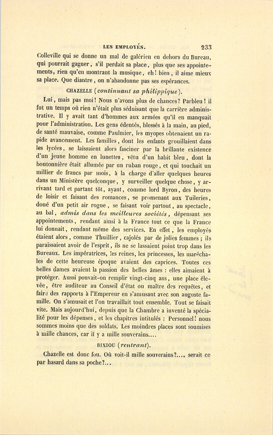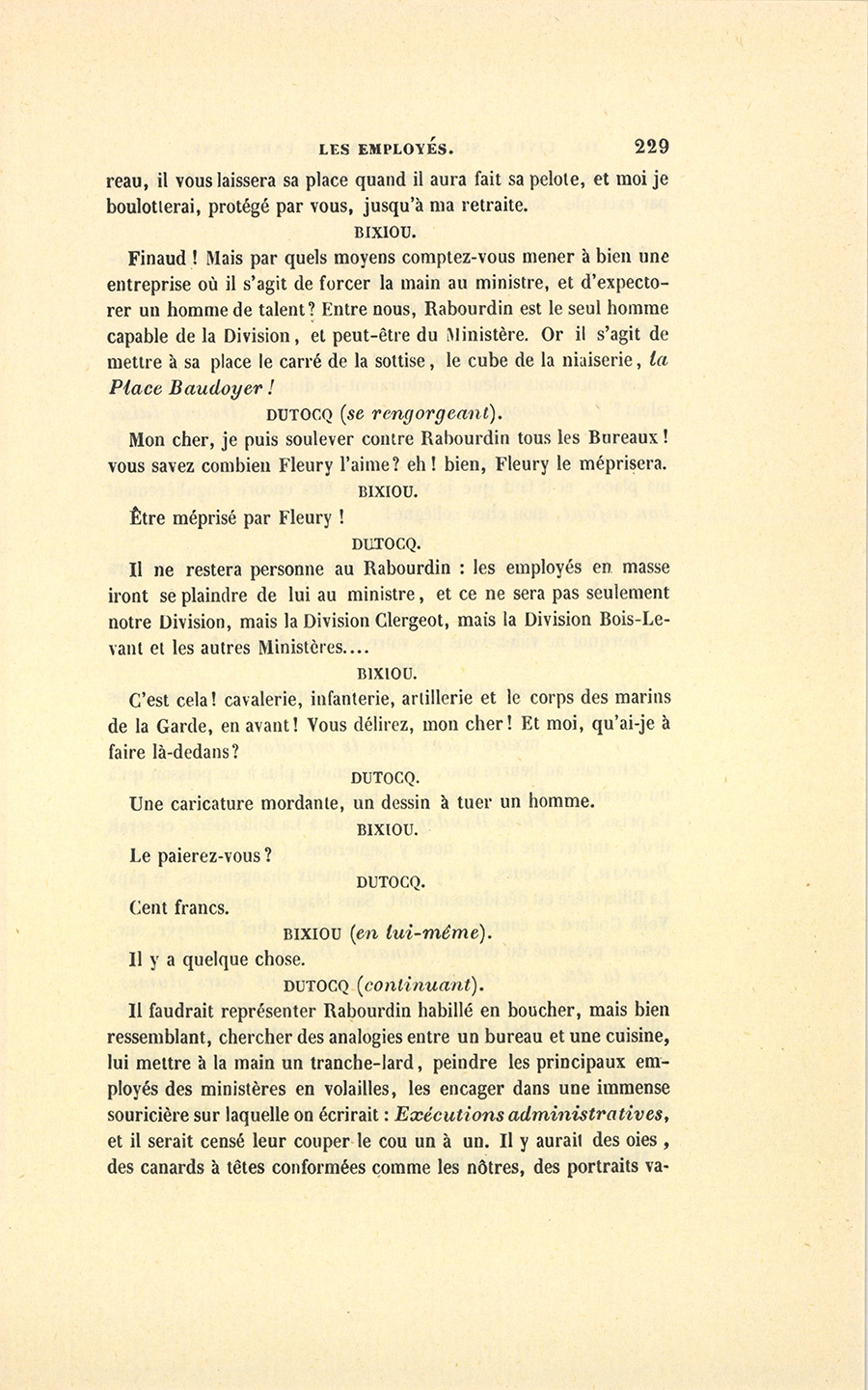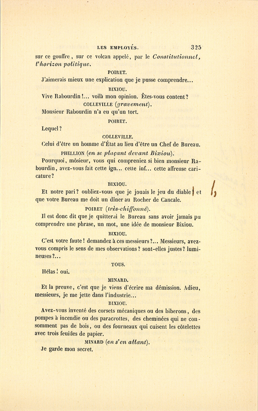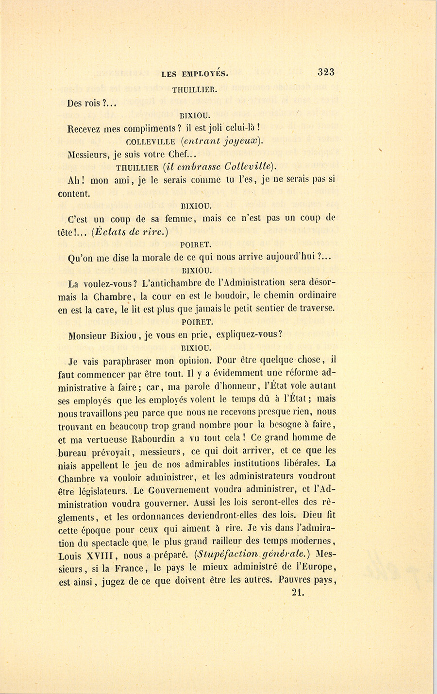 Vieillard ! vous vous trompez. J’ai voulu graver dans votre cerveau la plus vivante image possible du Gouvernement constitutionnel (tous les employés regardent Bixiou, Poiret stupéfait le contemple dans une sorte d’inquiétude) et vous tenir ainsi ma parole. J’ai pris la manière parabolique des Sauvages. (Écoutez !) Pendant que les ministres établissent à la Chambre des colloques à peu près aussi concluants, aussi utiles que le nôtre, l’Administration coupe des boutons aux contribuables.