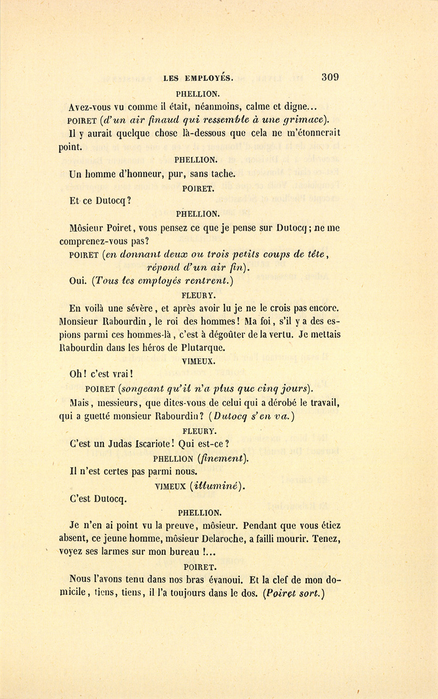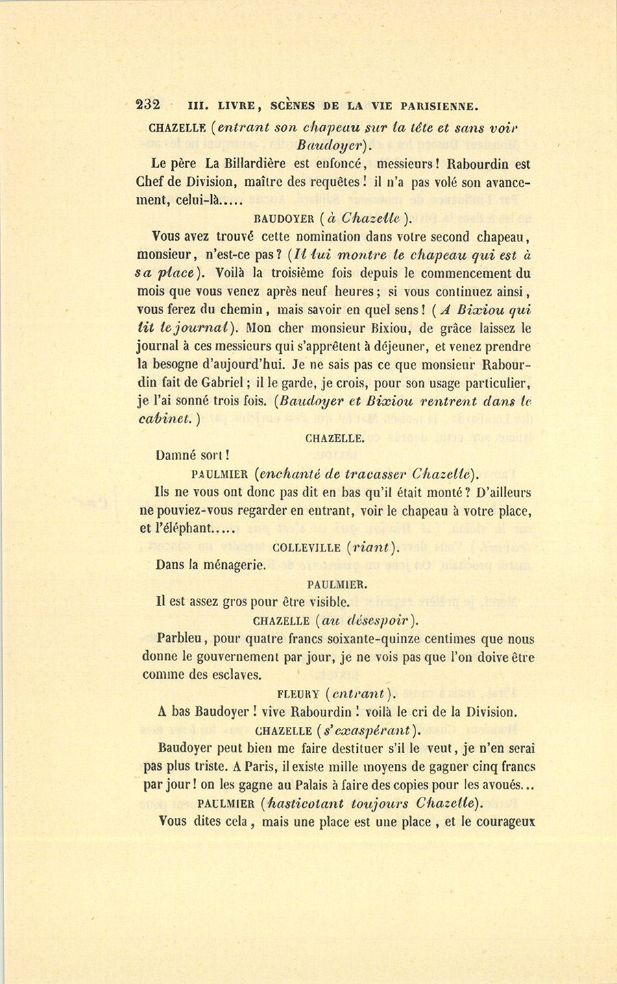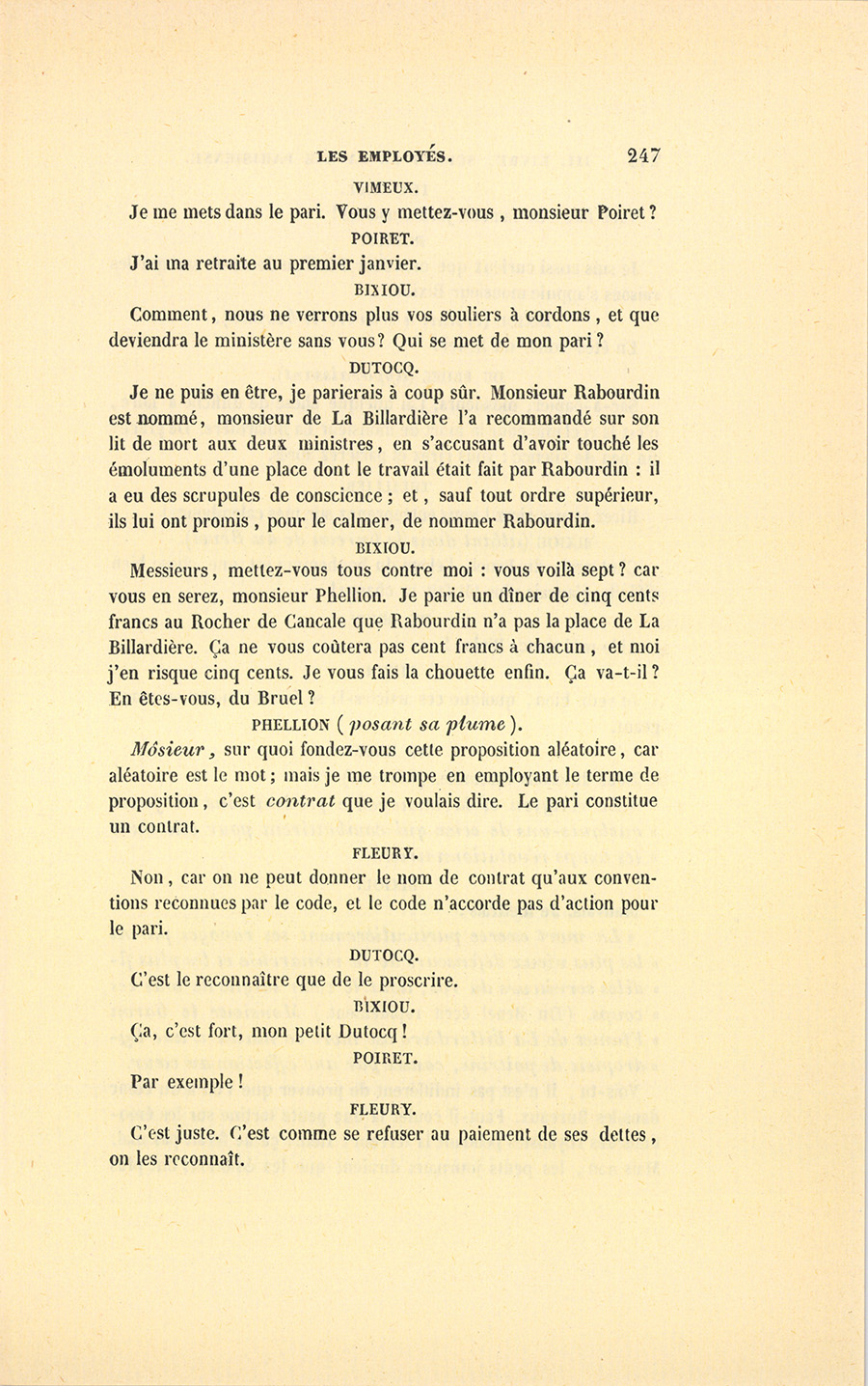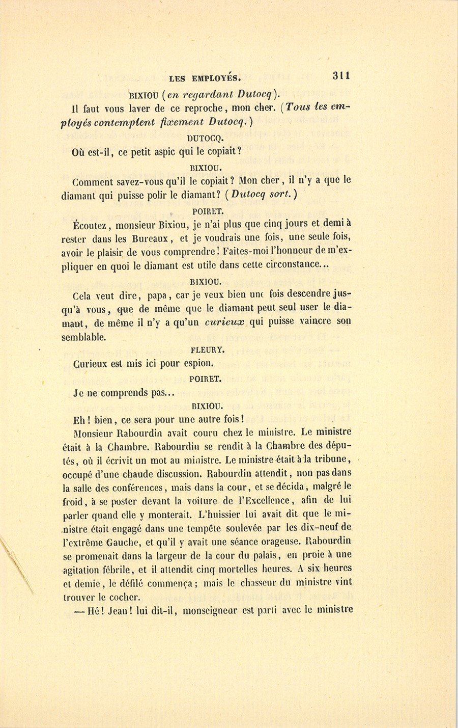 Vieillard ! vous vous trompez. J’ai voulu graver dans votre cerveau la plus vivante image possible du Gouvernement constitutionnel (tous les employés regardent Bixiou, Poiret stupéfait le contemple dans une sorte d’inquiétude) et vous tenir ainsi ma parole. J’ai pris la manière parabolique des Sauvages. (Écoutez !) Pendant que les ministres établissent à la Chambre des colloques à peu près aussi concluants, aussi utiles que le nôtre, l’Administration coupe des boutons aux contribuables.