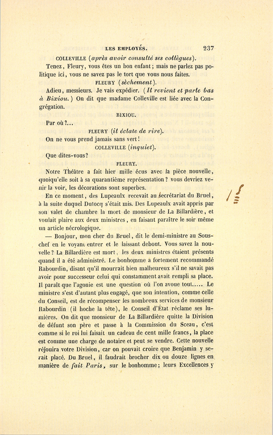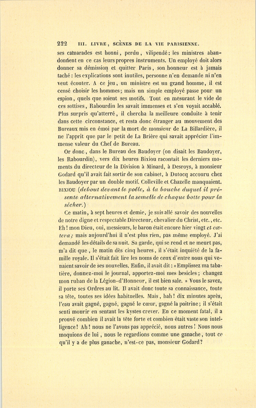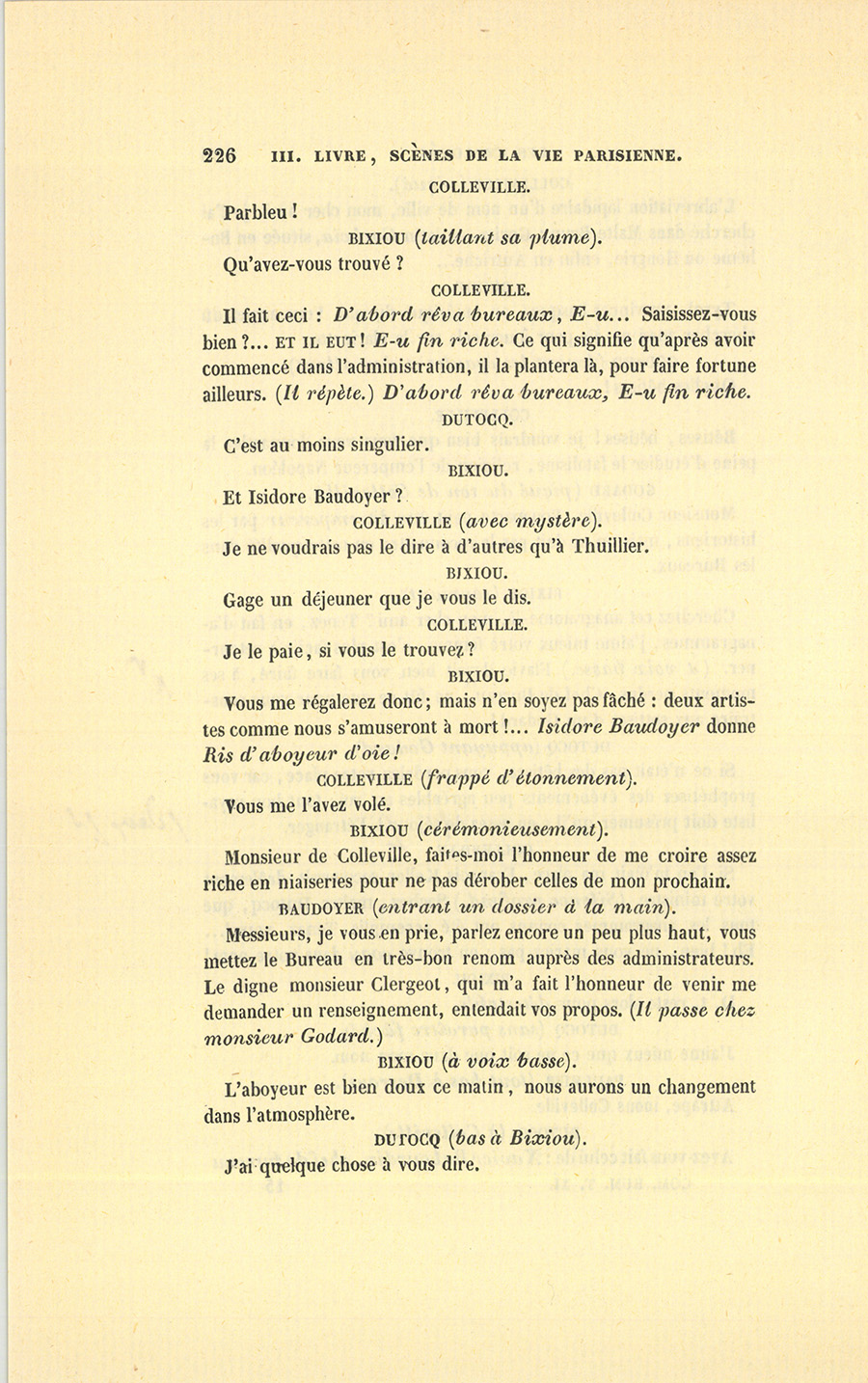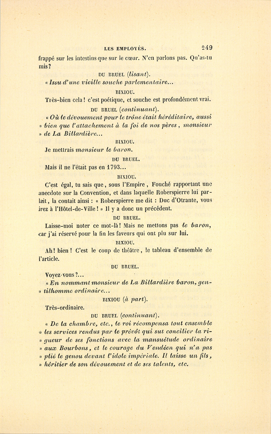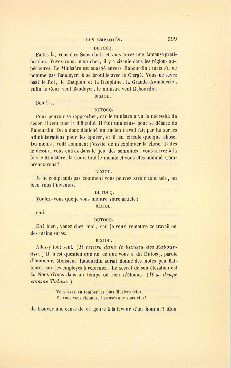 Vieillard ! vous vous trompez. J’ai voulu graver dans votre cerveau la plus vivante image possible du Gouvernement constitutionnel (tous les employés regardent Bixiou, Poiret stupéfait le contemple dans une sorte d’inquiétude) et vous tenir ainsi ma parole. J’ai pris la manière parabolique des Sauvages. (Écoutez !) Pendant que les ministres établissent à la Chambre des colloques à peu près aussi concluants, aussi utiles que le nôtre, l’Administration coupe des boutons aux contribuables.