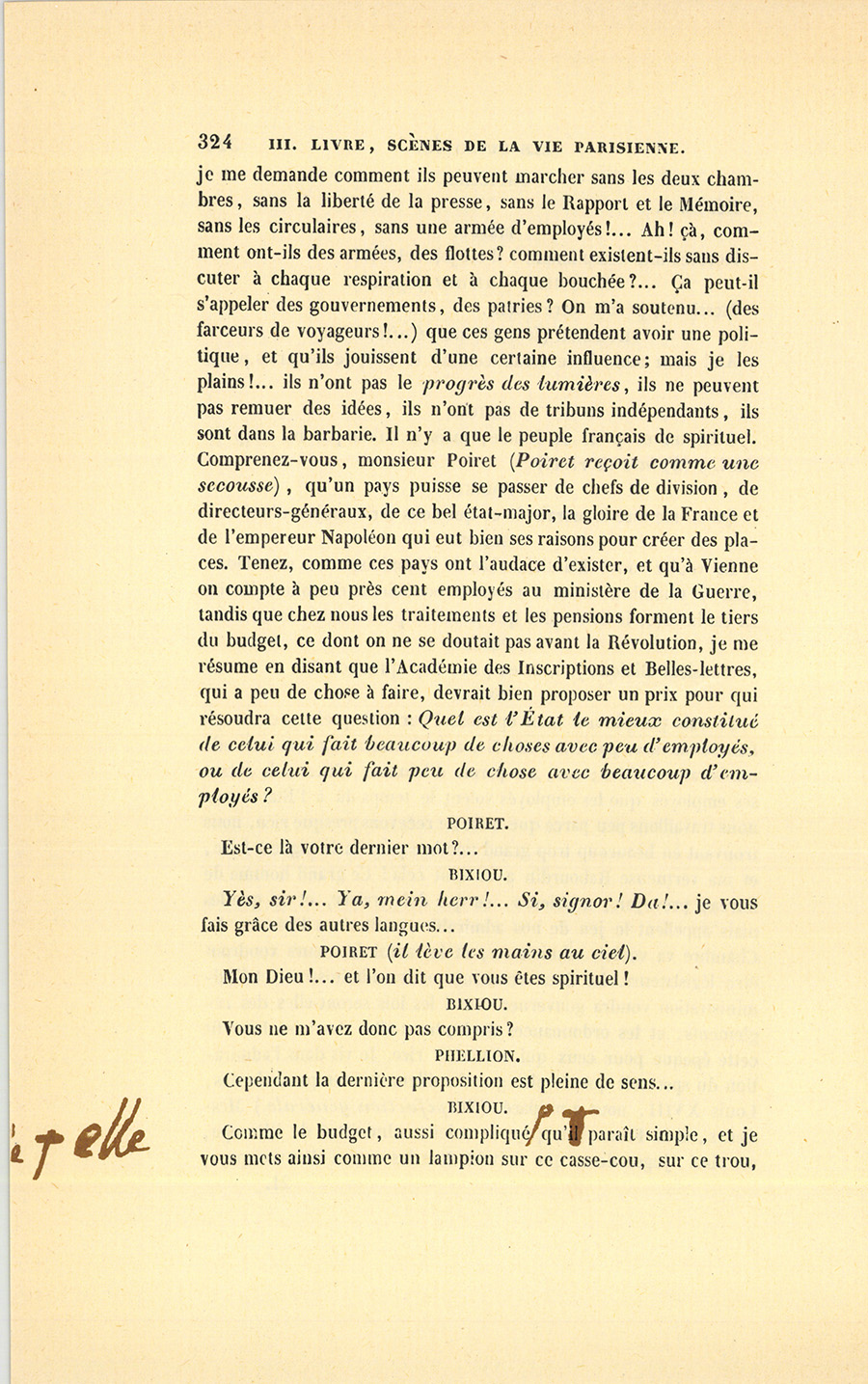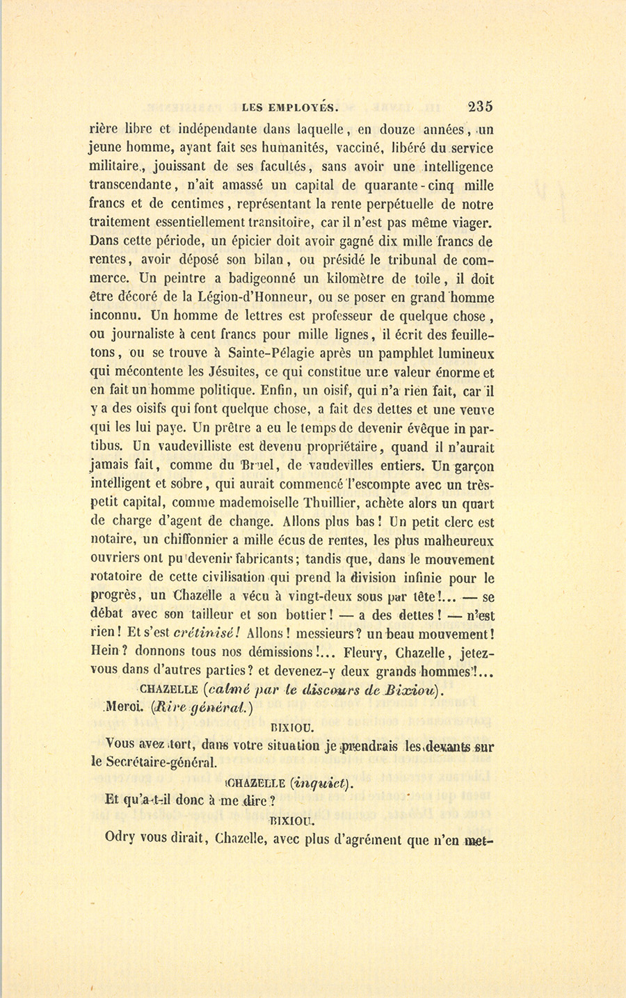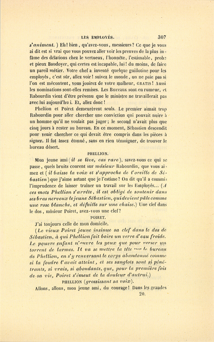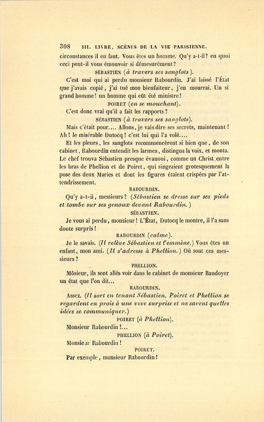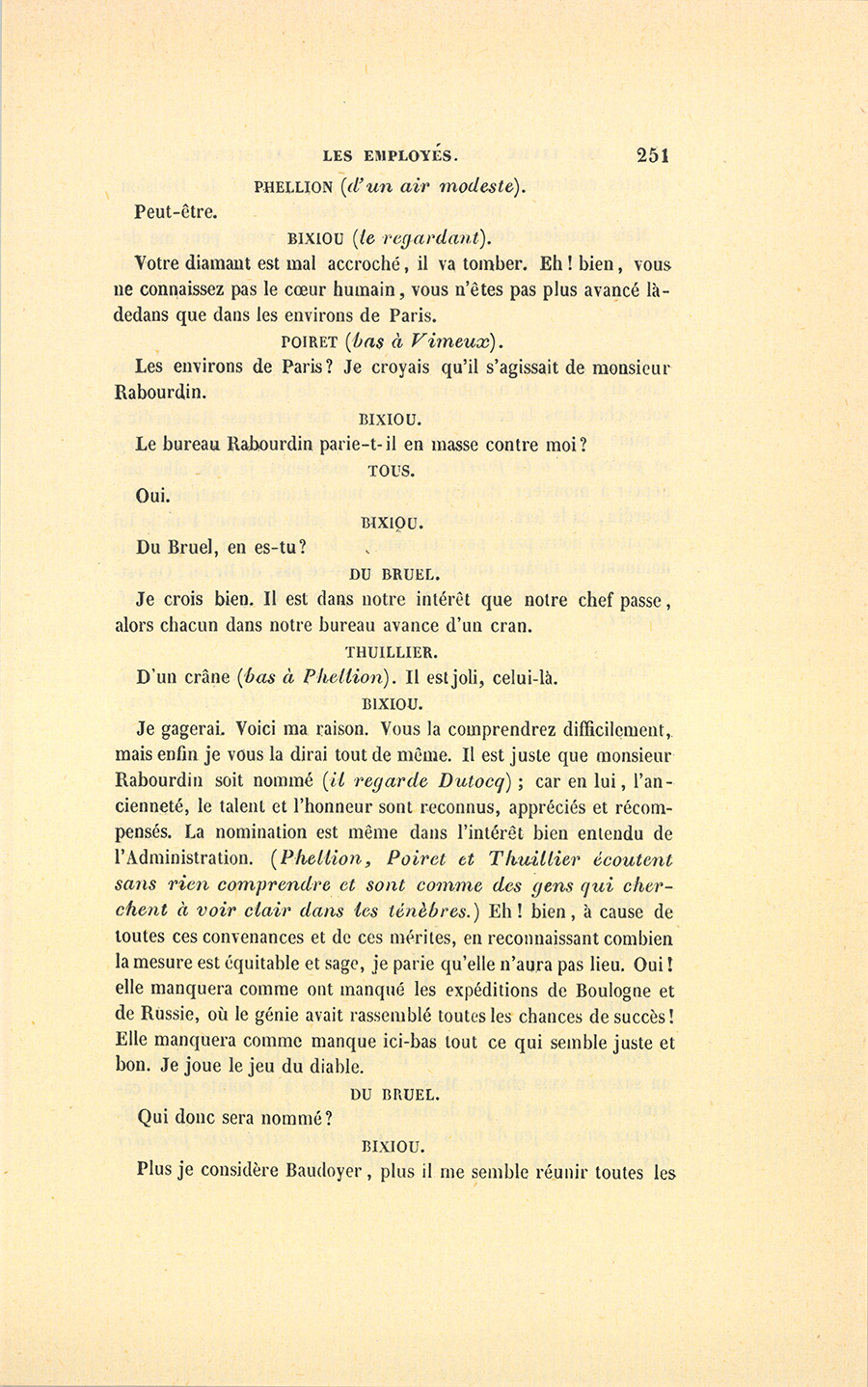 Vieillard ! vous vous trompez. J’ai voulu graver dans votre cerveau la plus vivante image possible du Gouvernement constitutionnel (tous les employés regardent Bixiou, Poiret stupéfait le contemple dans une sorte d’inquiétude) et vous tenir ainsi ma parole. J’ai pris la manière parabolique des Sauvages. (Écoutez !) Pendant que les ministres établissent à la Chambre des colloques à peu près aussi concluants, aussi utiles que le nôtre, l’Administration coupe des boutons aux contribuables.