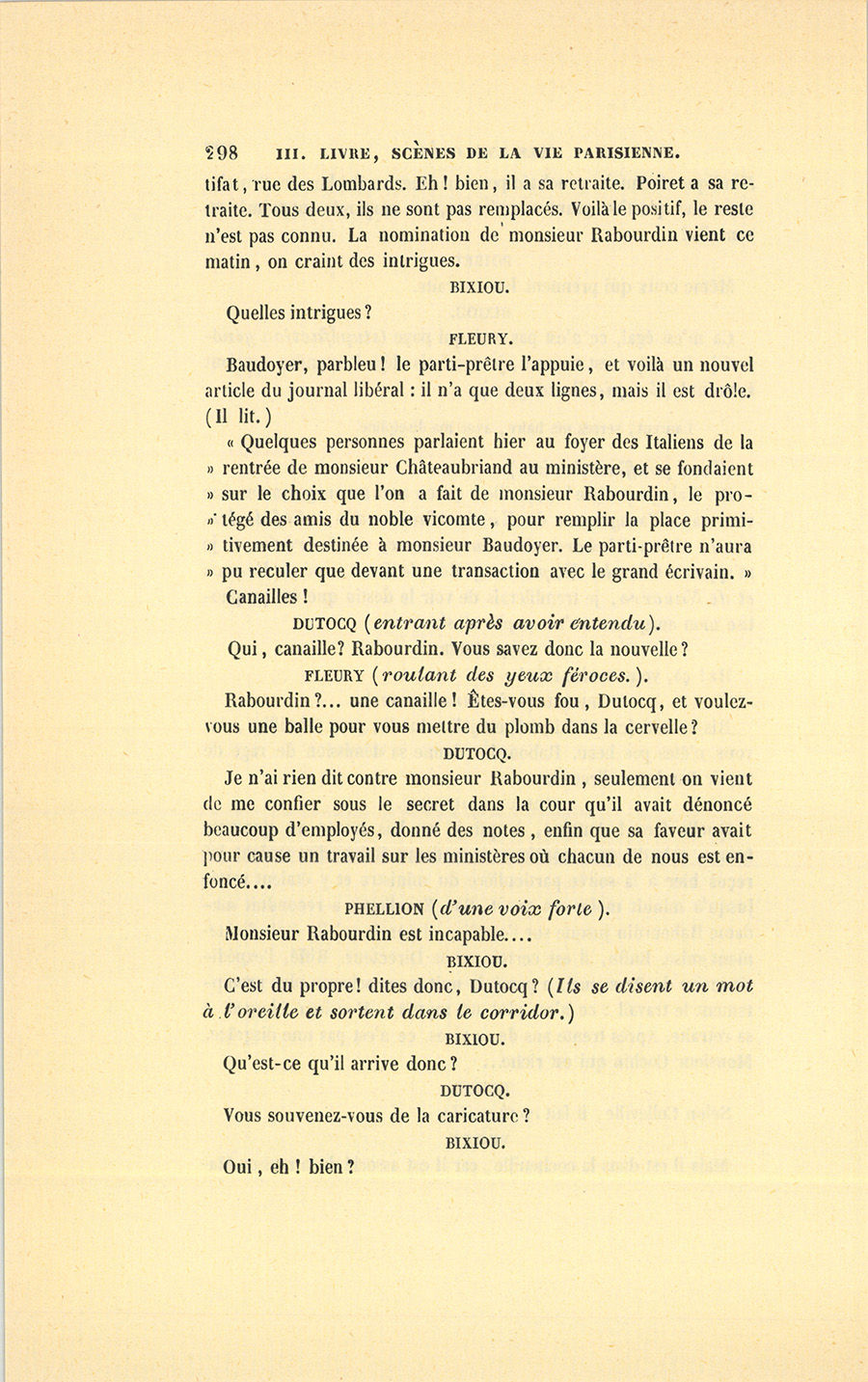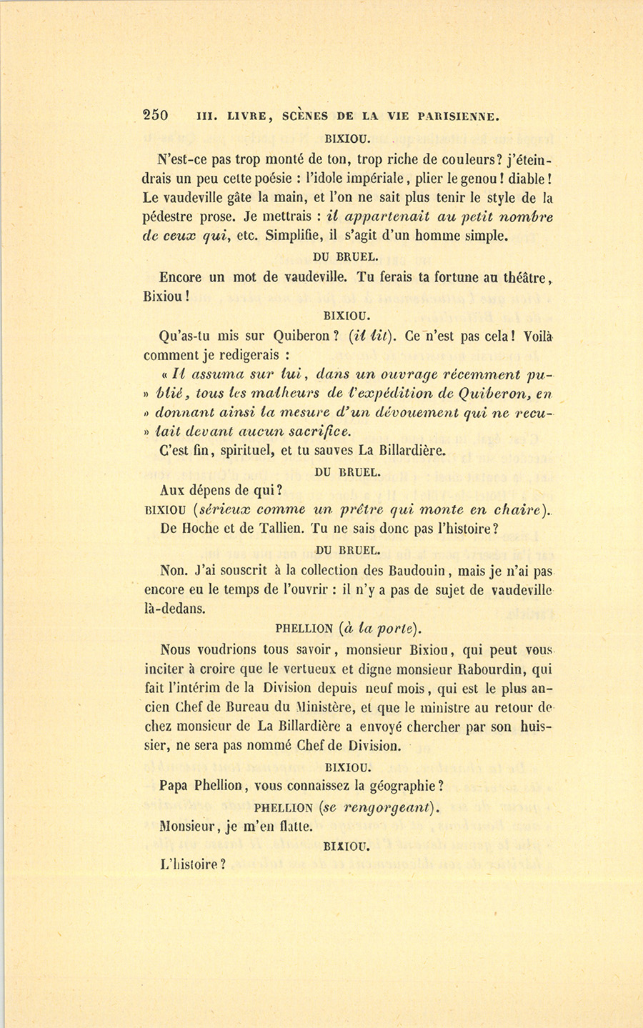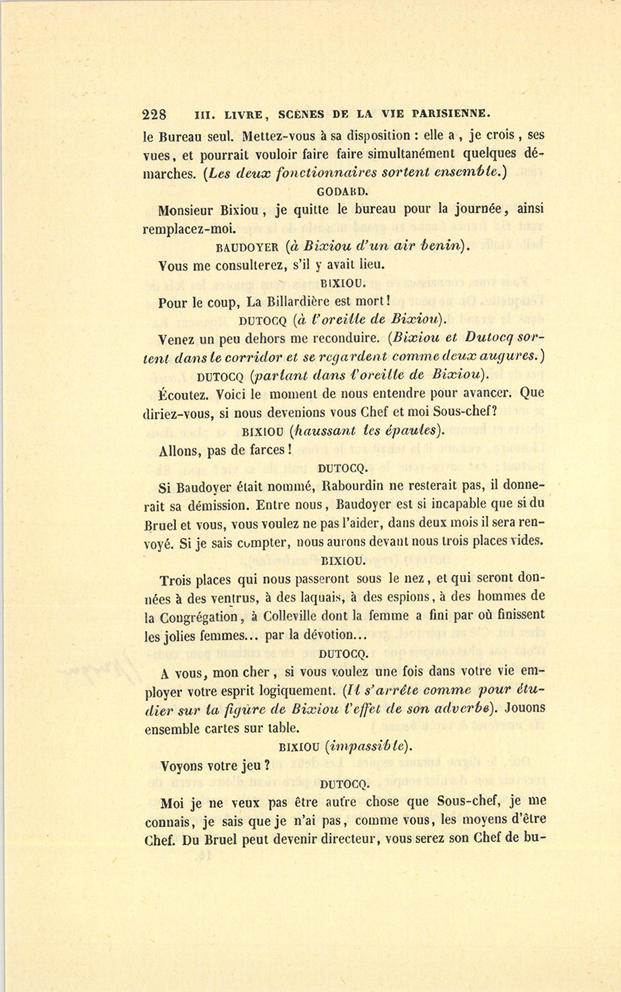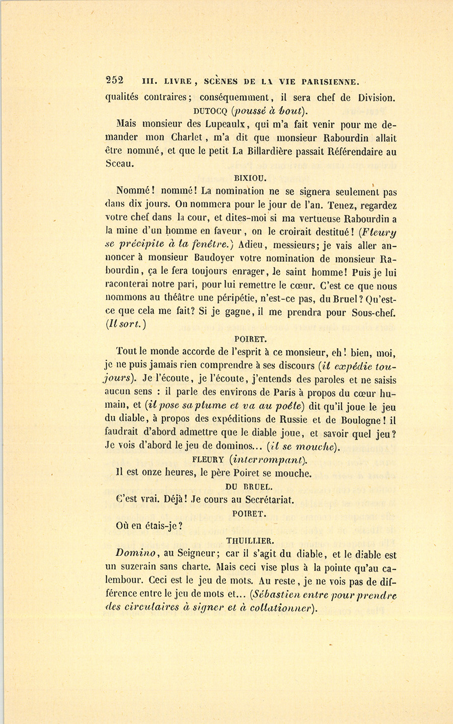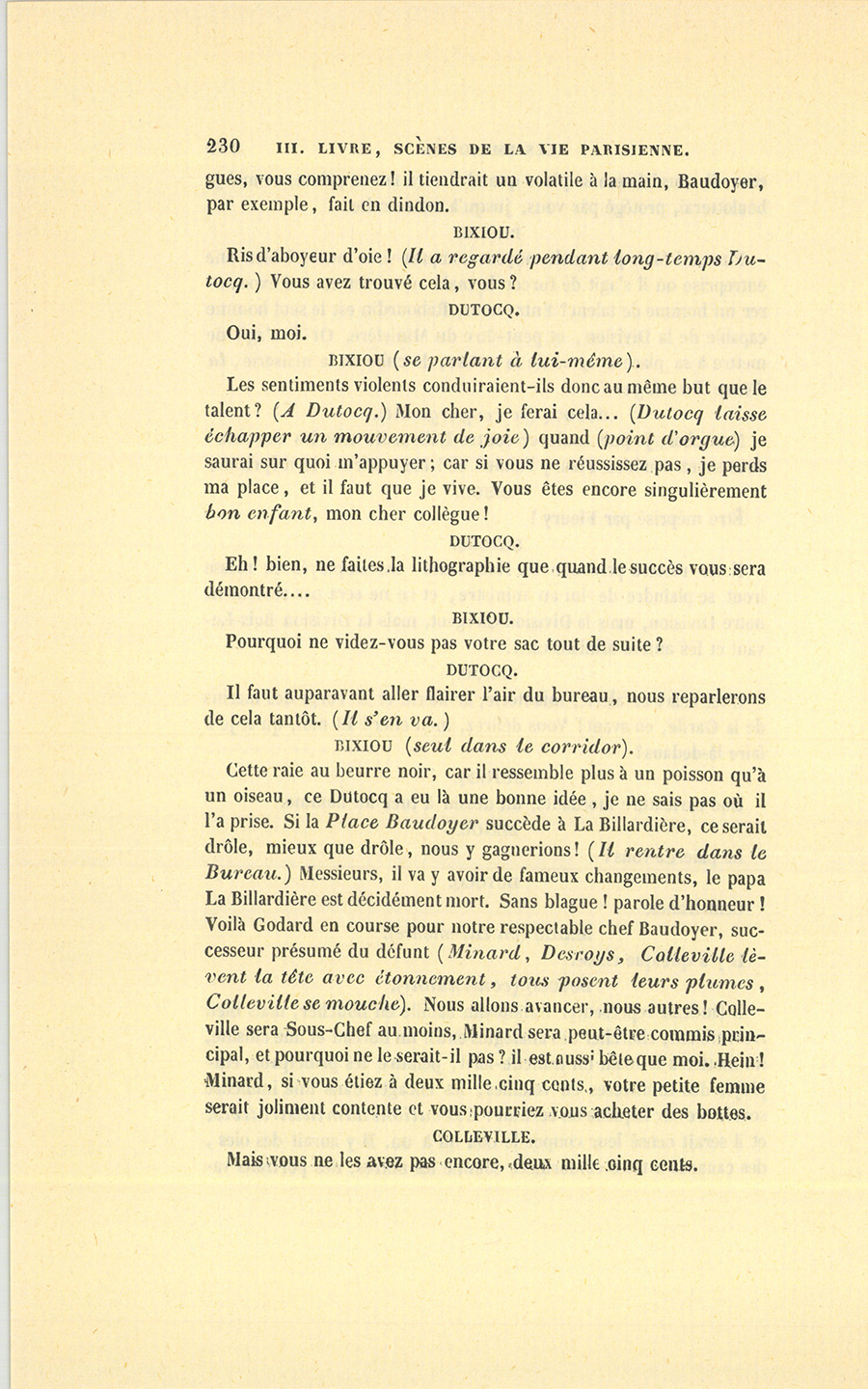 Vieillard ! vous vous trompez. J’ai voulu graver dans votre cerveau la plus vivante image possible du Gouvernement constitutionnel (tous les employés regardent Bixiou, Poiret stupéfait le contemple dans une sorte d’inquiétude) et vous tenir ainsi ma parole. J’ai pris la manière parabolique des Sauvages. (Écoutez !) Pendant que les ministres établissent à la Chambre des colloques à peu près aussi concluants, aussi utiles que le nôtre, l’Administration coupe des boutons aux contribuables.