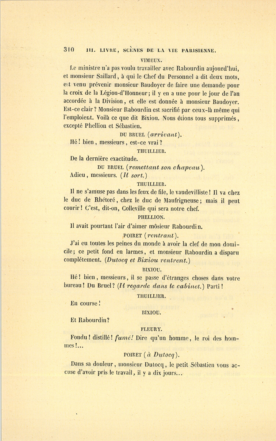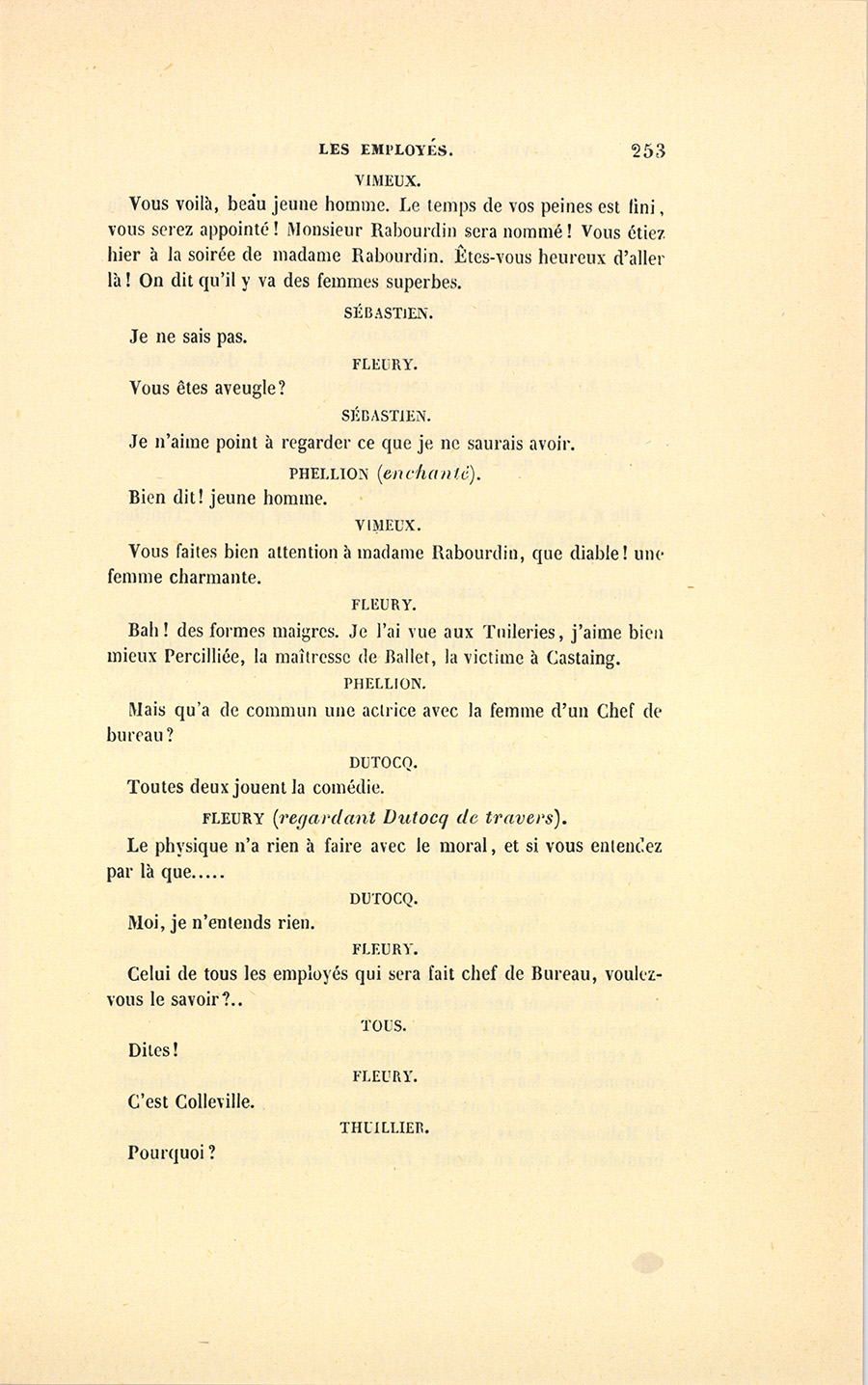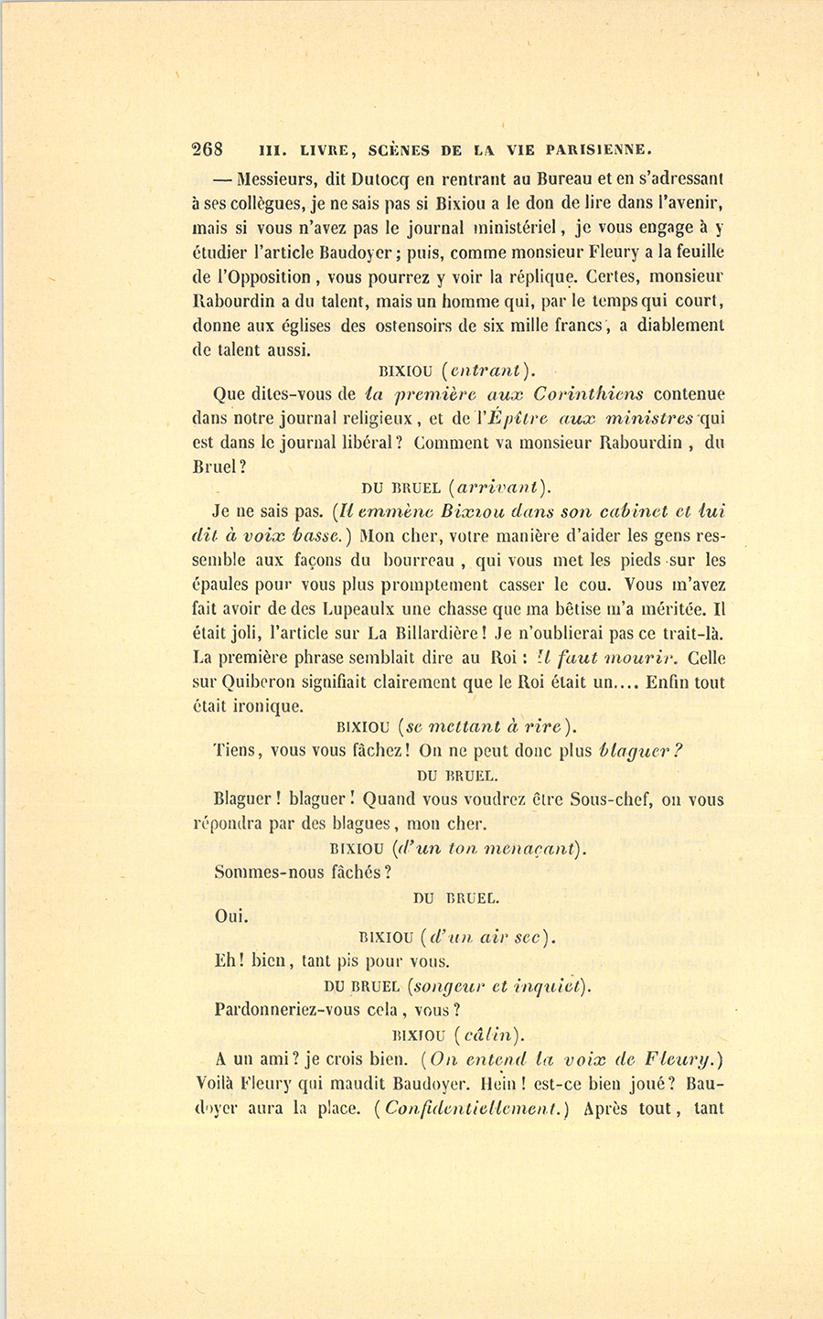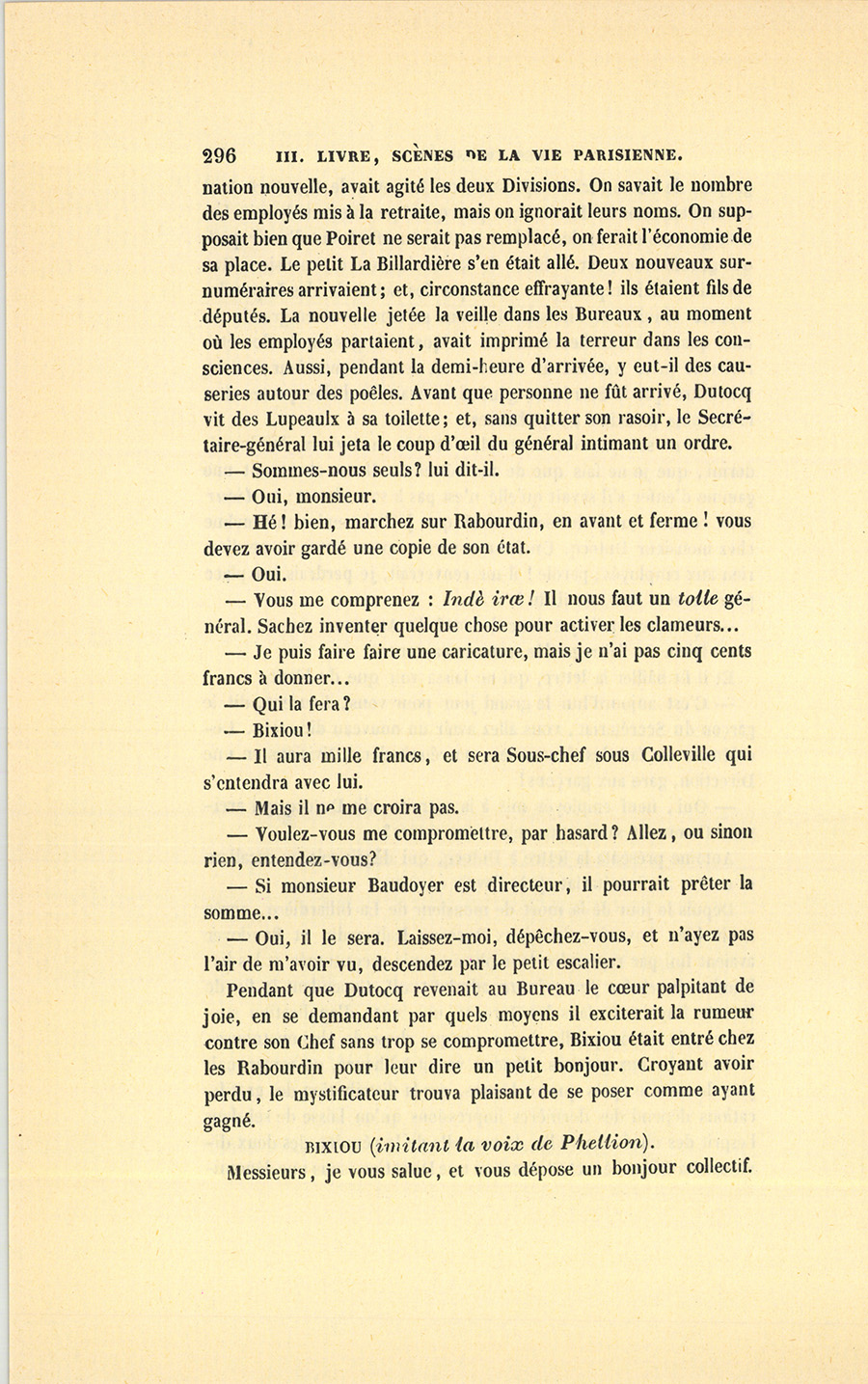 Vieillard ! vous vous trompez. J’ai voulu graver dans votre cerveau la plus vivante image possible du Gouvernement constitutionnel (tous les employés regardent Bixiou, Poiret stupéfait le contemple dans une sorte d’inquiétude) et vous tenir ainsi ma parole. J’ai pris la manière parabolique des Sauvages. (Écoutez !) Pendant que les ministres établissent à la Chambre des colloques à peu près aussi concluants, aussi utiles que le nôtre, l’Administration coupe des boutons aux contribuables.