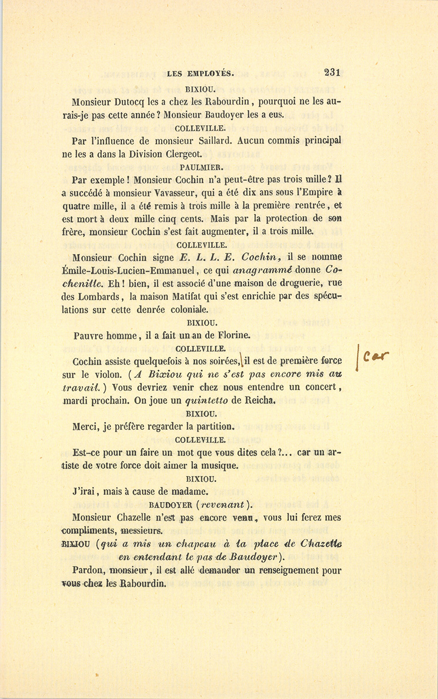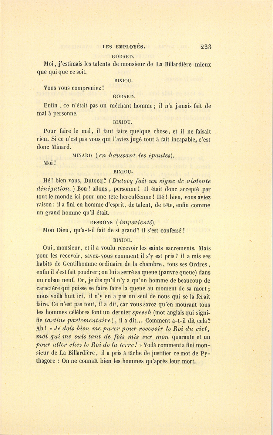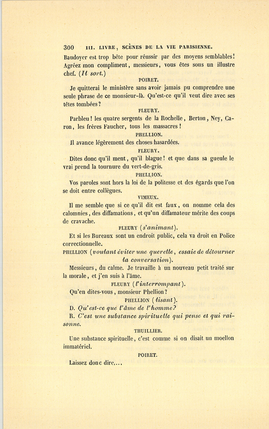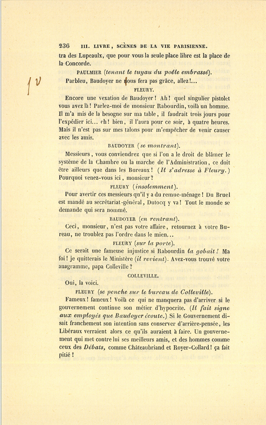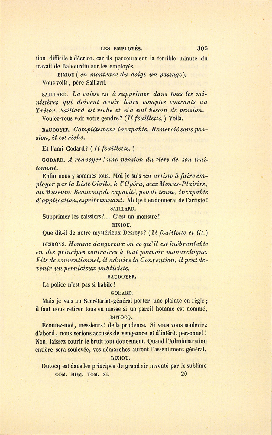 Vieillard ! vous vous trompez. J’ai voulu graver dans votre cerveau la plus vivante image possible du Gouvernement constitutionnel (tous les employés regardent Bixiou, Poiret stupéfait le contemple dans une sorte d’inquiétude) et vous tenir ainsi ma parole. J’ai pris la manière parabolique des Sauvages. (Écoutez !) Pendant que les ministres établissent à la Chambre des colloques à peu près aussi concluants, aussi utiles que le nôtre, l’Administration coupe des boutons aux contribuables.