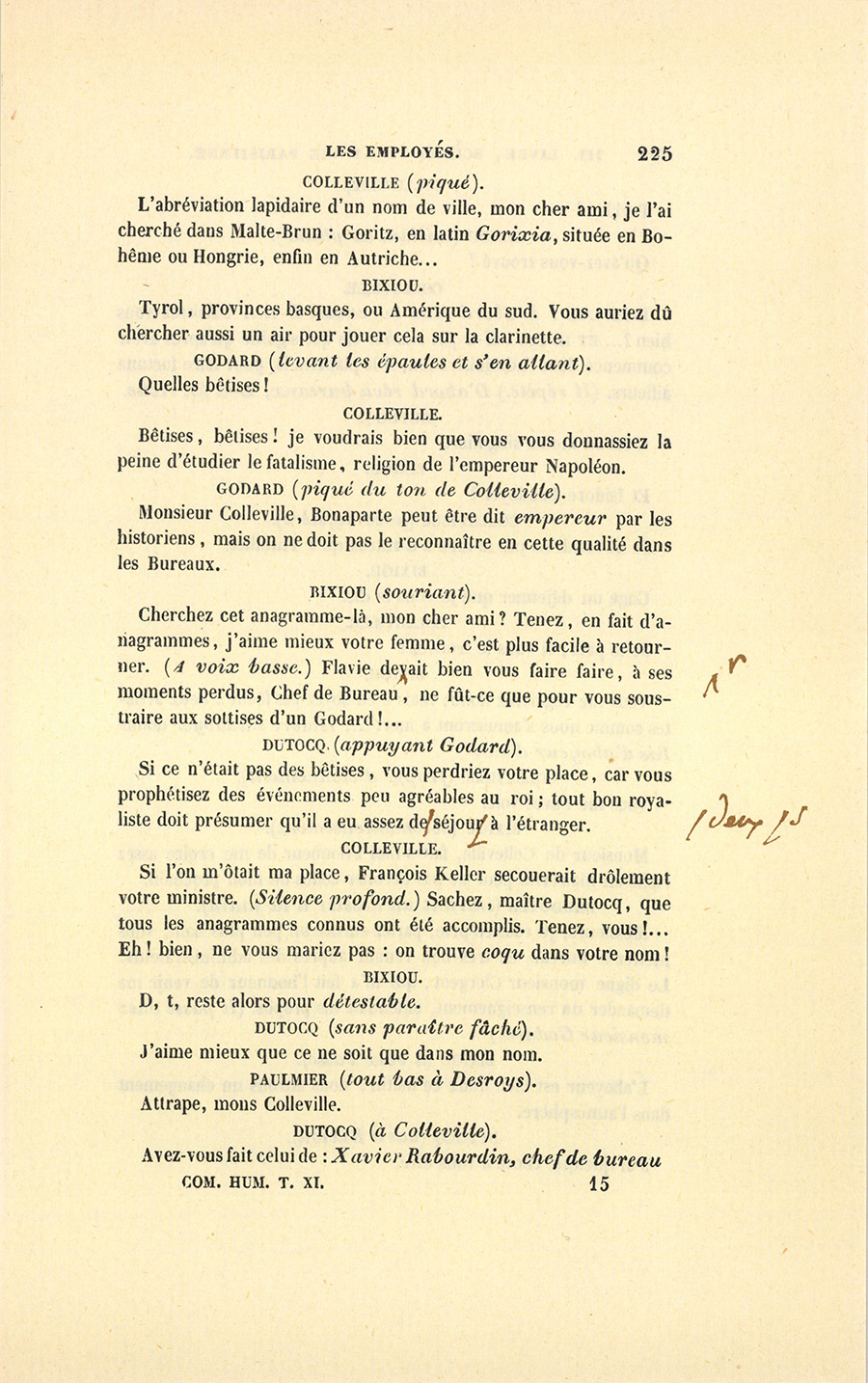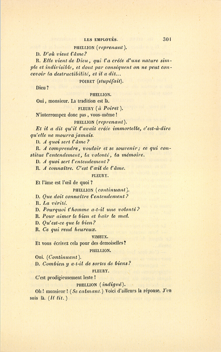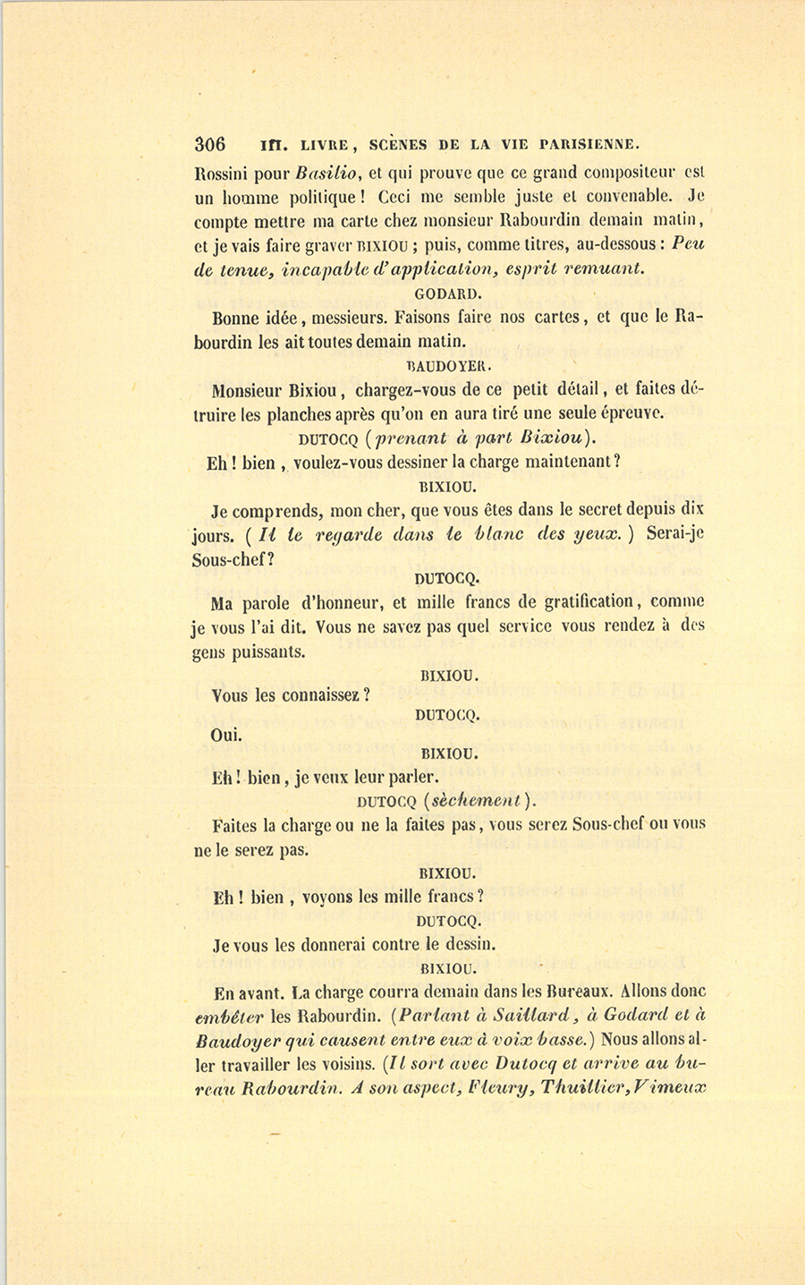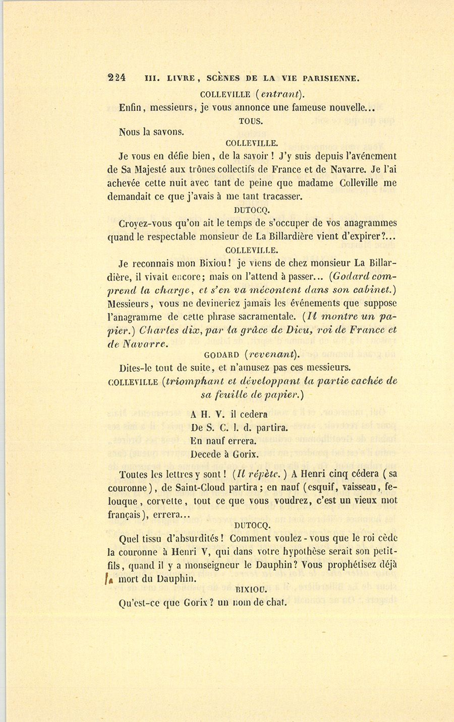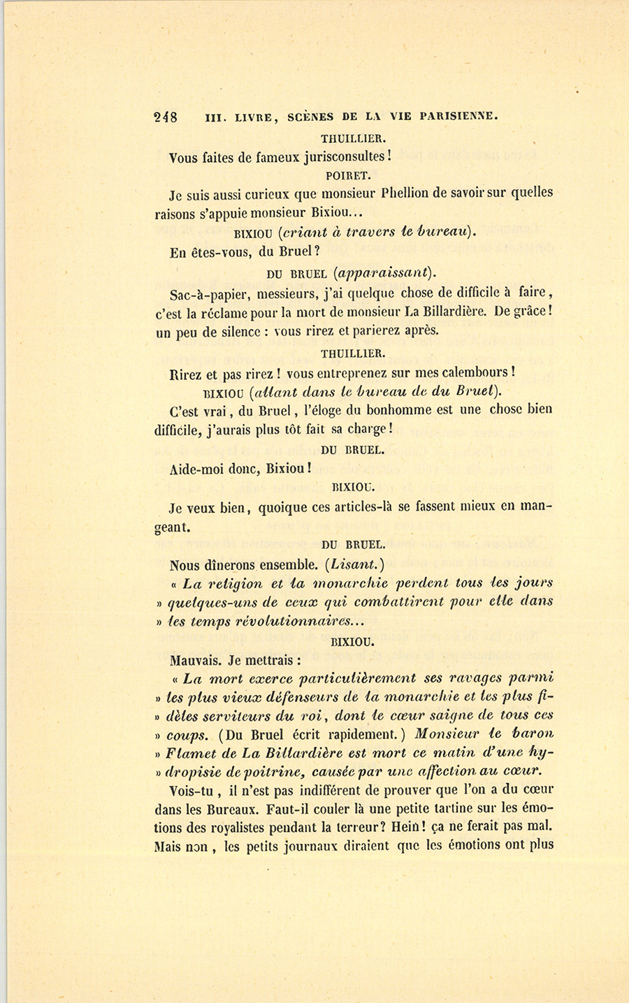 Vieillard ! vous vous trompez. J’ai voulu graver dans votre cerveau la plus vivante image possible du Gouvernement constitutionnel (tous les employés regardent Bixiou, Poiret stupéfait le contemple dans une sorte d’inquiétude) et vous tenir ainsi ma parole. J’ai pris la manière parabolique des Sauvages. (Écoutez !) Pendant que les ministres établissent à la Chambre des colloques à peu près aussi concluants, aussi utiles que le nôtre, l’Administration coupe des boutons aux contribuables.