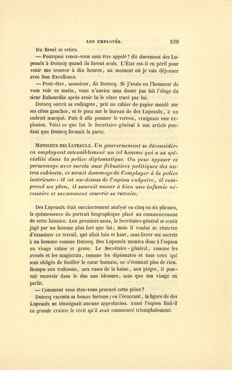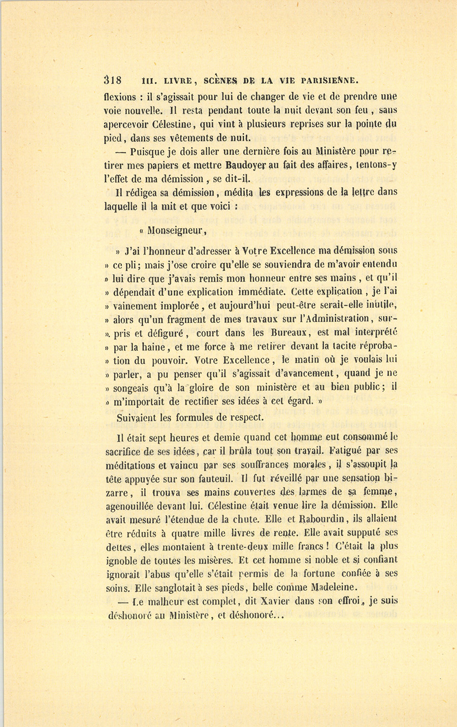 Il a tout brûlé, vous l’avez laissé déshonorer, il quitte l’Administration. Ne croyez pas, monseigneur, qu’il ait eu la sotte pensée, comme des Lupeaulx veut le faire croire, de rien changer à l’admirable centralisation du pouvoir.