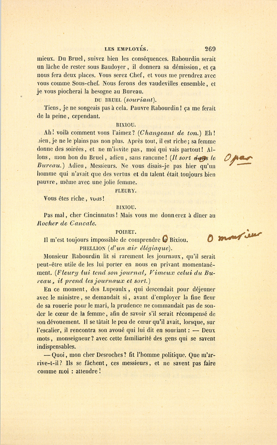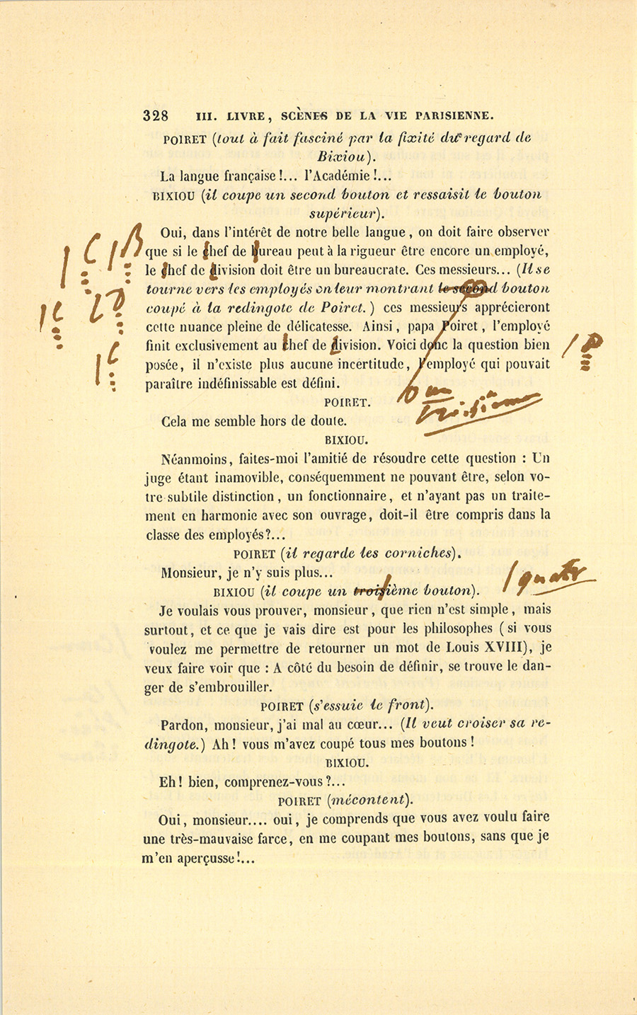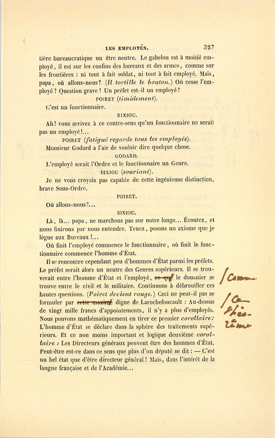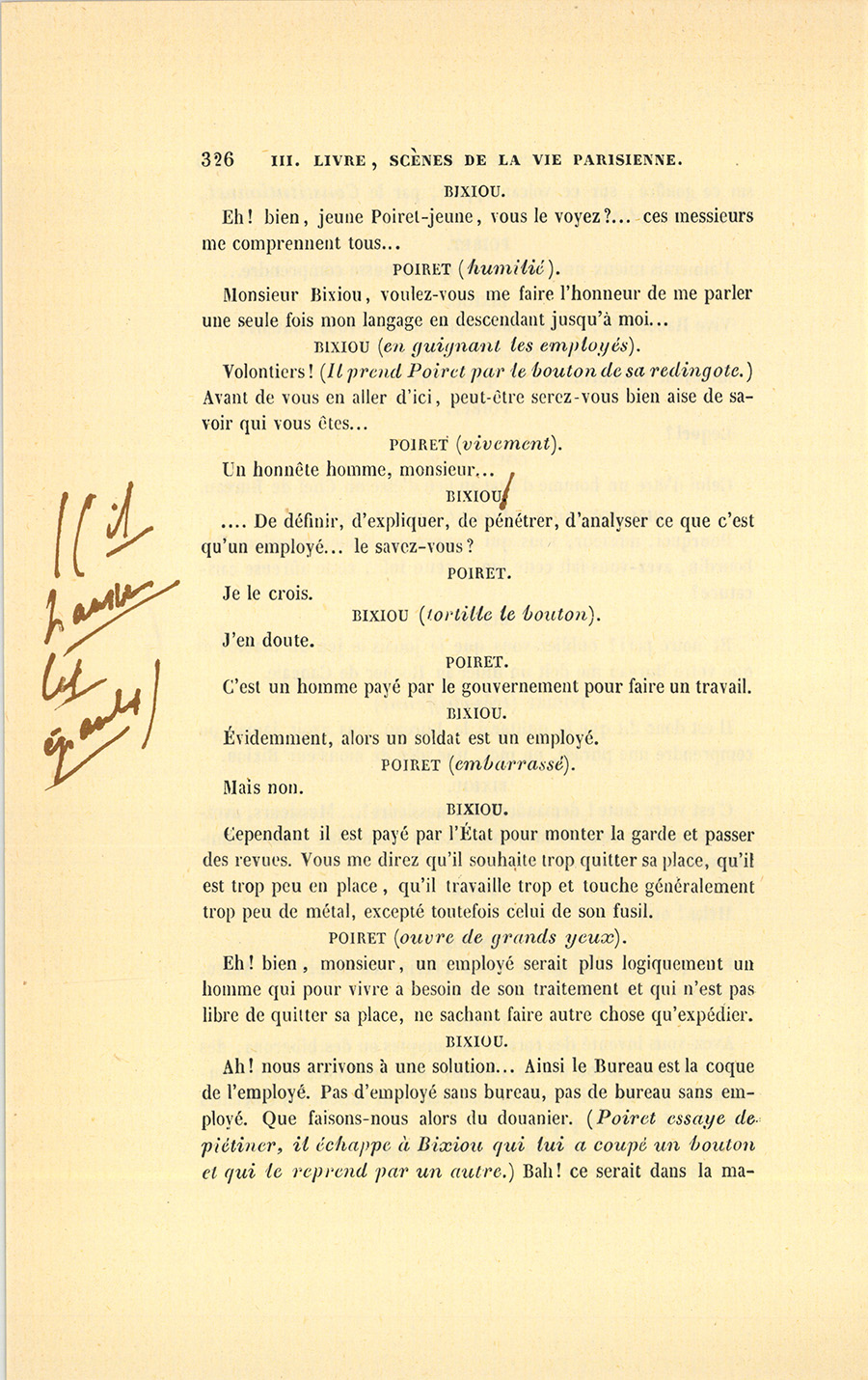 Ah ! nous arrivons à une solution… Ainsi le Bureau est la coque de l’employé. Pas d’employé sans bureau, pas de bureau sans employé. Que faisons-nous alors du douanier. (Poiret essaye de piétiner, il échappe à Bixiou qui lui a coupé un bouton et qui le reprend par un autre.) Bah ! ce serait dans la {p. 327} matière bureaucratique un être neutre. Le gabelou est à moitié employé, il est sur les confins des bureaux et des armes, comme sur les frontières : ni tout à fait soldat, ni tout à fait employé. Mais, papa, où allons-nous ? (Il tortille le bouton.) Où cesse l’employé ? Question grave ! Un préfet est-il un employé ?