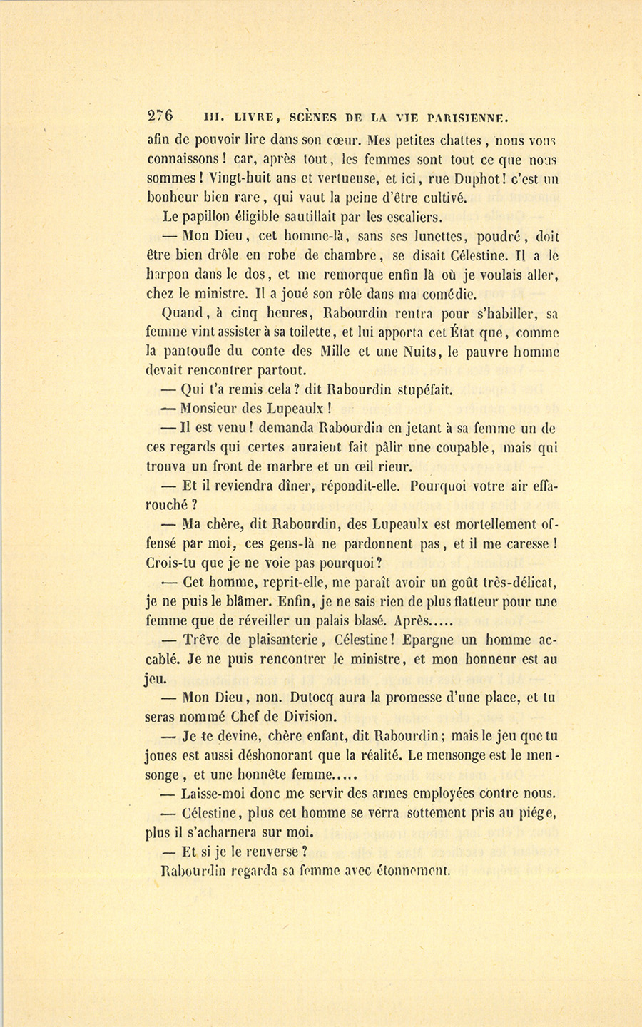 – Si la place de La Billardière est acquise à Rabourdin, je puis être cru quand je vante la supériorité de sa femme, répliqua des Lupeaulx en sentant l’ironie du ministre ; mais si madame la comtesse veut en juger par elle-même…