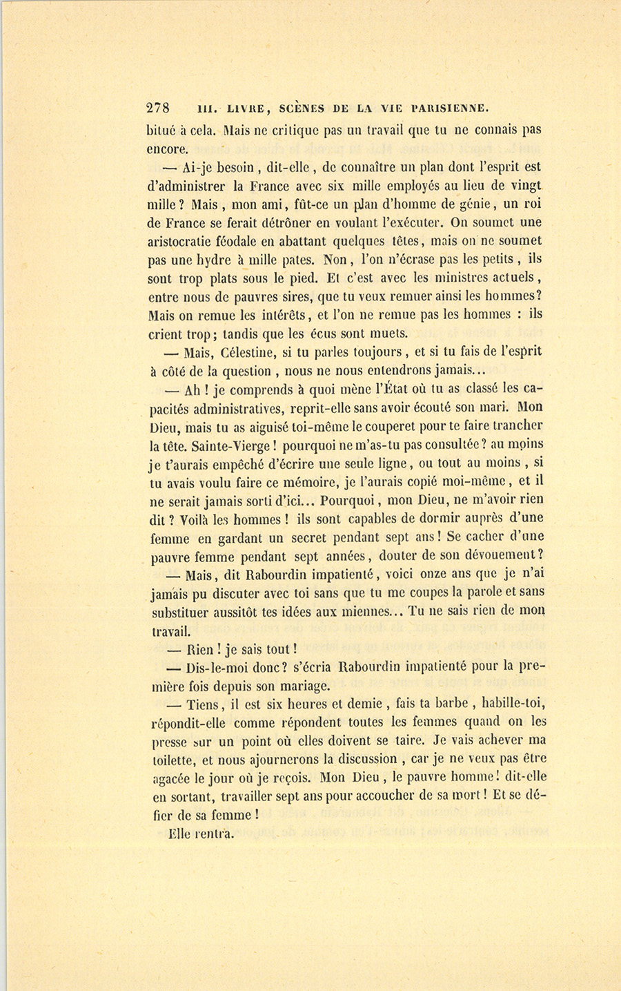 Quand les rois eurent des ministres, ce qui n’a commencé que sous Louis XV, ils se firent faire des rapports sur les questions importantes, au lieu de tenir, comme autrefois, conseil avec les grands {p. 143} de l’État. Insensiblement, les ministres furent amenés par leurs Bureaux à imiter les rois. Occupés de se défendre devant les deux Chambres et devant la Cour, ils se laissèrent mener par les lisières du rapport. Il ne se présenta rien d’important dans l’administration, que le ministre, à la chose la plus urgente, ne répondît : – J’ai demandé un rapport. Le rapport devint ainsi, pour l’affaire et pour le ministre, ce qu’est le rapport à la Chambre des Députés pour les lois : une consultation où sont traitées les raisons contre et pour avec plus ou moins de partialité. Le ministre, de même que la Chambre, se trouve tout aussi avancé avant qu’après le rapport. Toute espèce de parti se prend en un instant. Quoi qu’on fasse, il faut arriver au moment où l’on se décide. Plus on met en bataille de raisons pour et de raisons contre, moins le jugement est sain. Les plus belles choses de la France se sont accomplies quand il n’existait pas de rapport et que les décisions étaient spontanées. La loi suprême de l’homme d’état est d’appliquer des formules précises à tous les cas, à la manière des juges et des médecins. Rabourdin, qui se disait : – « On est ministre pour avoir de la décision, connaître les affaires et les faire marcher », vit le rapport régnant en France depuis le colonel jusqu’au maréchal, depuis le commissaire de police jusqu’au roi, depuis les préfets jusqu’aux ministres, depuis la Chambre jusqu’à la loi. Dès 1818, tout commençait à se discuter, se balancer et se contre-balancer de vive voix et par écrit, tout prenait la forme littéraire. La France allait se ruiner malgré de si beaux rapports, et disserter au lieu d’agir. Il se faisait alors en France un million de rapports écrits par année ! Aussi la bureaucratie régnait-elle ! Les dossiers, les cartons, les paperasses à l’appui des pièces sans lesquelles la France serait perdue, la circulaire sans laquelle elle n’irait pas, s’accrurent et embellirent. La bureaucratie entretint dès lors à son profit la méfiance entre la recette et la dépense, elle calomnia l’administration pour le salut de l’administrateur. Enfin elle inventa les fils lilliputiens qui enchaînent la France à la centralisation parisienne, comme si, de 1500 à 1800, la France n’avait rien pu entreprendre sans trente mille commis. En s’attachant à la chose publique, comme le guy au poirier, l’employé s’en désintéressa complétement, et voici comme.