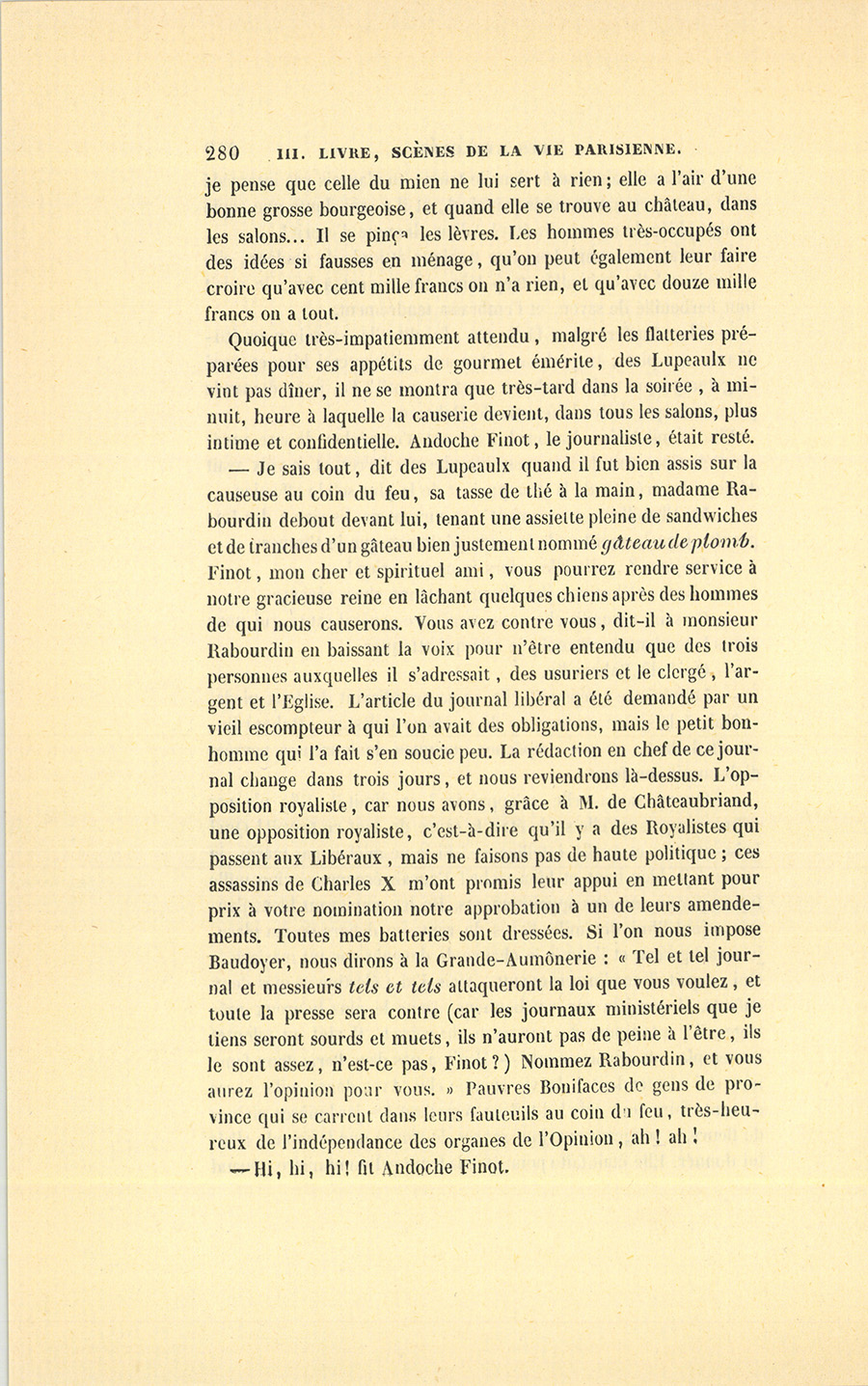 – Dites que le projet de loi ne vaut rien, et démontrez-le si vous pouvez ; mais ne dites pas que Mariette a mal dansé. Calomniez notre affection pour nos proches en jupons, mais ne révélez pas nos farces de jeune homme. Diantre ! nous avons tous fait nos vaudevilles, et nous ne savons pas ce que nous pouvons devenir par le temps qui court. Vous serez peut-être ministre, vous qui salez aujourd’hui les tartines du Constitutionnel.