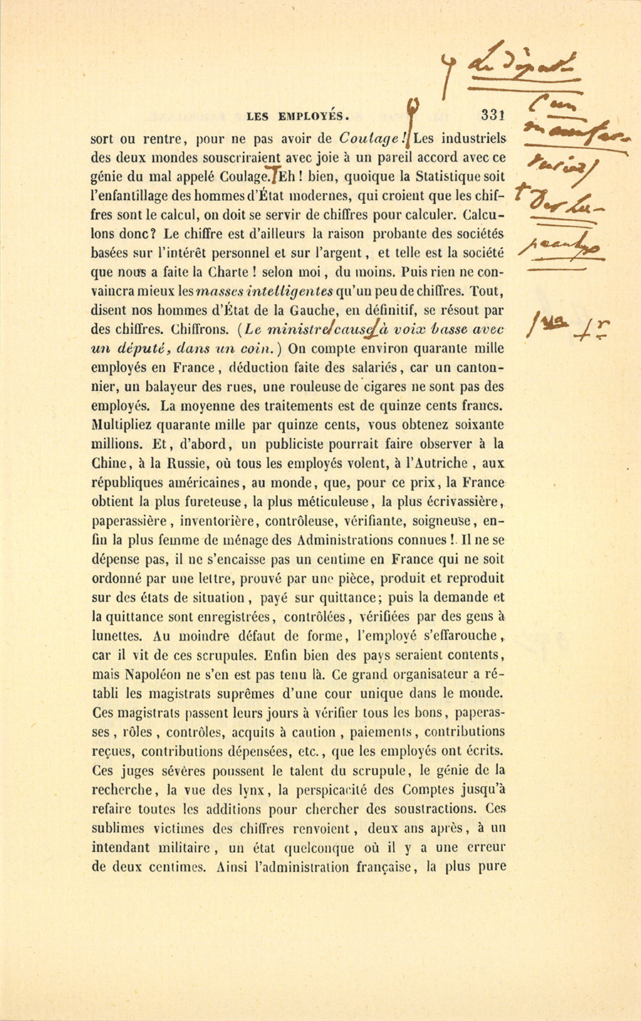Eh ! bien, quoique la Statistique soit l’enfantillage des hommes d’État modernes, qui croient que les chiffres sont le calcul, on doit se servir de chiffres pour calculer. Calculons donc ? Le chiffre est d’ailleurs la raison probante des sociétés basées sur l’intérêt personnel et sur l’argent, et telle est la société que nous a faite la Charte ! selon moi, du moins. Puis rien ne convaincra mieux les masses intelligentes qu’un peu de chiffres. Tout, disent nos hommes d’État de la Gauche, en définitif, se résout par des chiffres. Chiffrons. (Le ministre va causer à voix basse avec un député, dans un coin.) On compte environ quarante mille employés en France, déduction faite des salariés, car un cantonnier, un balayeur des rues, une rouleuse de cigares ne sont pas des employés. La moyenne des traitements est de quinze cents francs. Multipliez quarante mille par quinze cents, vous obtenez soixante millions. Et, d’abord, un publiciste pourrait faire observer à la Chine, à la Russie, où tous les employés volent, à l’Autriche, aux républiques américaines, au monde, que, pour ce prix, la France obtient la plus fureteuse, la plus méticuleuse, la plus écrivassière, paperassière, inventorière, contrôleuse, vérifiante, soigneuse, enfin la plus femme de ménage des Administrations connues ! Il ne se dépense pas, il ne s’encaisse pas un centime en France qui ne soit ordonné par une lettre, prouvé par une pièce, produit et reproduit sur des états de situation, payé sur quittance ; puis la demande et la quittance sont enregistrées, contrôlées, vérifiées par des gens à lunettes. Au moindre défaut de forme, l’employé s’effarouche, car il vit de ces scrupules. Enfin bien des pays seraient contents, mais Napoléon ne s’en est pas tenu là. Ce grand organisateur a rétabli les magistrats suprêmes d’une cour unique dans le monde. Ces magistrats passent leurs jours à vérifier tous les bons, paperasses, rôles, contrôles, acquits à caution, paiements, contributions reçues, contributions dépensées, etc., que les employés ont écrits. Ces juges sévères poussent le talent du scrupule, le génie de la recherche, la vue des lynx, la perspicacité des Comptes jusqu’à refaire toutes les additions pour chercher des soustractions. Ces sublimes victimes des chiffres renvoient, deux ans après, à un intendant militaire, un état quelconque où il y a une erreur de deux centimes. Ainsi l’administration française, la plus pure {p. 332} de toutes celles qui paperassent sur le globe, a rendu, comme vient de le dire Son Excellence, le vol impossible. En France, la concussion est une chimère. Eh ! bien, que peut-on objecter ? La France possède un revenu de douze cents millions, elle le dépense, voilà tout. Il entre douze cents millions dans ses caisses, et douze cents millions en sortent. Elle manie donc deux milliards quatre cents millions, et ne paie que soixante millions, deux et demi pour cent, pour avoir la certitude qu’il n’existe pas de coulage. Notre livre de cuisine politique coûte soixante millions, mais la gendarmerie, les tribunaux, les bagnes et la police coûtent autant et ne nous font rien rendre. Et nous trouvons l’emploi de gens qui ne peuvent pas faire autre chose que ce qu’ils font, croyez-le bien. Le gaspillage, s’il y en a, ne peut plus être que moral et législatif, les Chambres en sont alors les complices, le gaspillage devient légal. Le coulage consiste à faire faire des travaux qui ne sont pas urgents ou nécessaires, à dégalonner et regalonner les troupes, à commander des vaisseaux sans s’inquiéter s’il y a du bois et de payer alors le bois trop cher, à se préparer à la guerre sans la faire, à payer les dettes d’un État sans lui en demander le remboursement ou des garanties, etc., etc.