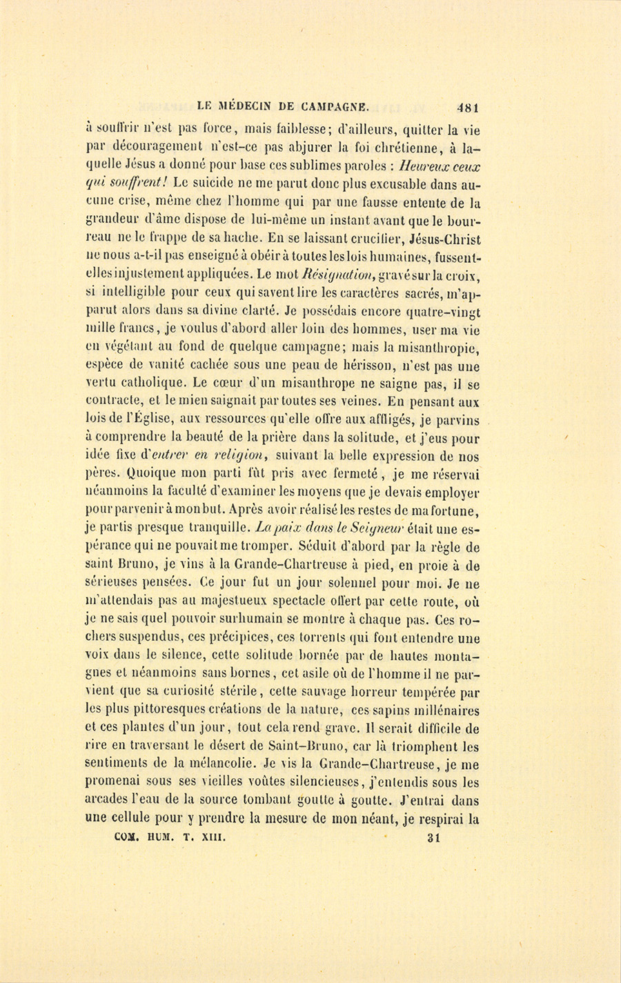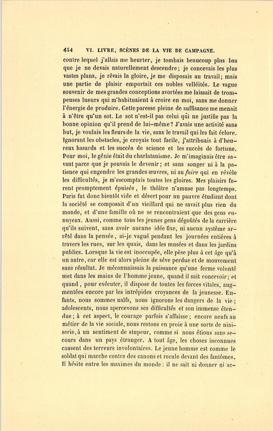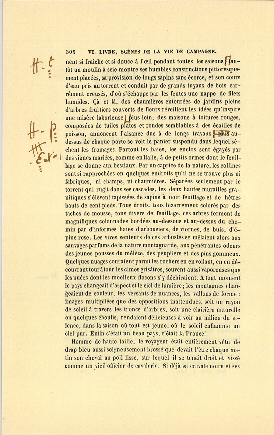 En 1829, par une jolie matinée de printemps, un homme âgé d’environ cinquante ans suivait à cheval un chemin montagneux qui mène à un gros bourg situé près de la Grande-Chartreuse. Ce bourg est le chef-lieu d’un canton populeux circonscrit par une longue vallée. Un torrent à lit pierreux souvent à sec, alors rempli par la fonte des neiges, arrose cette vallée serrée entre deux montagnes parallèles, que dominent de toutes parts les pics de la Savoie et ceux du Dauphiné. Quoique les paysages compris entre la chaîne des deux Mauriennes aient un air de famille, le canton à travers lequel cheminait l’étranger présente des mouvements de terrain et des accidents de lumière qu’on chercherait vainement ailleurs. Tantôt la vallée subitement élargie offre un irrégulier tapis de cette verdure que les constantes irrigations dues aux montagnes {p. 306} entretiennent si fraîche et si douce à l’œil pendant toutes les saisons. Tantôt un moulin à scie montre ses humbles constructions pittoresquement placées, sa provision de longs sapins sans écorce, et son cours d’eau pris au torrent et conduit par de grands tuyaux de bois carrément creusés, d’où s’échappe par les fentes une nappe de filets humides. Çà et là, des chaumières entourées de jardins pleins d’arbres fruitiers couverts de fleurs réveillent les idées qu’inspire une misère laborieuse. Plus loin, des maisons à toitures rouges, composées de tuiles plates et rondes semblables à des écailles de poisson, annoncent l’aisance due à de longs travaux. Enfin au-dessus de chaque porte se voit le panier suspendu dans lequel sèchent les fromages. Partout les haies, les enclos sont égayés par des vignes mariées, comme en Italie, à de petits ormes dont le feuillage se donne aux bestiaux. Par un caprice de la nature, les collines sont si rapprochées en quelques endroits qu’il ne se trouve plus ni fabriques, ni champs, ni chaumières. Séparées seulement par le torrent qui rugit dans ses cascades, les deux hautes murailles granitiques s’élèvent tapissées de sapins à noir feuillage et de hêtres hauts de cent pieds. Tous droits, tous bizarrement colorés par des taches de mousse, tous divers de feuillage, ces arbres forment de magnifiques colonnades bordées au-dessous et au-dessus du chemin par d’informes haies d’arbousiers, de viornes, de buis, d’épine rose. Les vives senteurs de ces arbustes se mêlaient alors aux sauvages parfums de la nature montagnarde, aux pénétrantes odeurs des jeunes pousses du mélèze, des peupliers et des pins gommeux. Quelques nuages couraient parmi les rochers en en voilant, en en découvrant tour à tour les cimes grisâtres, souvent aussi vaporeuses que les nuées dont les moelleux flocons s’y déchiraient. À tout moment le pays changeait d’aspect et le ciel de lumière ; les montagnes changeaient de couleur, les versants de nuances, les vallons de forme : images multipliées que des oppositions inattendues, soit un rayon de soleil à travers les troncs d’arbres, soit une clairière naturelle ou quelques éboulis, rendaient délicieuses à voir au milieu du silence, dans la saison où tout est jeune, où le soleil enflamme un ciel pur. Enfin c’était un beau pays, c’était la France !